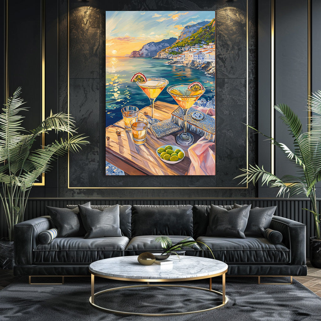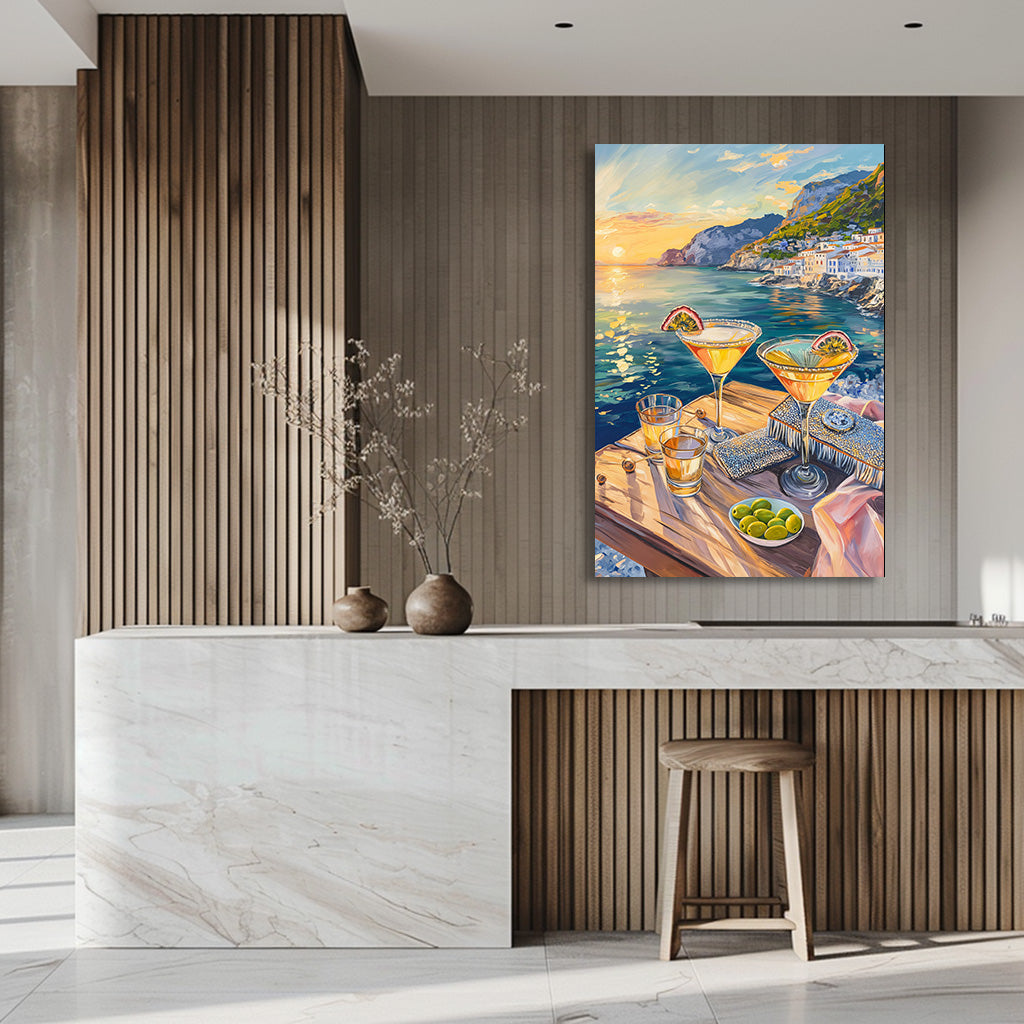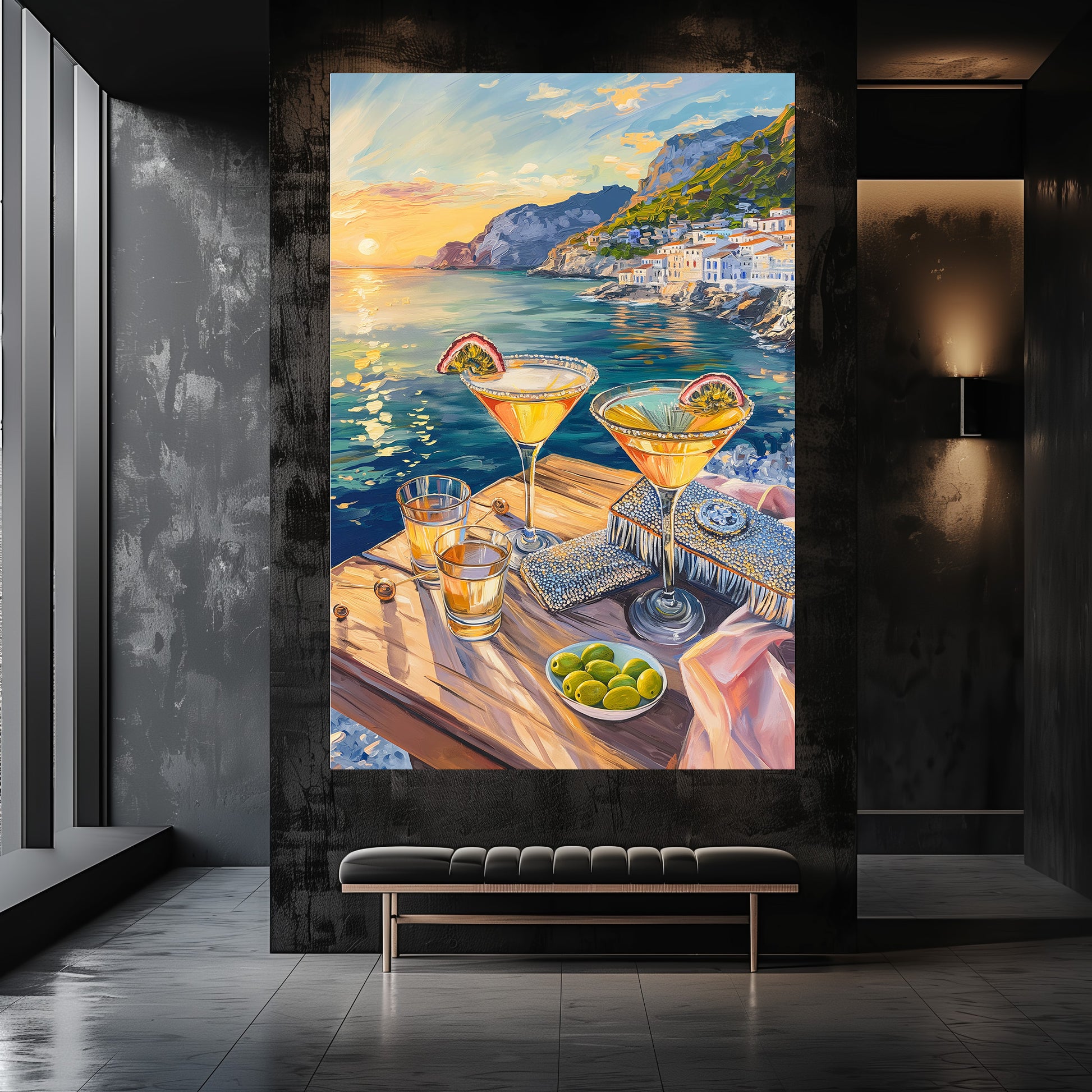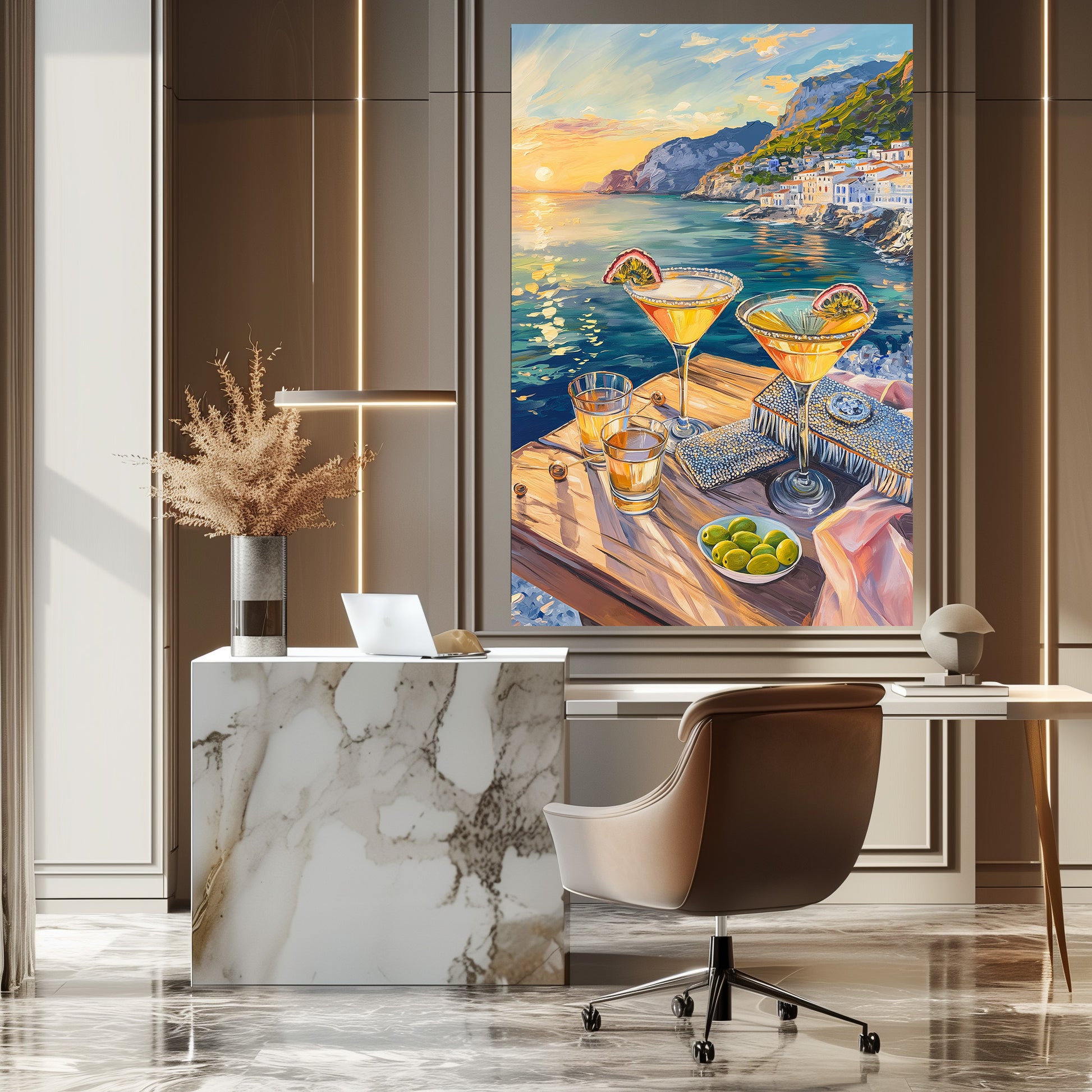 Deux cocktails élégants reposent face à la mer, avec en toile de fond les falaises et les maisons baignées de lumière de la côte amalfitaine au coucher du soleil. Cette œuvre contemporaine capture l’art de vivre méditerranéen, entre dolce vita, luxe discret et instants suspendus. Un tableau lumineux et raffiné, idéal pour apporter une touche d’évasion, de chaleur et d’élégance à votre intérieur.