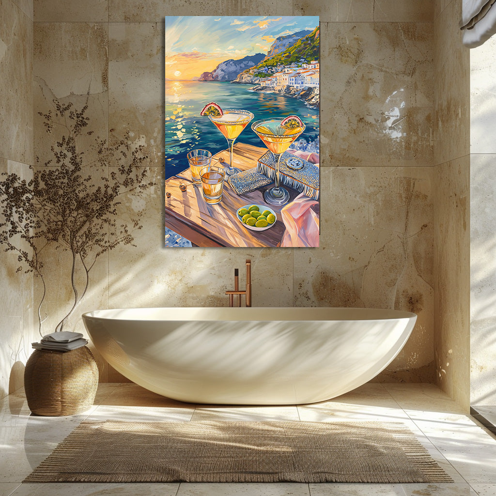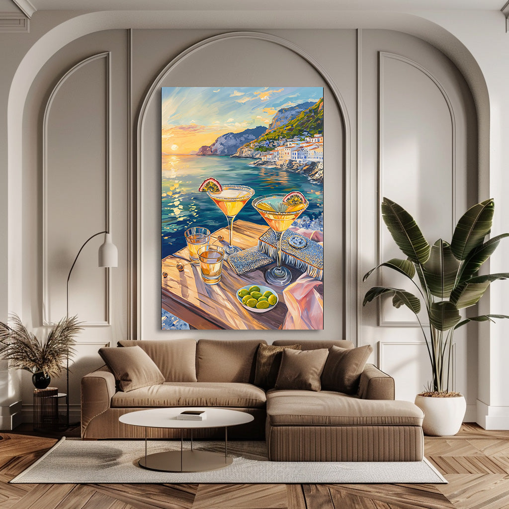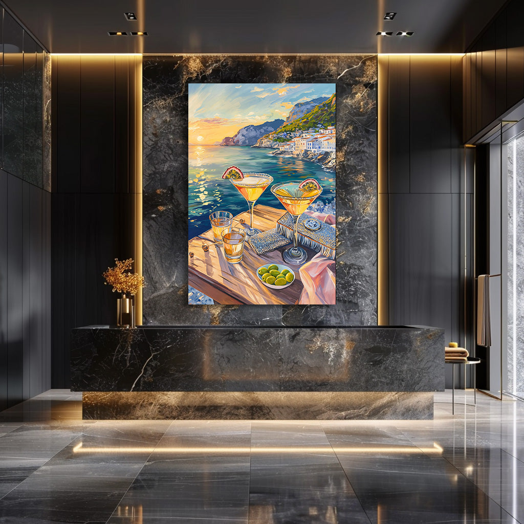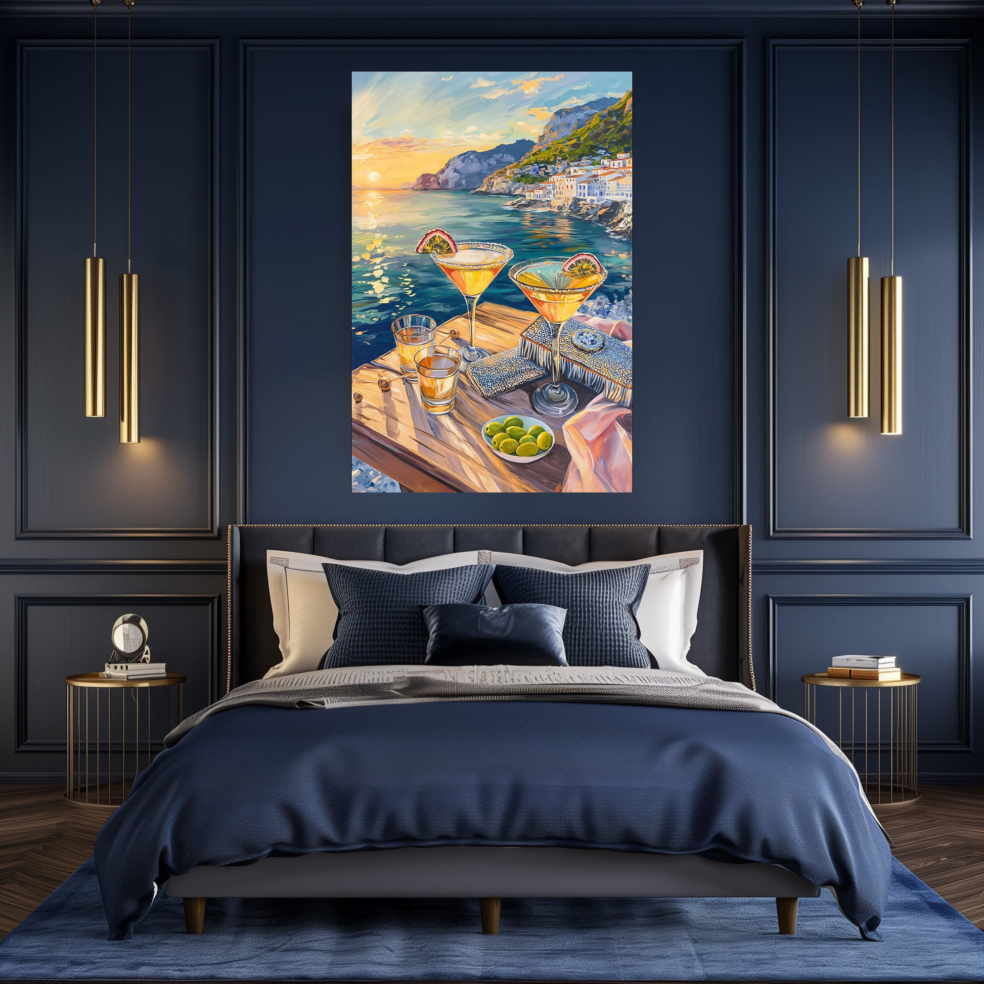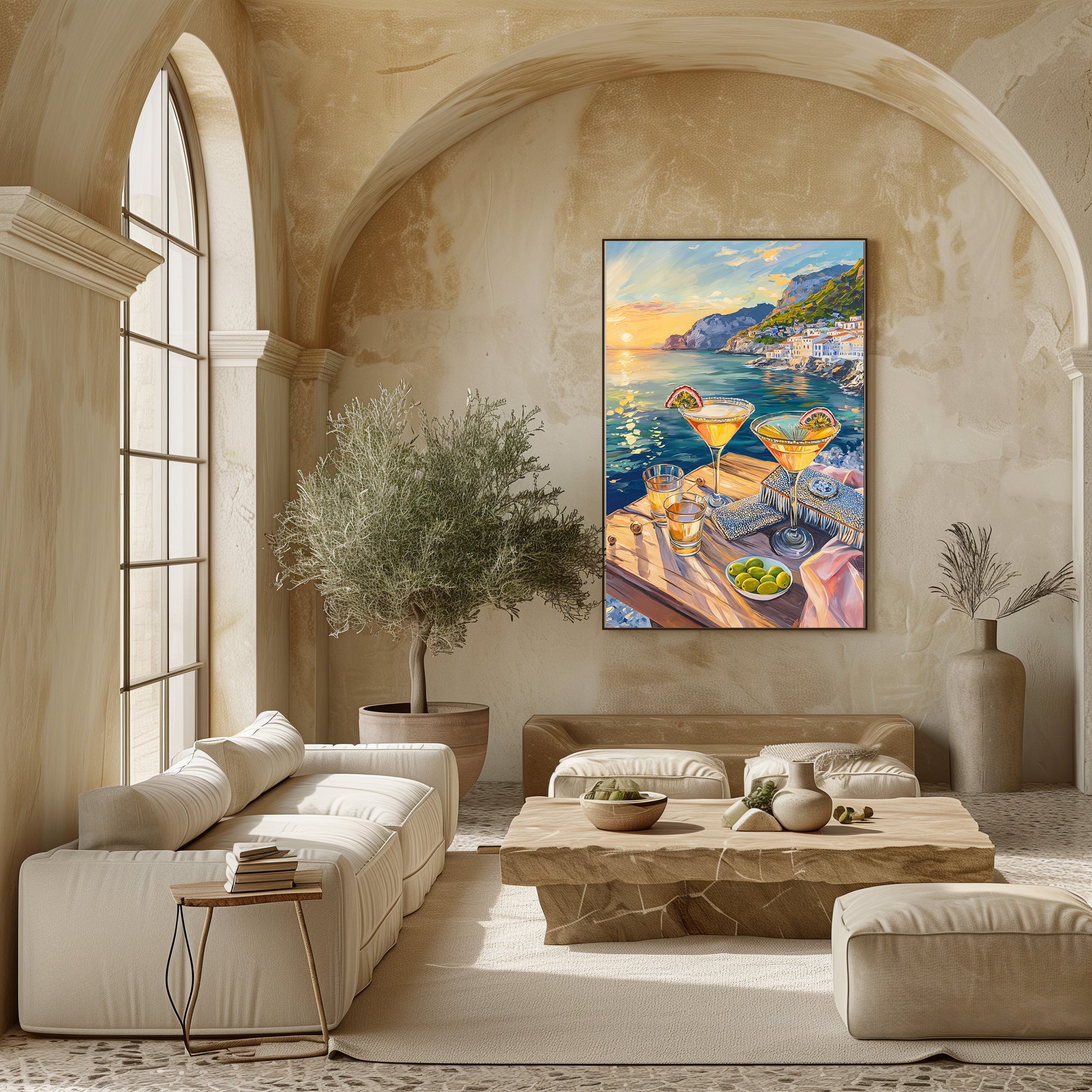 Deux cocktails élégants reposent face à la mer, avec en toile de fond les falaises et les maisons baignées de lumière de la côte amalfitaine au coucher du soleil. Cette œuvre contemporaine capture l’art de vivre méditerranéen, entre dolce vita, luxe discret et instants suspendus. Un tableau lumineux et raffiné, idéal pour apporter une touche d’évasion, de chaleur et d’élégance à votre intérieur.