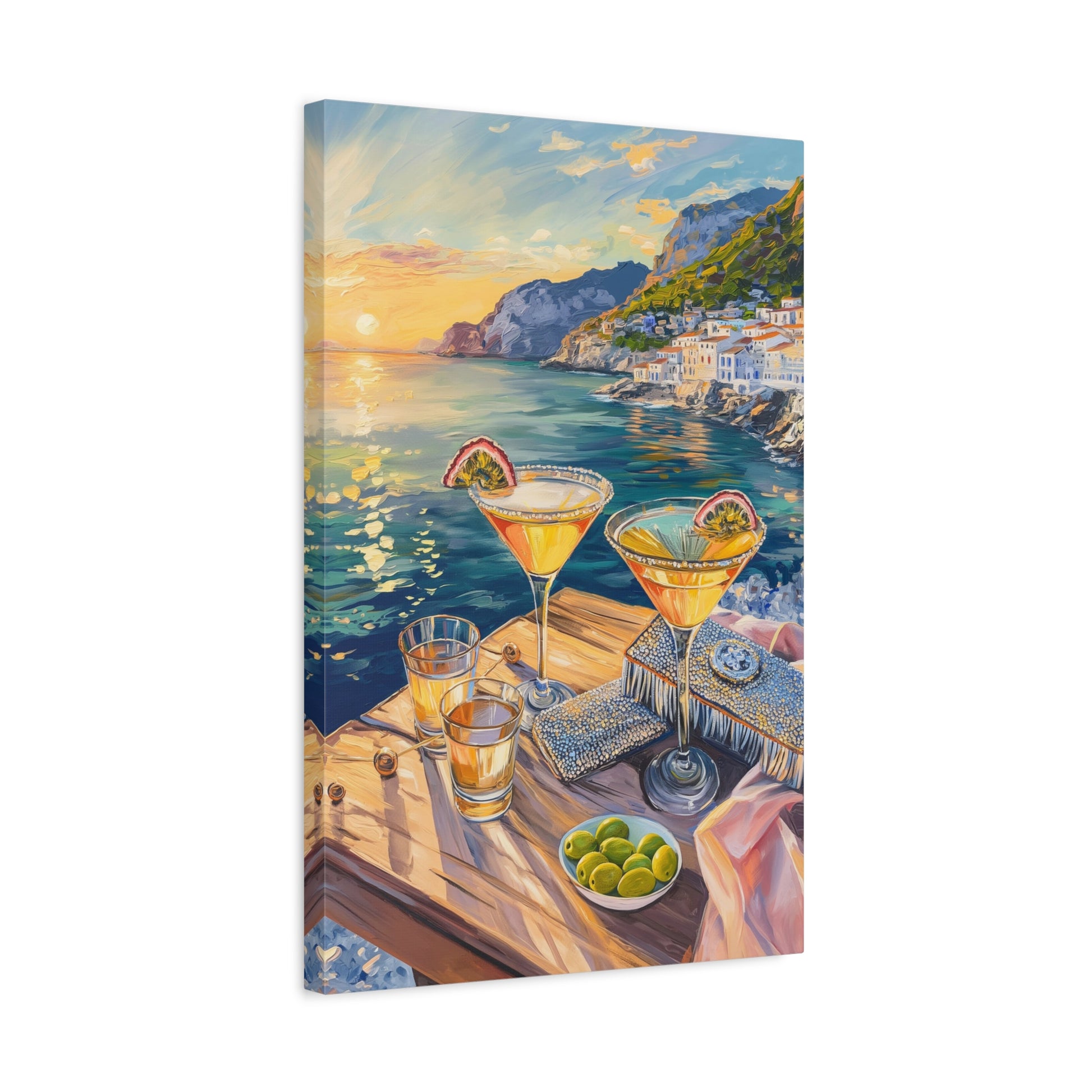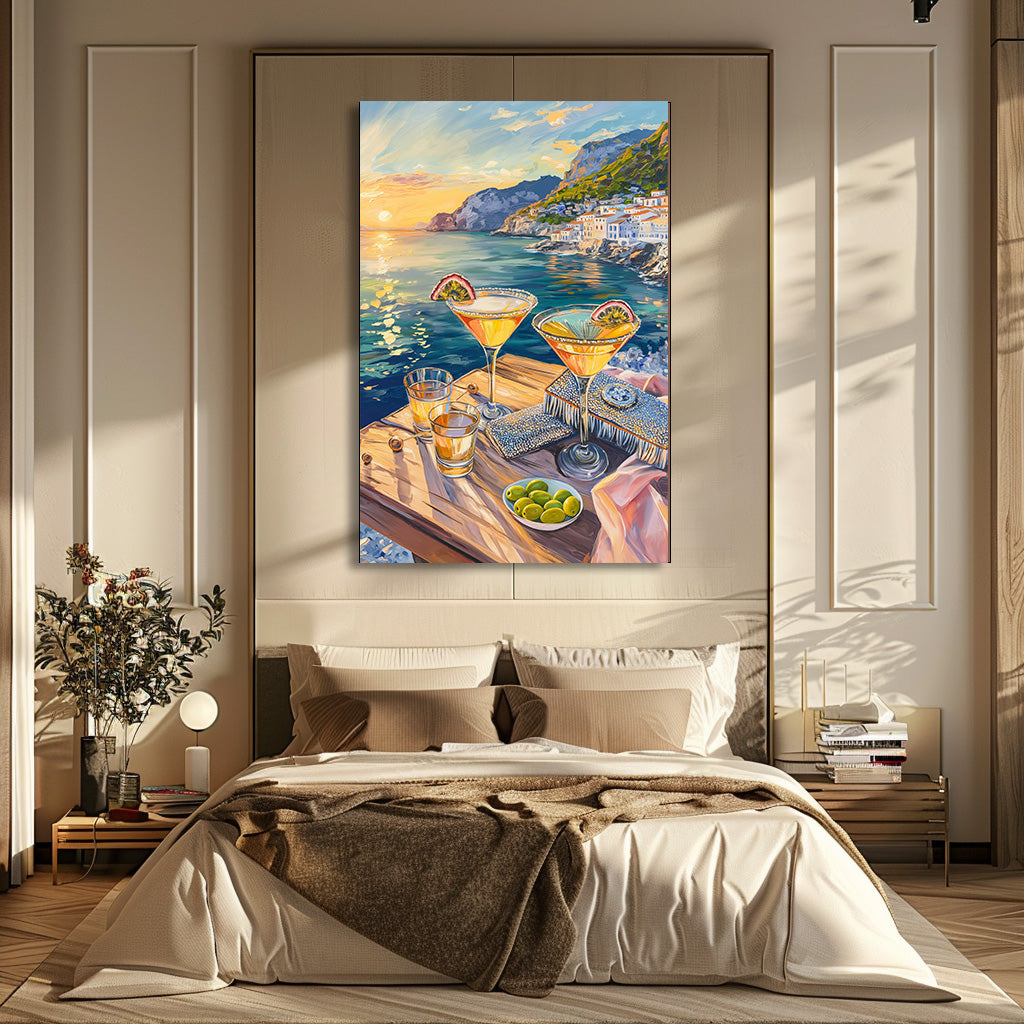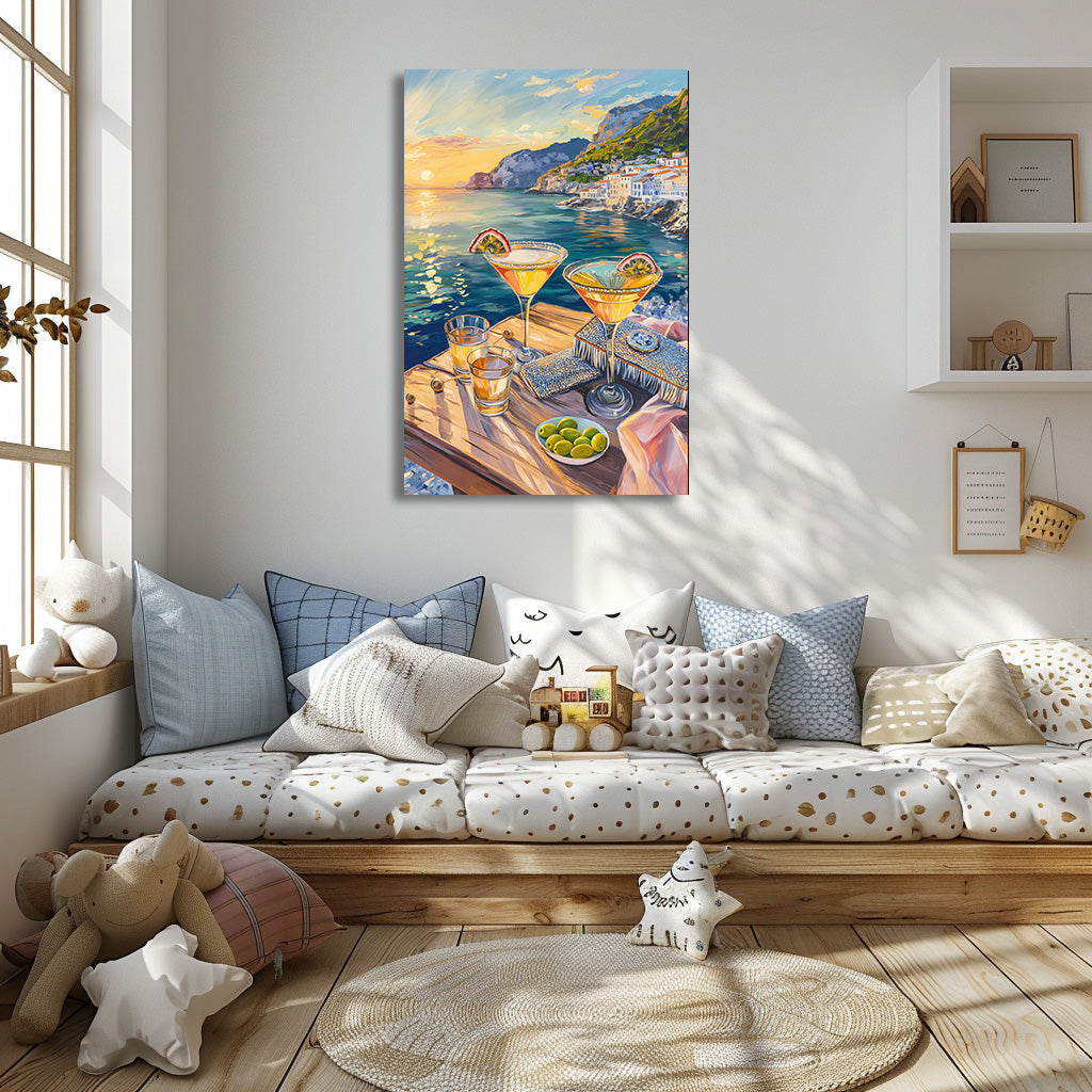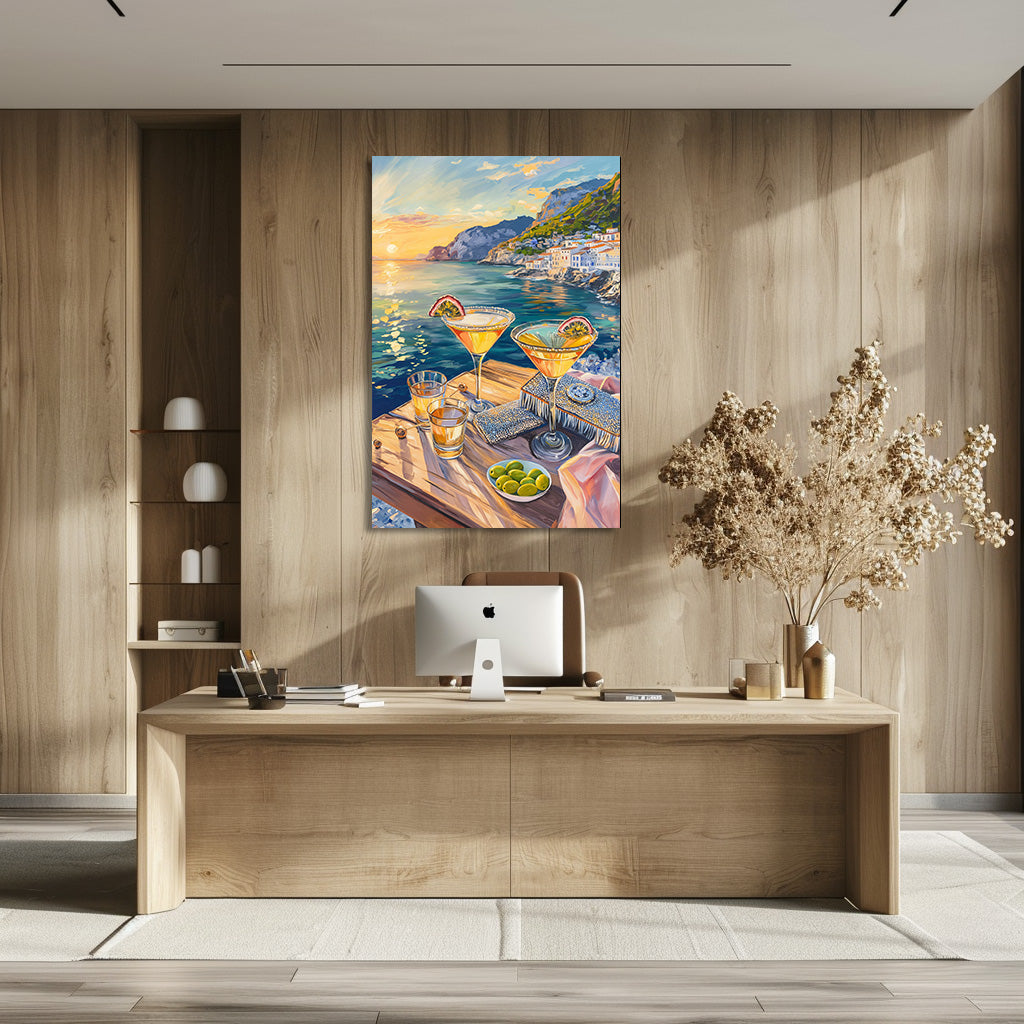 Deux cocktails élégants reposent face à la mer, avec en toile de fond les falaises et les maisons baignées de lumière de la côte amalfitaine au coucher du soleil. Cette œuvre contemporaine capture l’art de vivre méditerranéen, entre dolce vita, luxe discret et instants suspendus. Un tableau lumineux et raffiné, idéal pour apporter une touche d’évasion, de chaleur et d’élégance à votre intérieur.