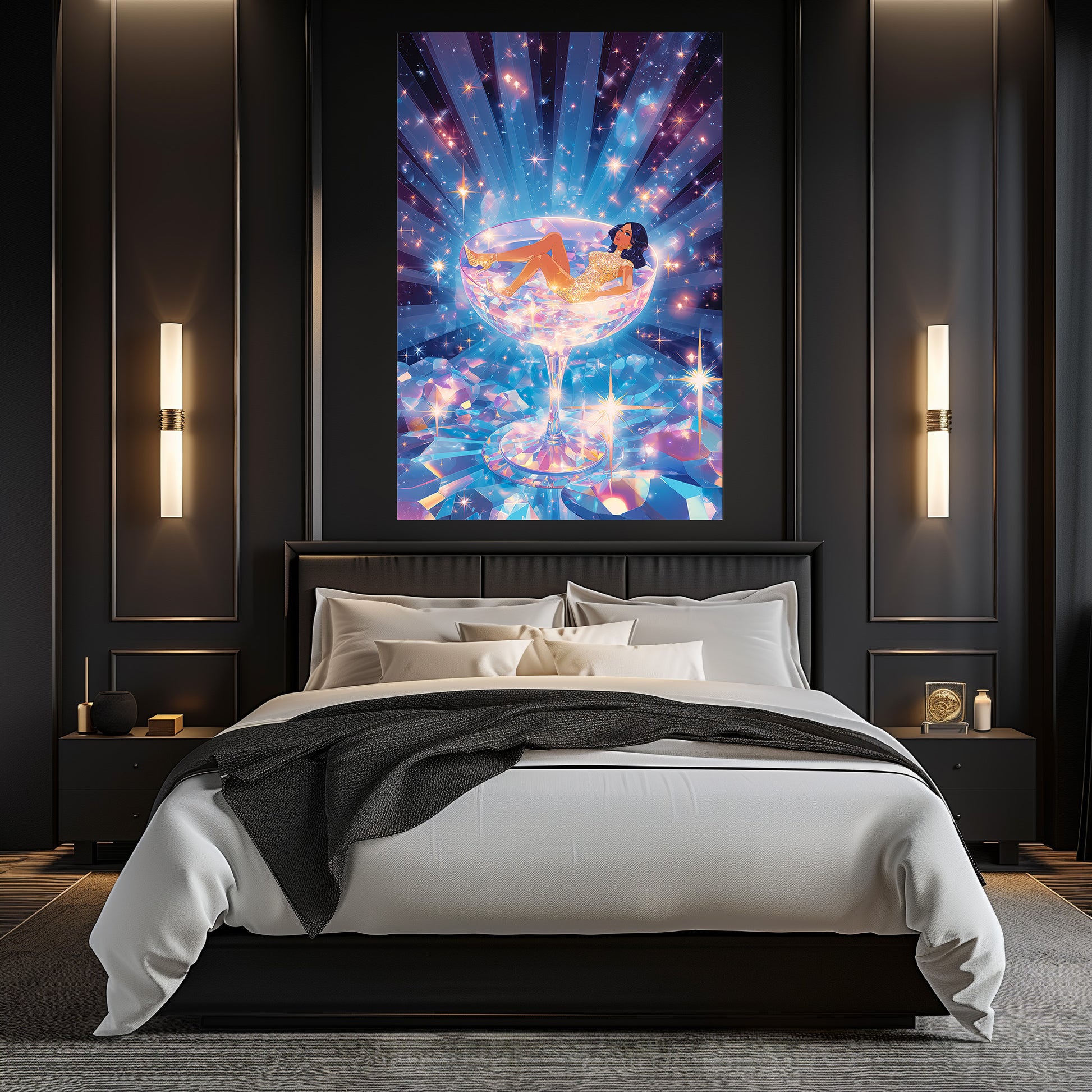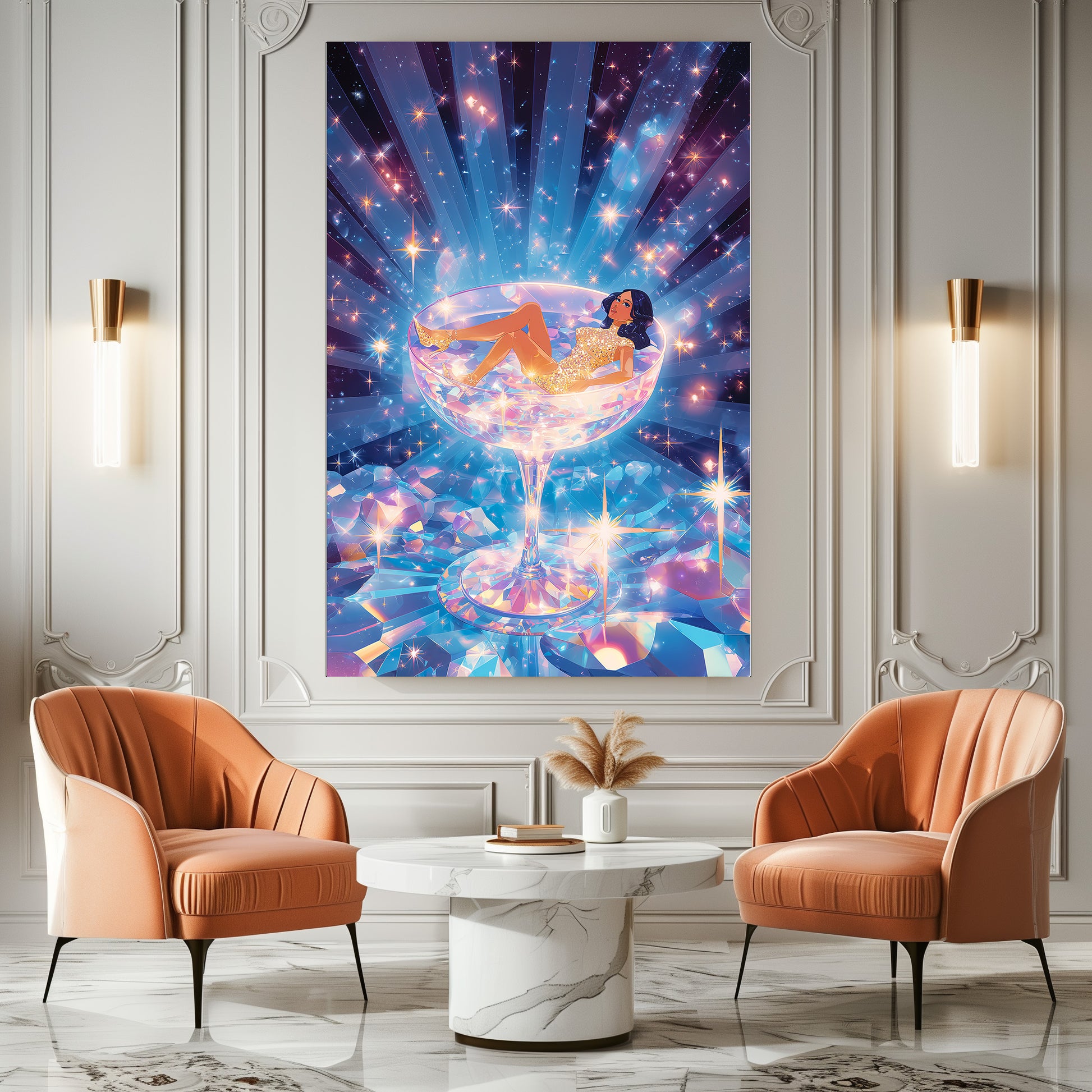 Une femme scintillante repose dans un verre à cocktail géant, entourée de reflets cristallins et d’éclats lumineux, dans une atmosphère féerique et glamour. Cette œuvre contemporaine mêle luxe, rêve et pop culture dans une composition vibrante et envoûtante. Un tableau spectaculaire, idéal pour apporter une touche audacieuse, festive et résolument chic à votre intérieur.