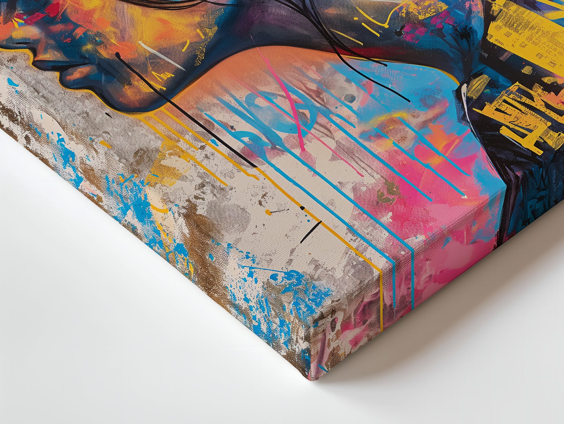 This vibrant artwork depicts the profile of a stylized young woman in a street art setting. The multicolored graffiti, paint splashes, and shades of blue, yellow, and pink create an electric contrast with the softness of her silhouette. A modern and bold painting, ideal for bringing an urban, artistic and characterful touch to your interior.