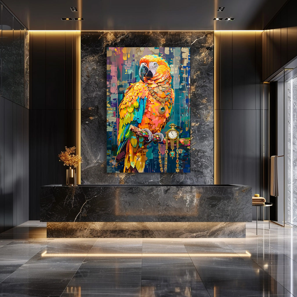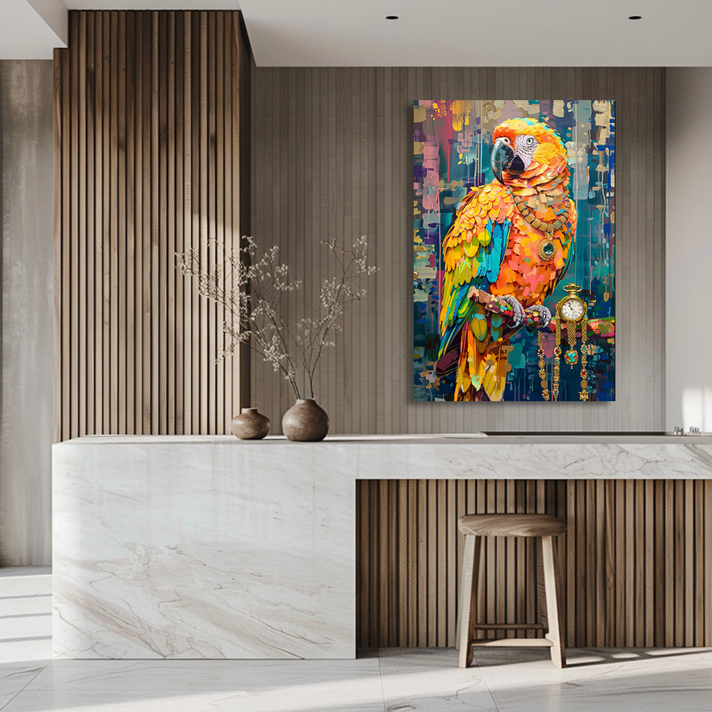 Un perroquet aux couleurs éclatantes se tient avec grâce dans un décor riche en textures et en détails. Les nuances vibrantes et les touches dorées apportent une sensation de mouvement et de profondeur, comme un instant figé hors du temps. Cette œuvre mêle exotisme et raffinement, invitant le regard à voyager entre intensité, curiosité et élégance visuelle.
