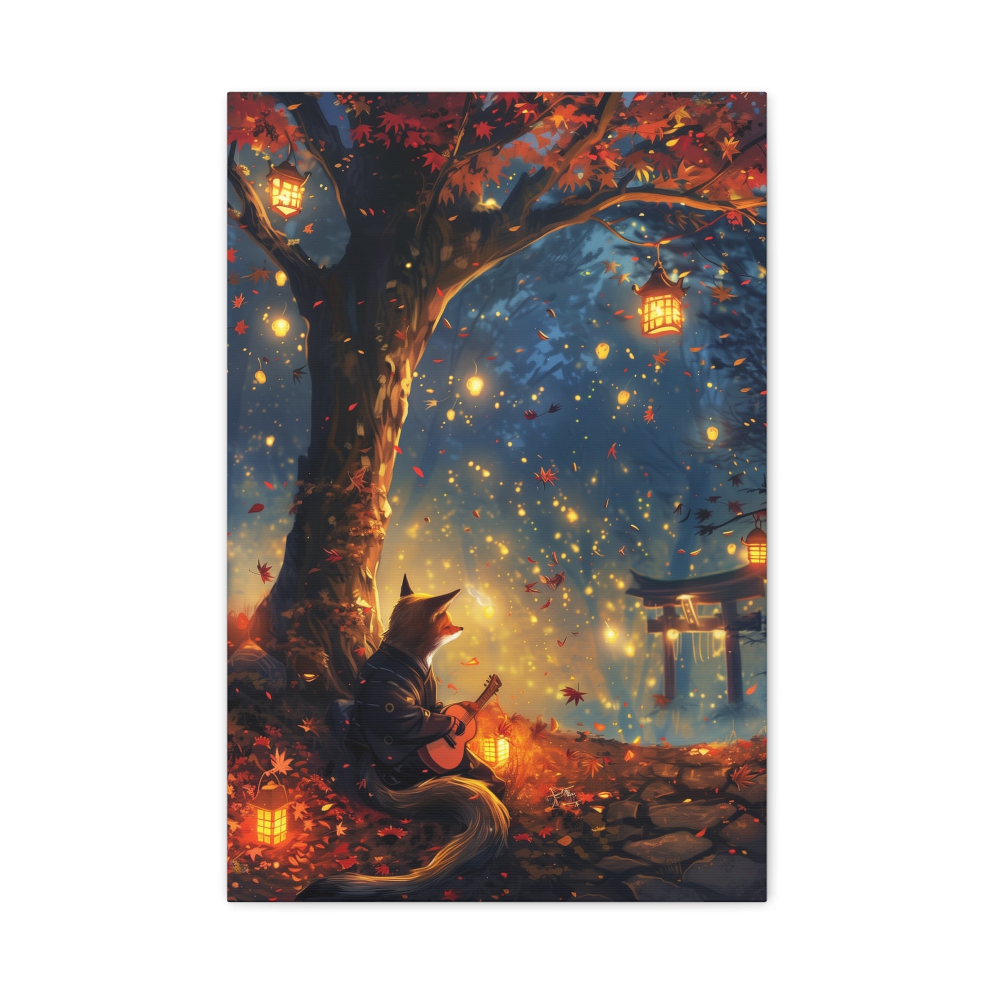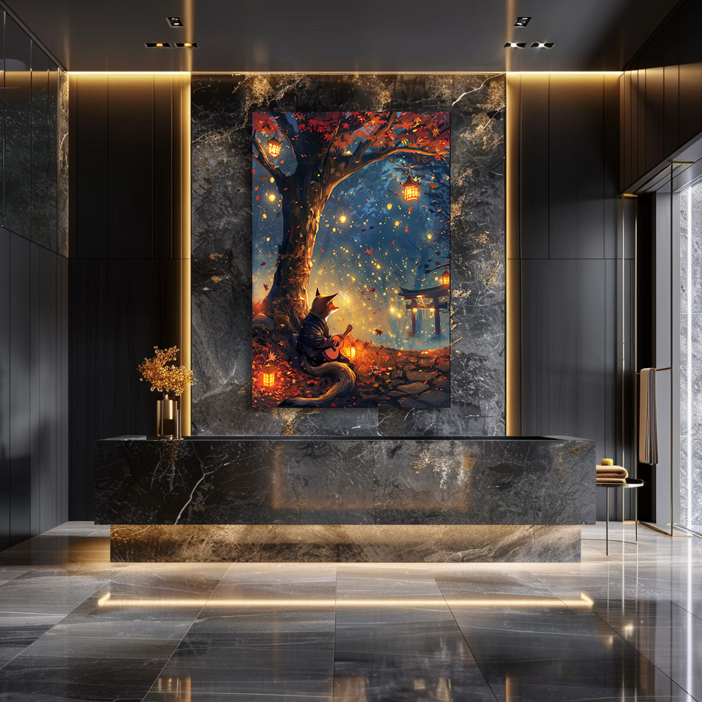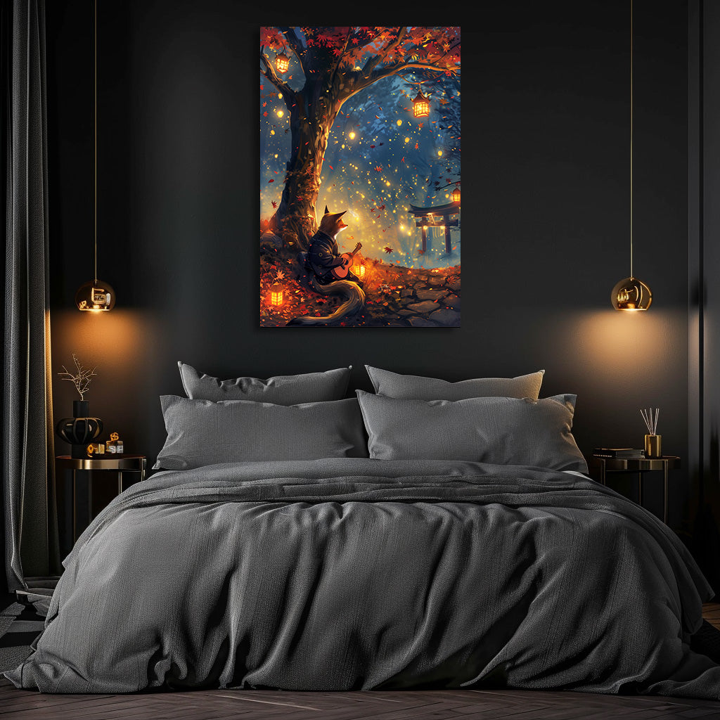 Sous un grand érable d’automne, un renard aux allures spirituelles joue quelques notes au cœur d’une forêt illuminée par des lanternes suspendues. Les feuilles qui tourbillonnent, la lumière dorée et l’atmosphère enchantée évoquent un conte japonais rempli de douceur et de magie. Un tableau chaleureux, poétique et apaisant, idéal pour créer une ambiance cosy et onirique dans n’importe quel intérieur.