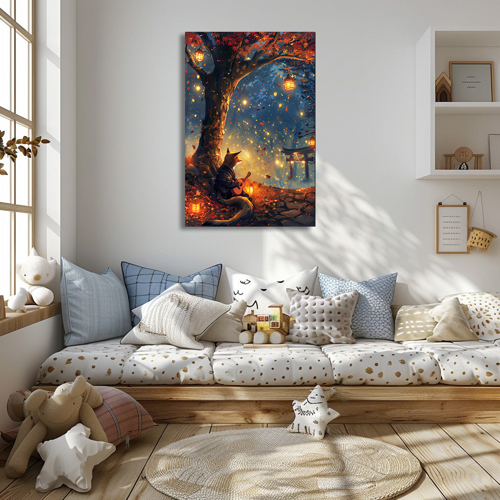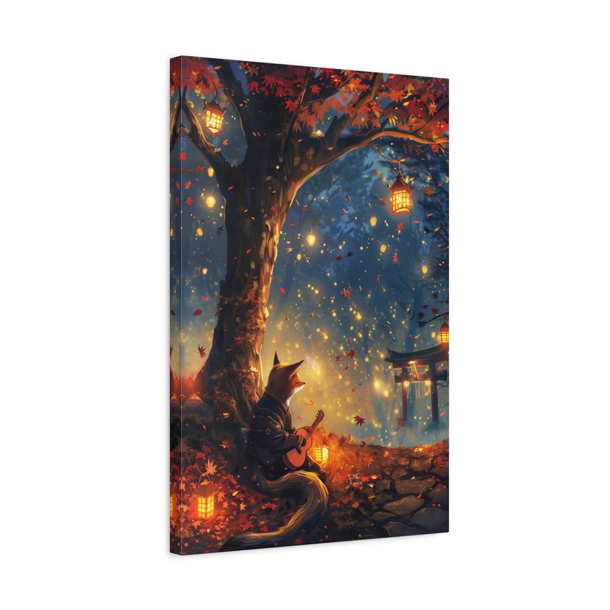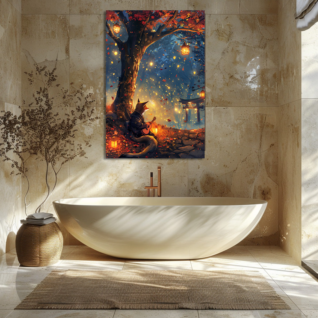 Sous un grand érable d’automne, un renard aux allures spirituelles joue quelques notes au cœur d’une forêt illuminée par des lanternes suspendues. Les feuilles qui tourbillonnent, la lumière dorée et l’atmosphère enchantée évoquent un conte japonais rempli de douceur et de magie. Un tableau chaleureux, poétique et apaisant, idéal pour créer une ambiance cosy et onirique dans n’importe quel intérieur.