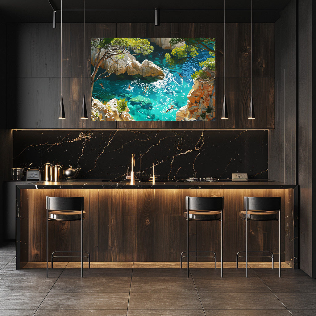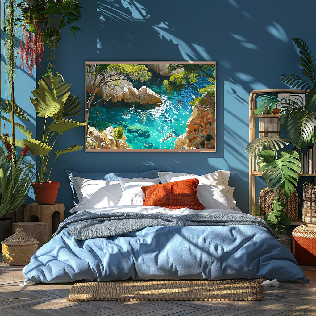 Cette œuvre évoque la liberté et la fraîcheur d’un moment suspendu, au cœur d’une eau cristalline entourée de roches et de nature. La lumière et les reflets créent une sensation immédiate d’évasion. Elle invite à ralentir et à s’immerger dans une atmosphère douce et estivale. Un tableau parfait pour insuffler une ambiance apaisante et lumineuse à votre intérieur.
