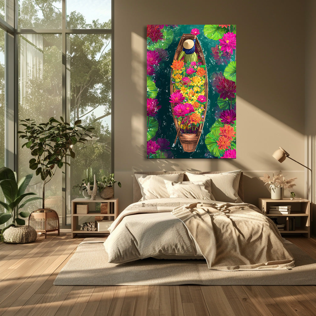 Cette œuvre envoûtante montre une barque vue du dessus, chargée de fleurs éclatantes aux tons rose, orange et jaune. Au fil de l’eau, la silhouette sereine de la rameuse contraste avec la richesse des couleurs qui flottent tout autour. Un tableau lumineux et apaisant, qui évoque les marchés flottants asiatiques, la douceur du voyage et la poésie du quotidien, parfait pour apporter une touche colorée, zen et raffinée à votre intérieur.