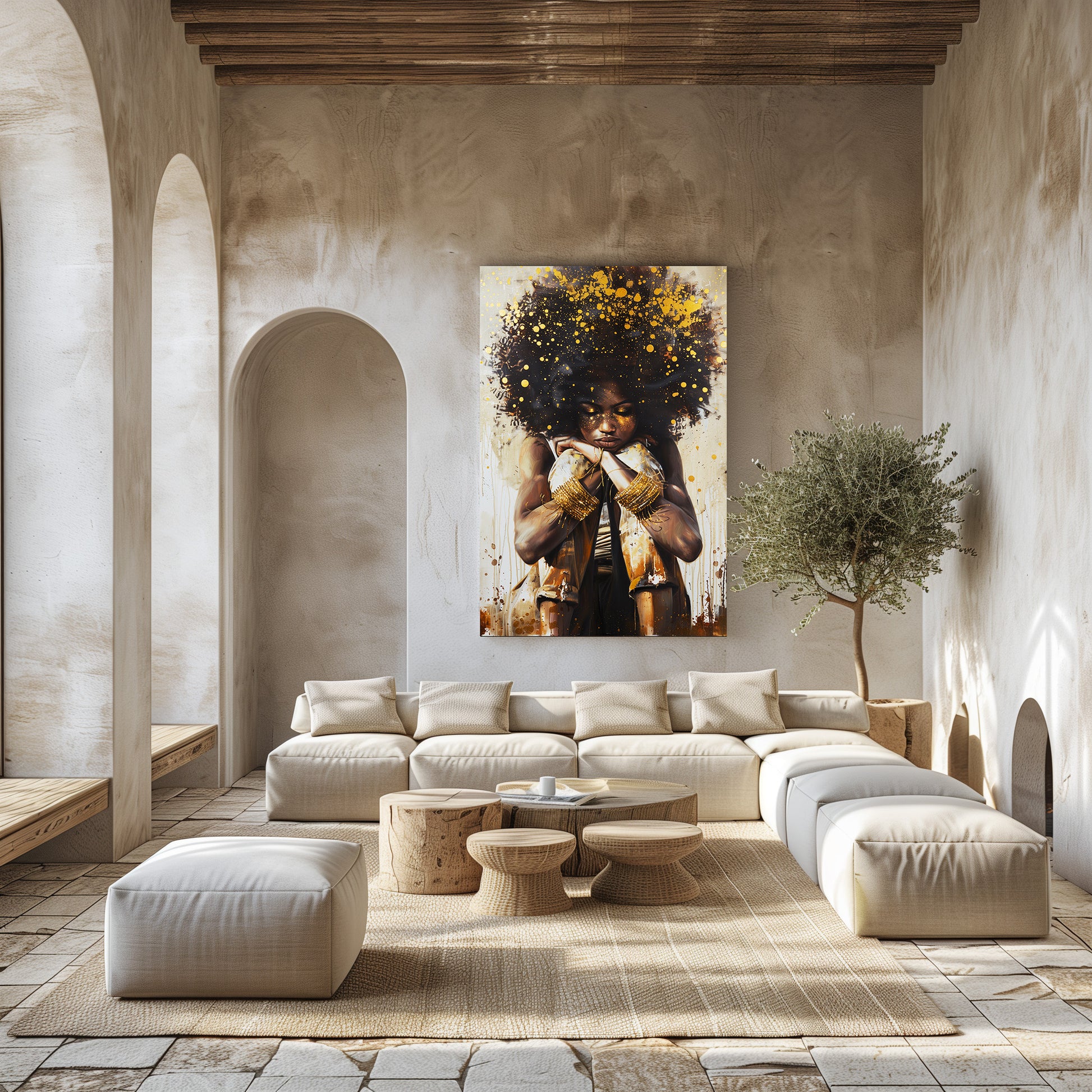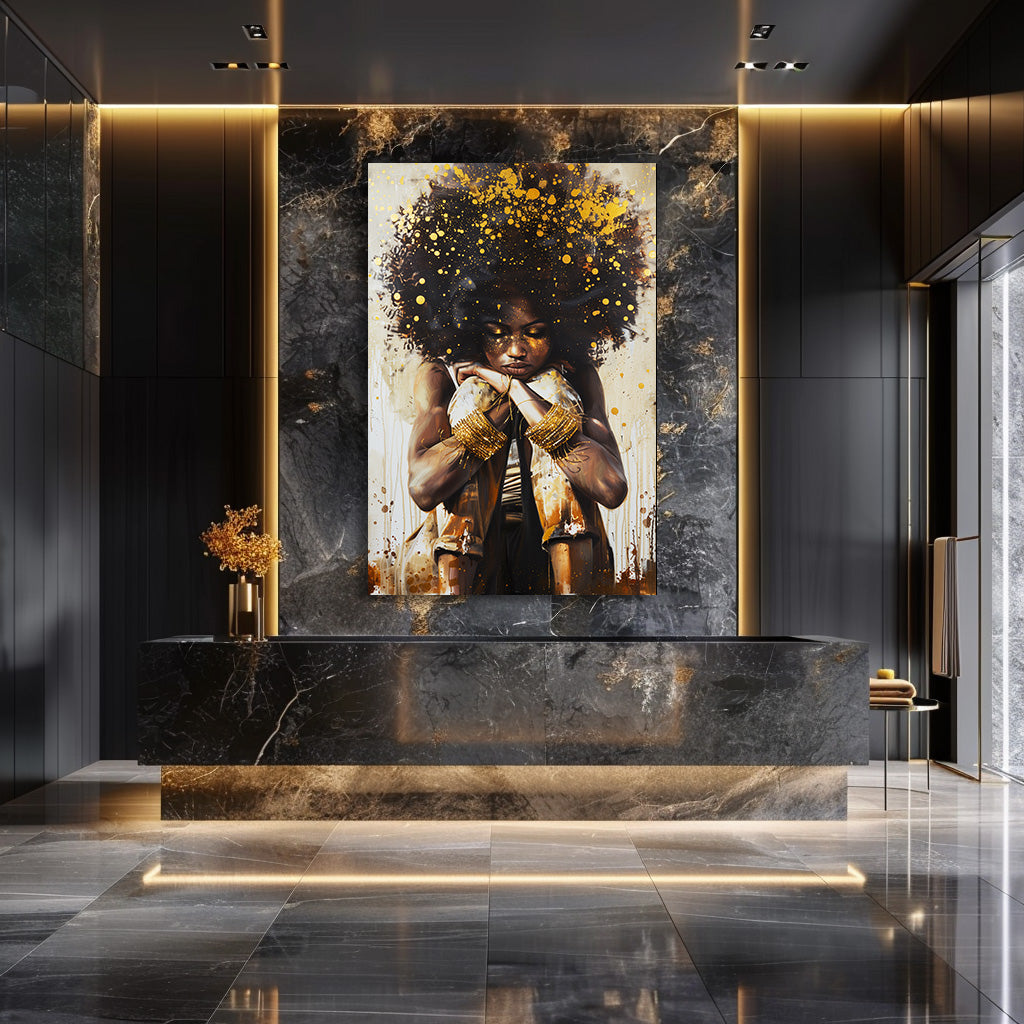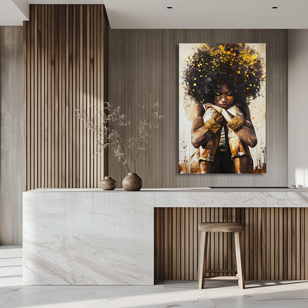 Ce tableau montre une femme assise, perdue dans ses pensées, entourée de touches dorées qui dynamisent toute la scène. Son afro est sublimé par des éclats de peinture qui apportent du mouvement et une vraie présence visuelle. Les tons chauds et les détails dorés créent un rendu moderne, expressif et élégant. Une pièce forte qui ajoute du caractère, de la profondeur et une ambiance contemporaine à n’importe quel intérieur.