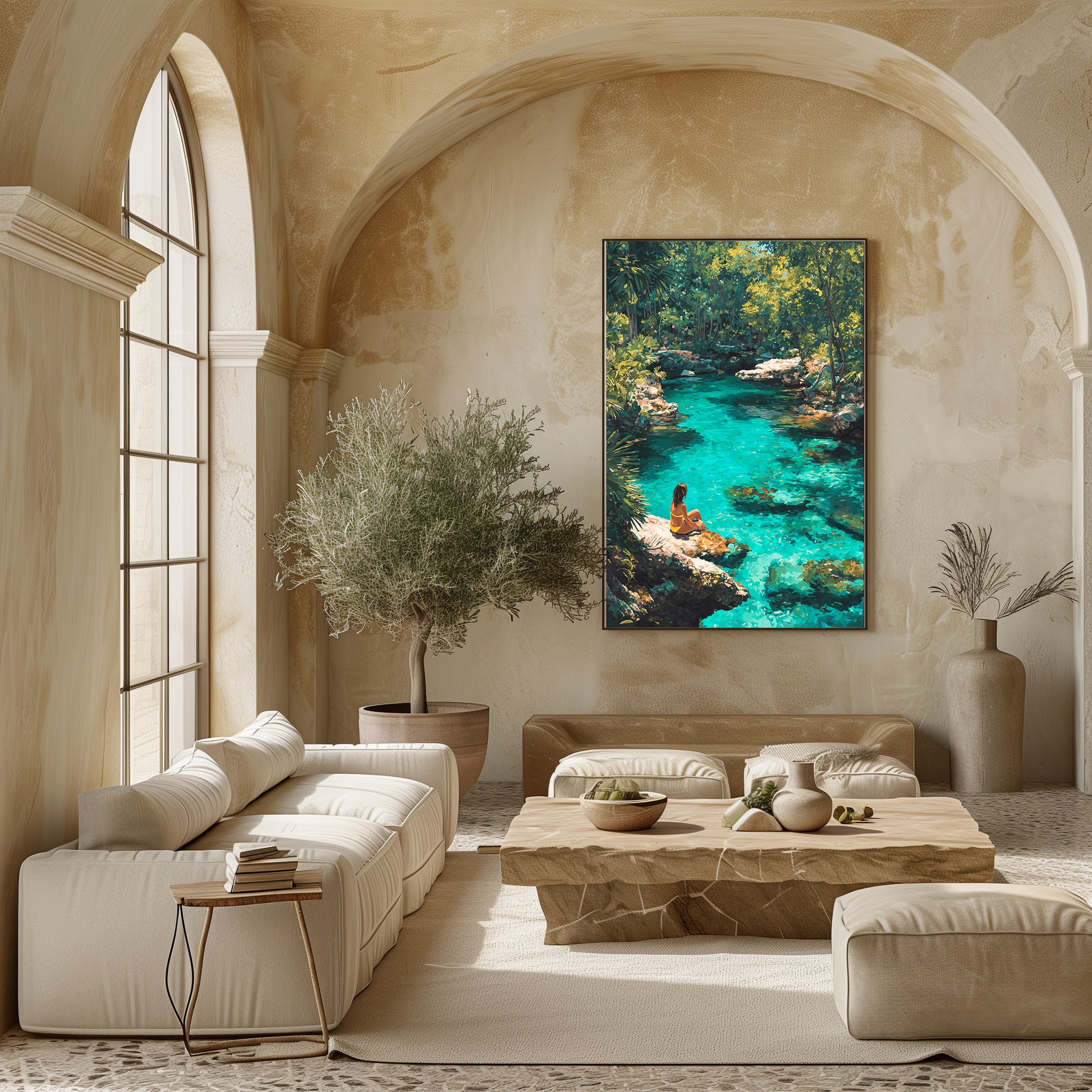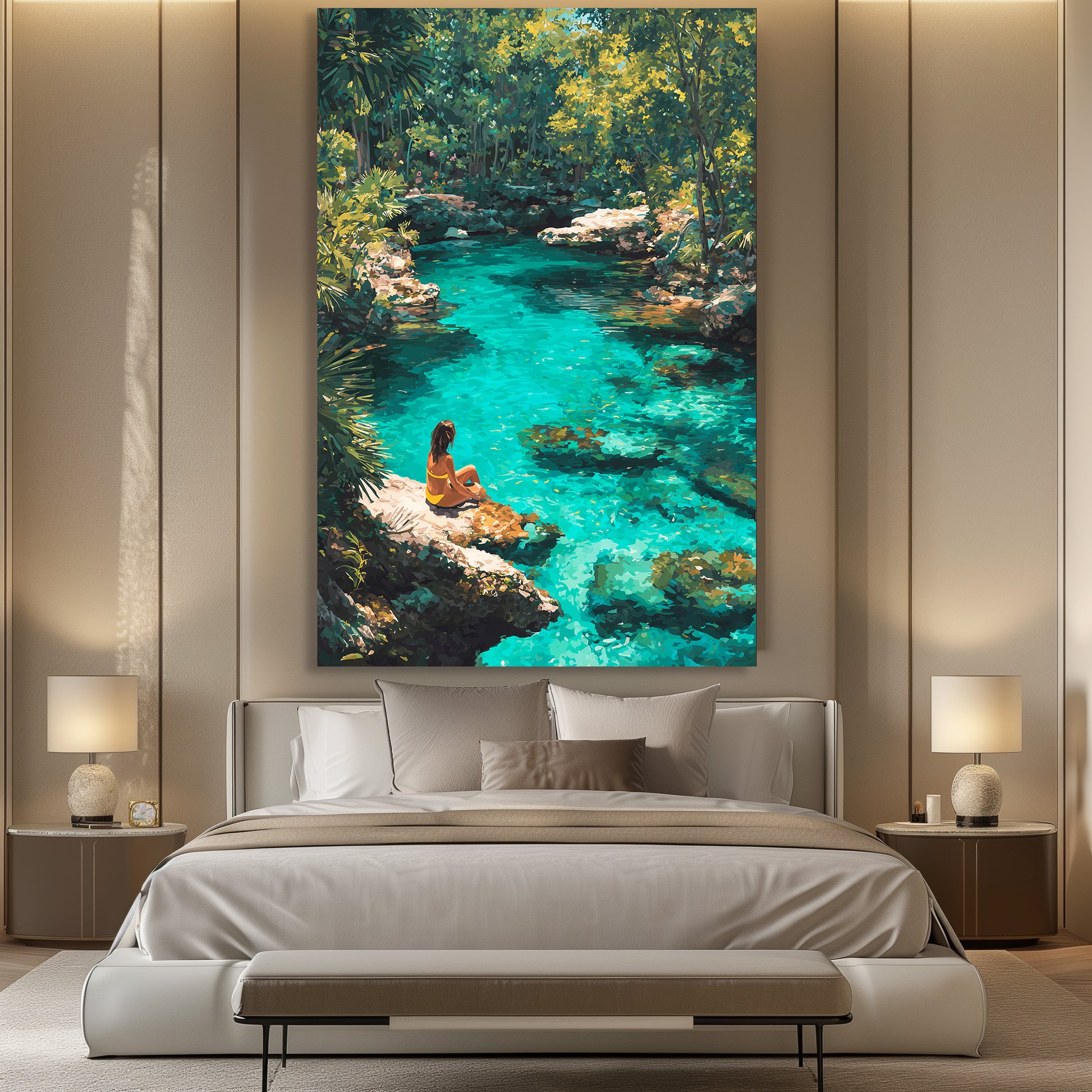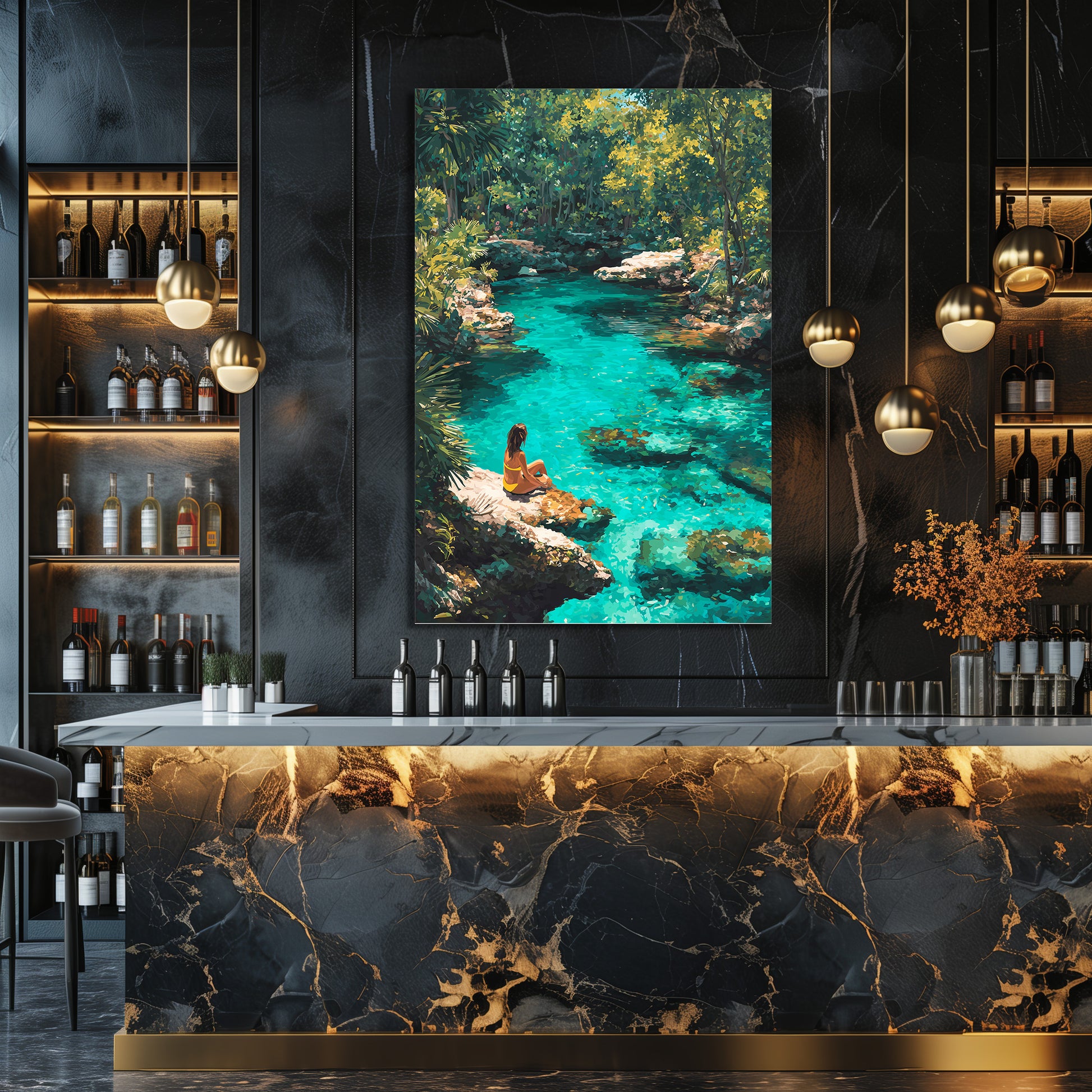 Esta obra capta la serenidad de una poza natural de aguas turquesas en el corazón de una exuberante jungla. La silueta sentada al borde del agua contempla este apacible paisaje bañado por la luz, evocando calma, conexión con la naturaleza y evasión tropical. Los tonos de verde intenso y azul cristalino crean una atmósfera relajante e inmersiva. Un cuadro luminoso y relajante, ideal para aportar frescura, naturaleza y una sensación de evasión a un interior.