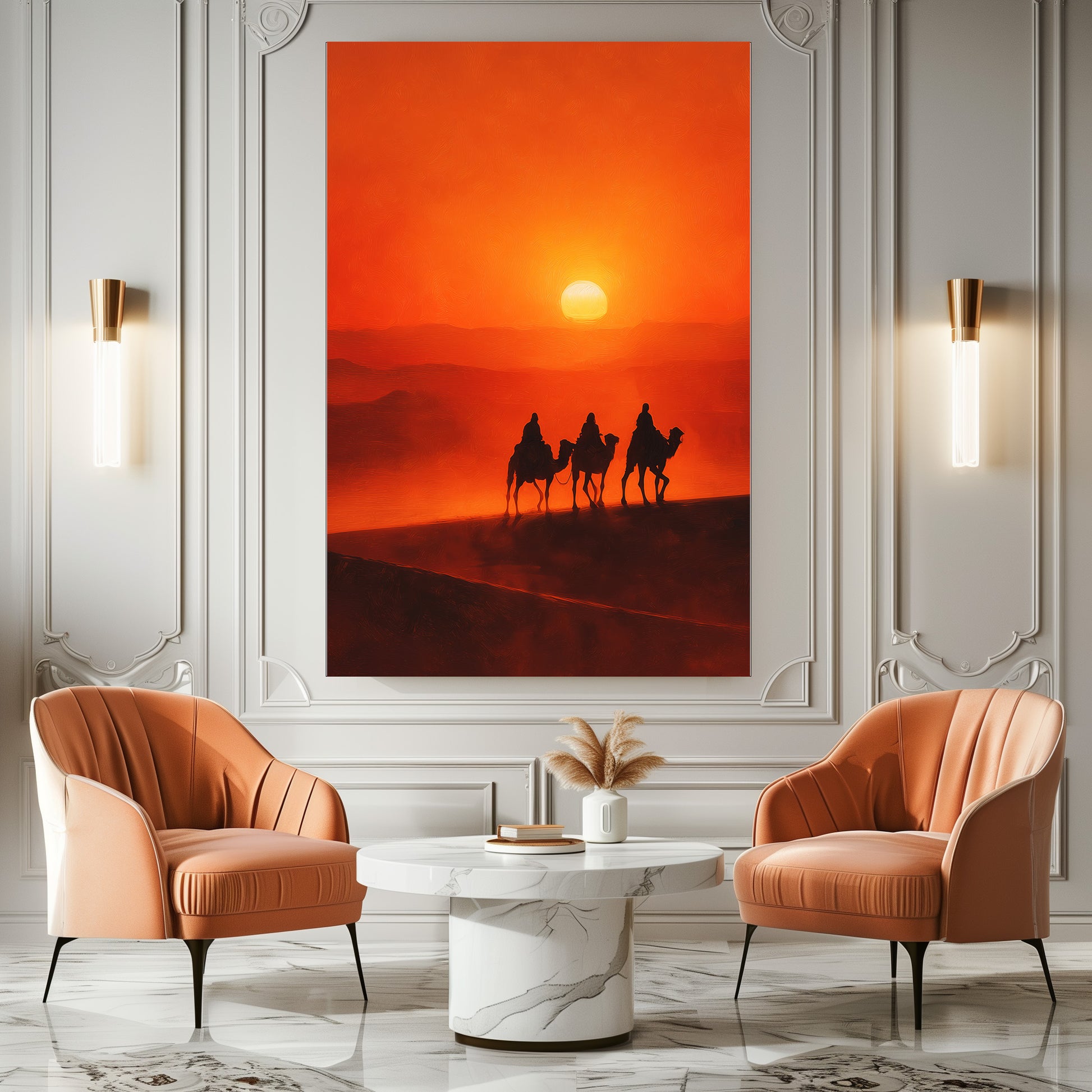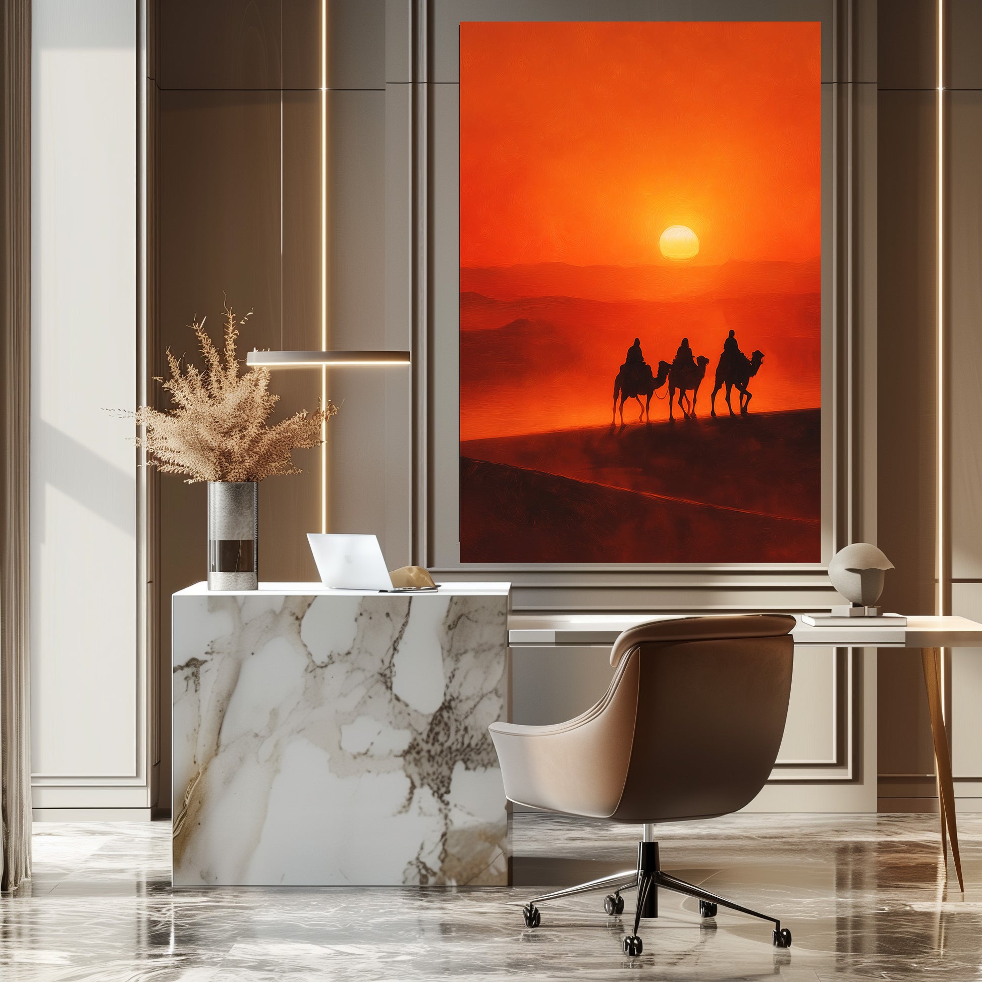 Cette œuvre capture la magie d’un coucher de soleil embrasant le désert, où les silhouettes de chameaux se découpent avec élégance sur l’horizon incandescent. Les tons orangés et rouges enveloppent la scène d’une atmosphère silencieuse et contemplative, évoquant le voyage, le temps suspendu et l’immensité des paysages désertiques. Un tableau puissant et intemporel, idéal pour insuffler chaleur, évasion et caractère à un intérieur.