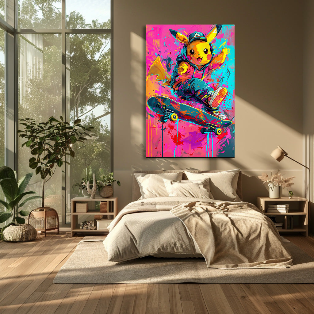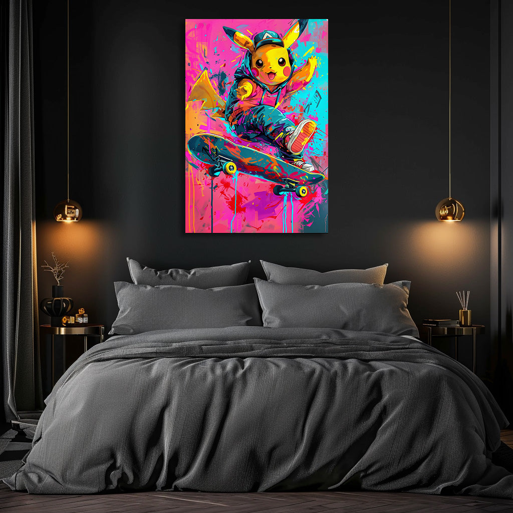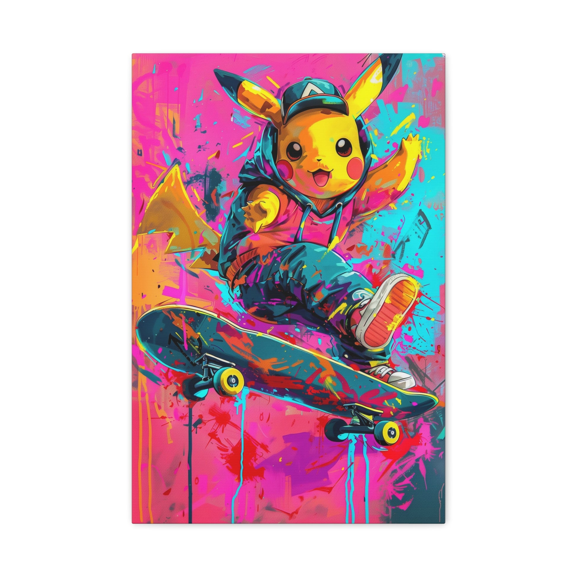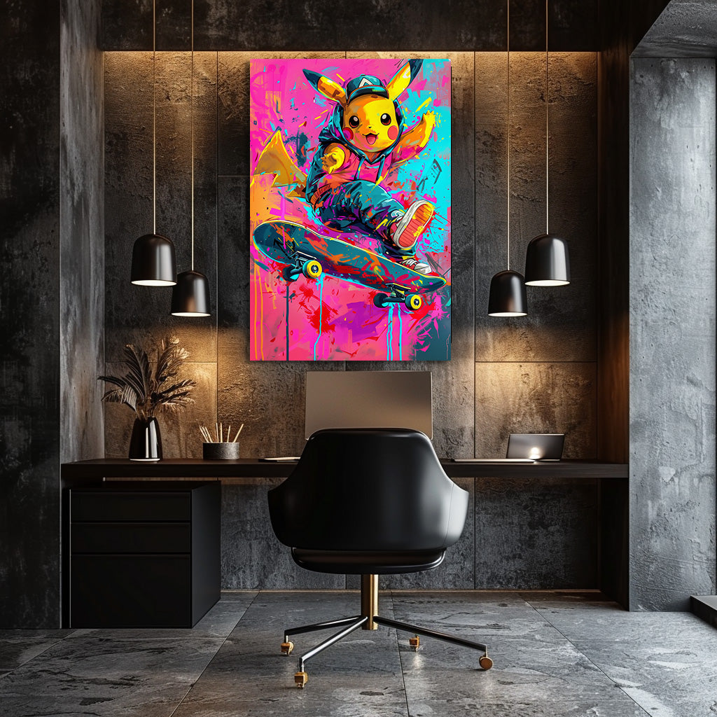Une petite créature jaune pleine d’énergie réalise une figure de skate au milieu d’un décor haut en couleurs. Son look streetwear, les éclaboussures de peinture et l’ambiance urbaine donnent à l’œuvre un style moderne, vif et ultra-dynamique. Un tableau fun et audacieux, parfait pour apporter une touche pop et colorée à une chambre, un bureau ou un intérieur contemporain.