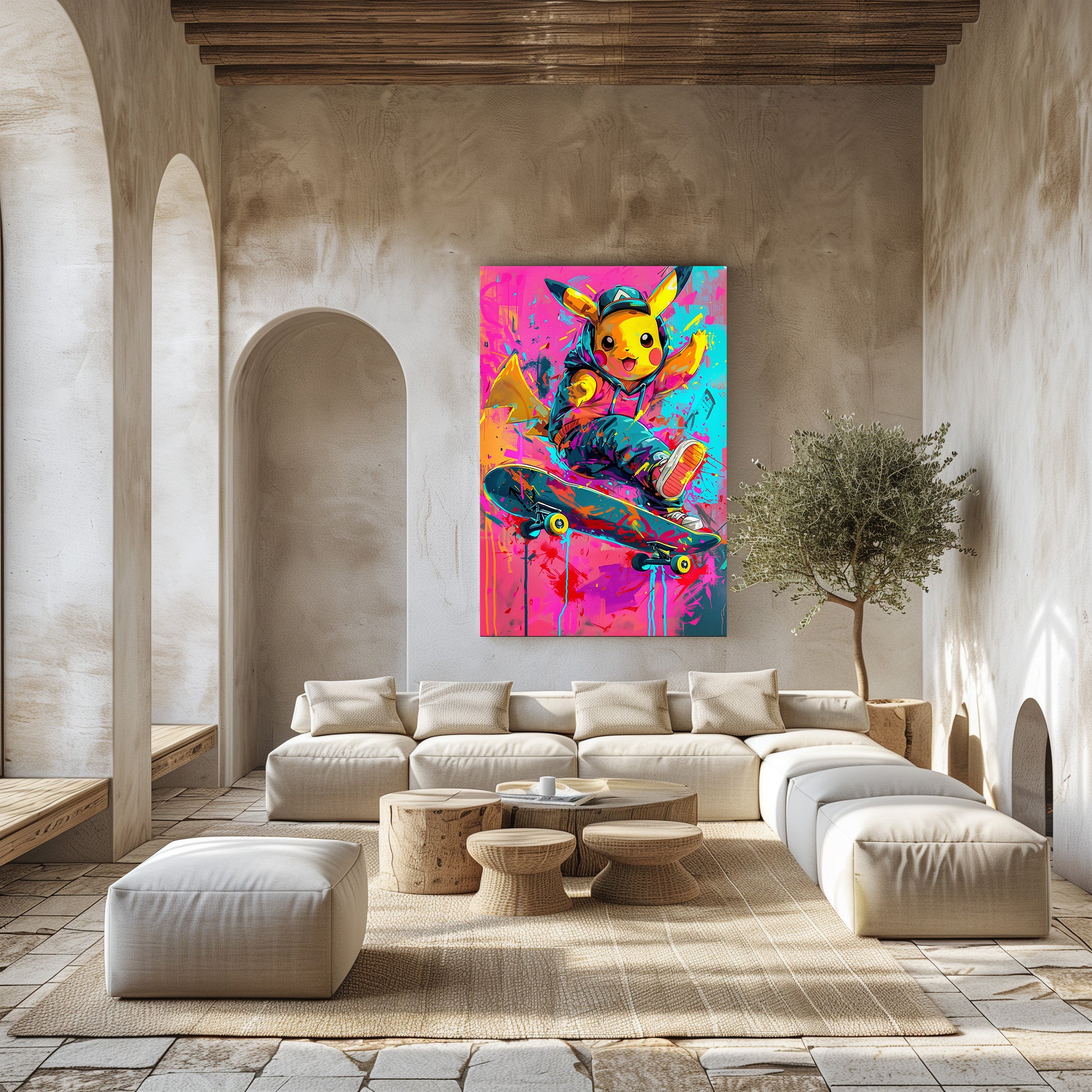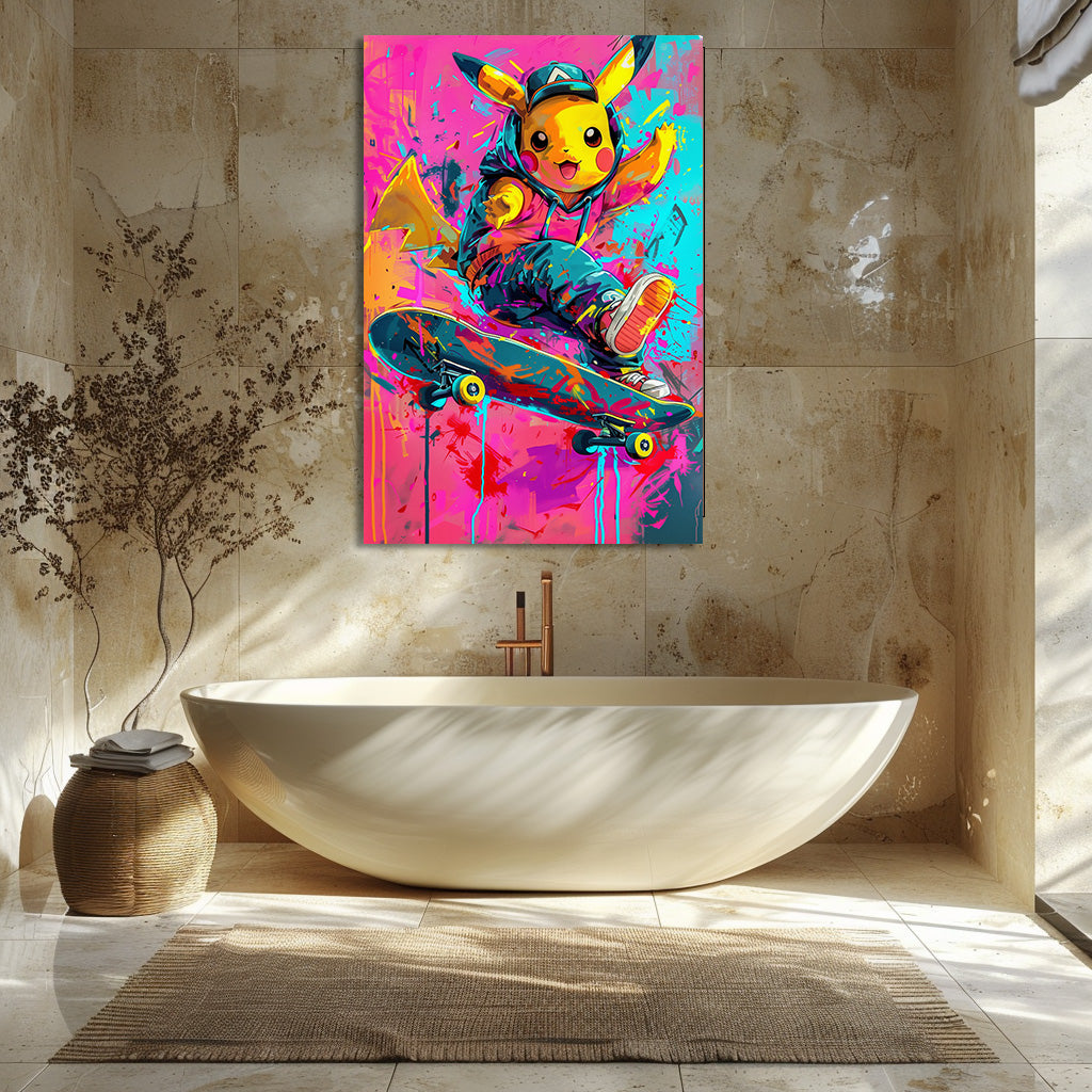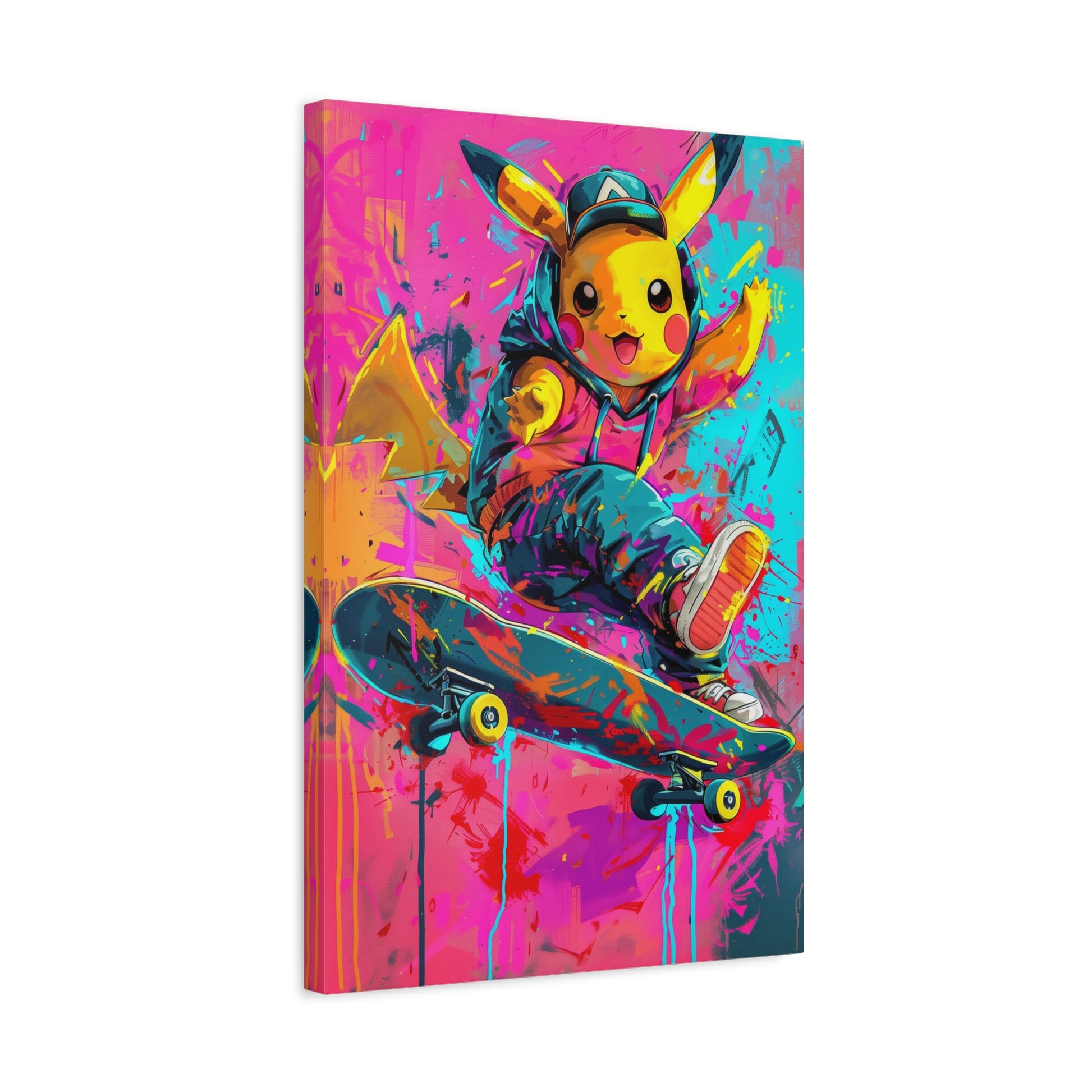 Une petite créature jaune pleine d’énergie réalise une figure de skate au milieu d’un décor haut en couleurs. Son look streetwear, les éclaboussures de peinture et l’ambiance urbaine donnent à l’œuvre un style moderne, vif et ultra-dynamique. Un tableau fun et audacieux, parfait pour apporter une touche pop et colorée à une chambre, un bureau ou un intérieur contemporain.
