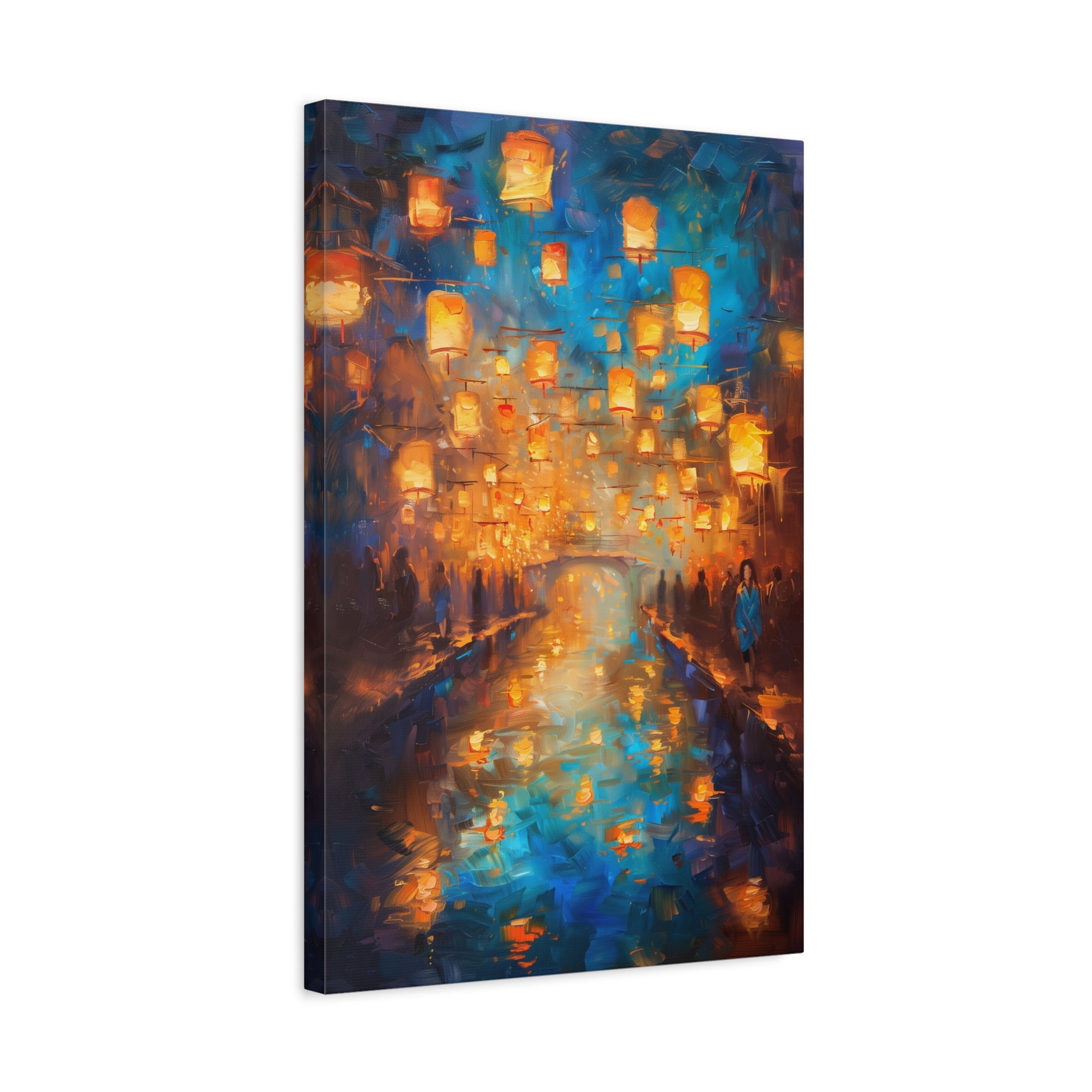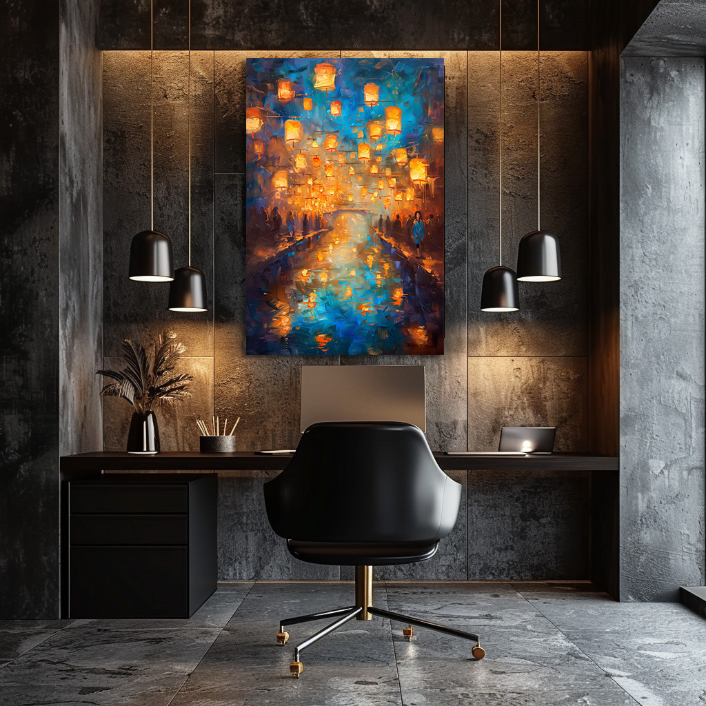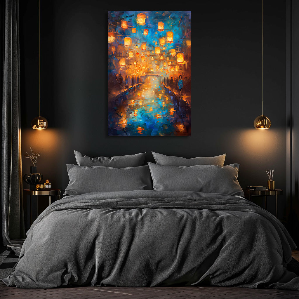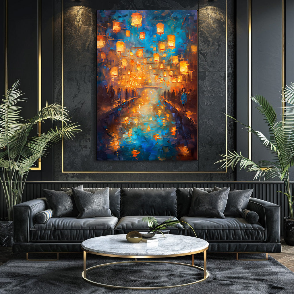 Des centaines de lanternes dorées s’élèvent dans le ciel nocturne et se reflètent dans l’eau calme d’un canal scintillant. Les silhouettes en bord de rive, la lumière chaude et l’atmosphère légèrement floue donnent à la scène un charme romantique et spirituel, comme un instant suspendu. Un tableau doux, lumineux et envoûtant, idéal pour créer une ambiance apaisante et magique dans n’importe quelle pièce.