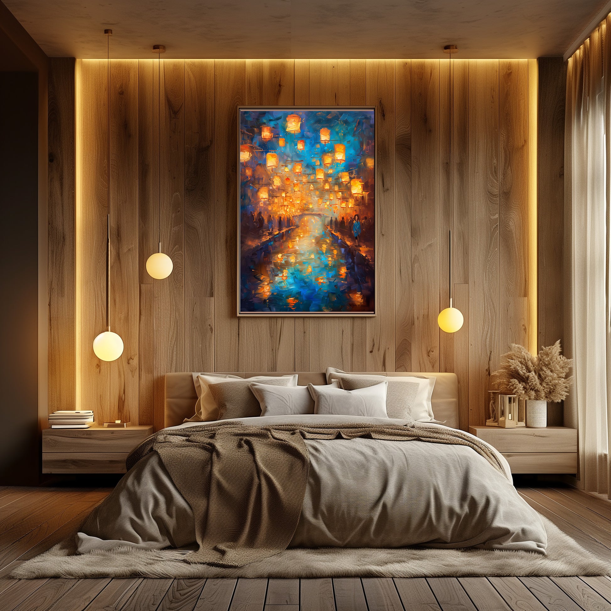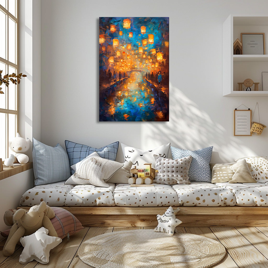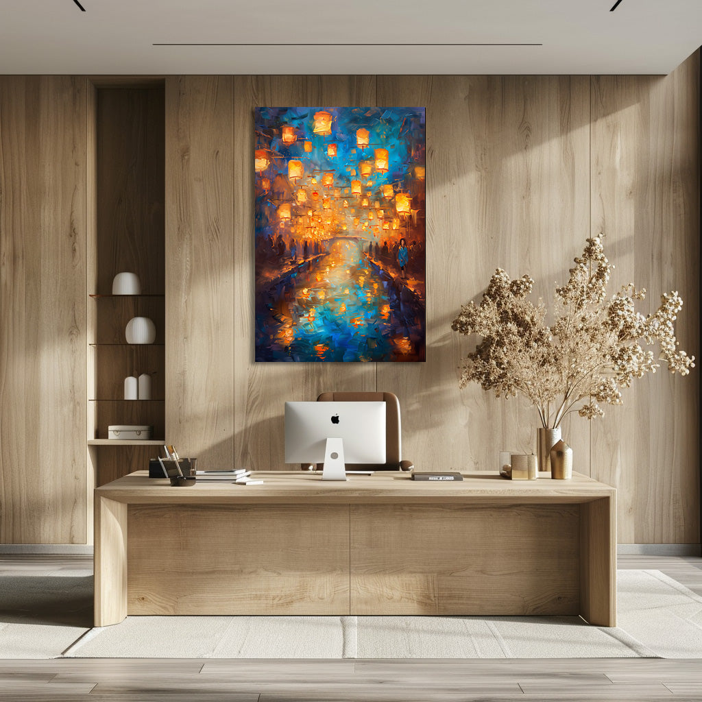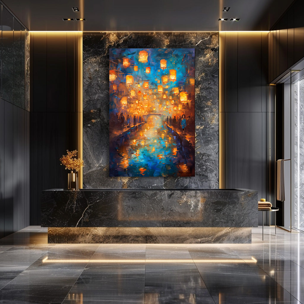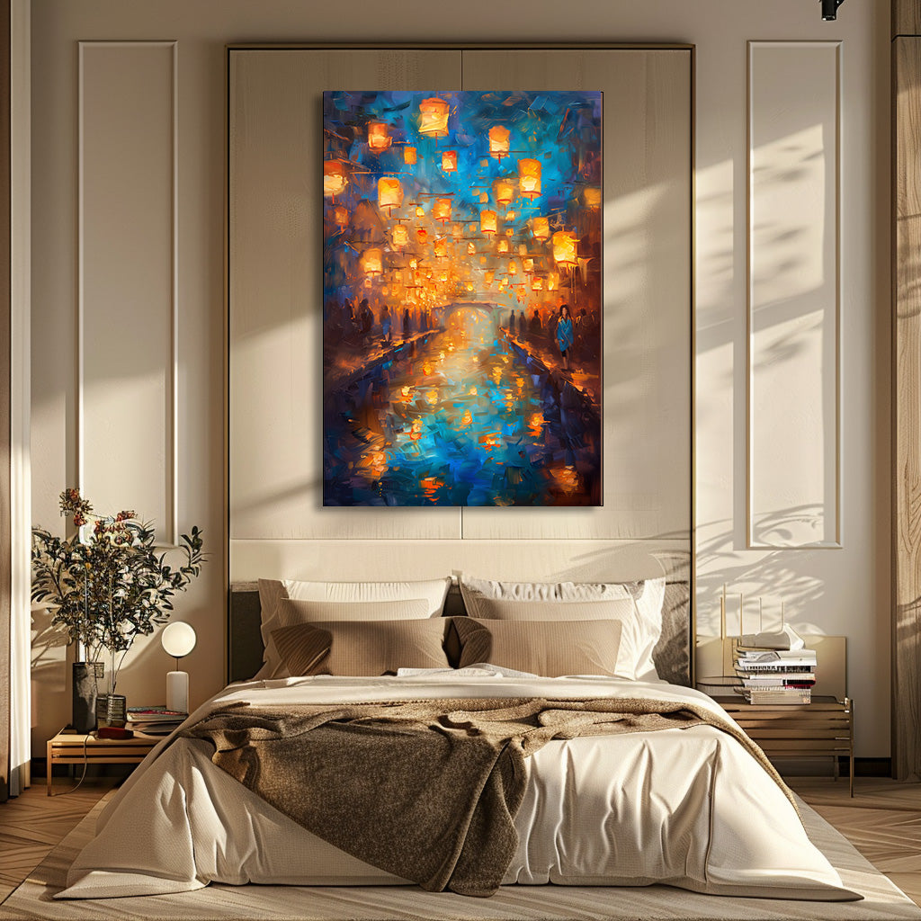 Des centaines de lanternes dorées s’élèvent dans le ciel nocturne et se reflètent dans l’eau calme d’un canal scintillant. Les silhouettes en bord de rive, la lumière chaude et l’atmosphère légèrement floue donnent à la scène un charme romantique et spirituel, comme un instant suspendu. Un tableau doux, lumineux et envoûtant, idéal pour créer une ambiance apaisante et magique dans n’importe quelle pièce.