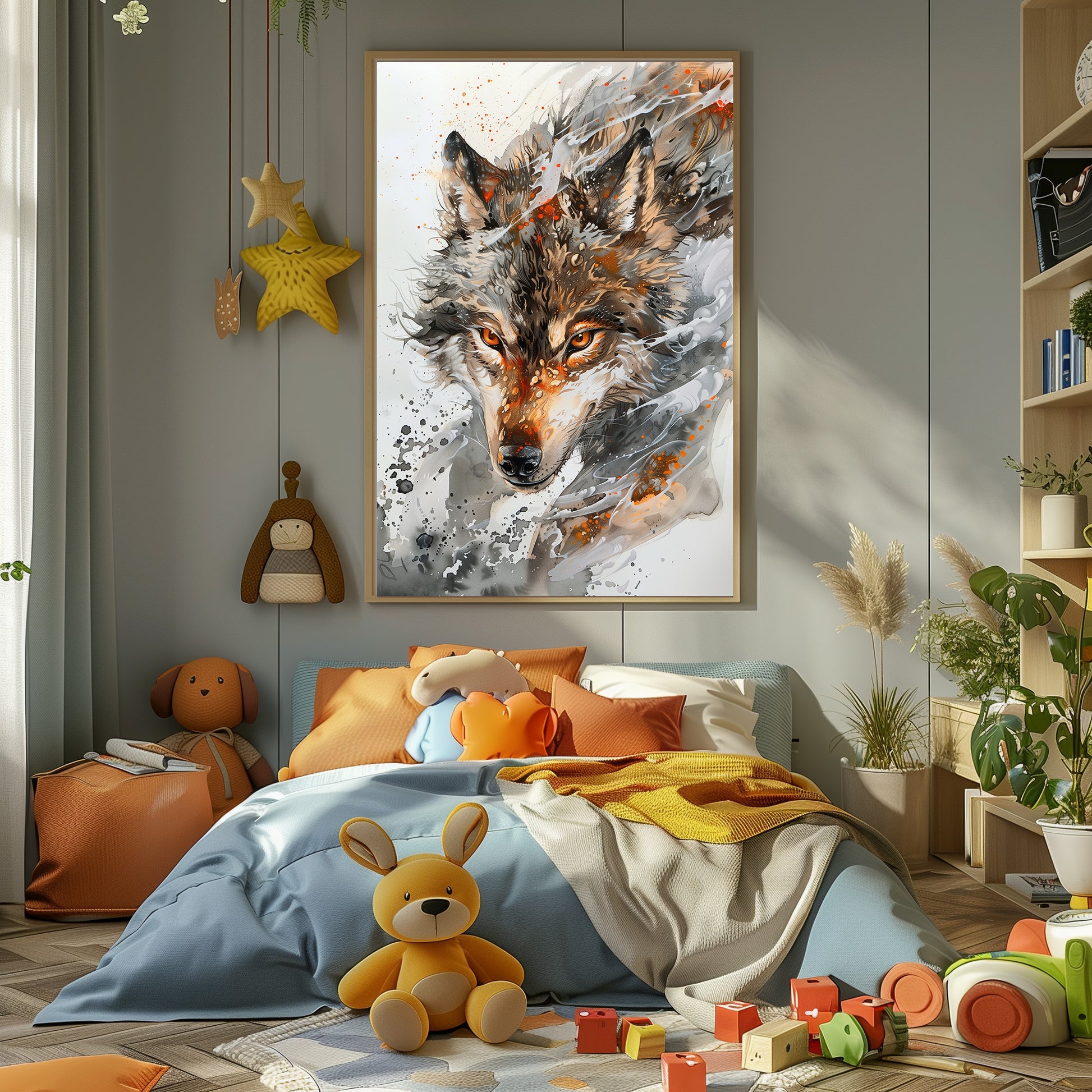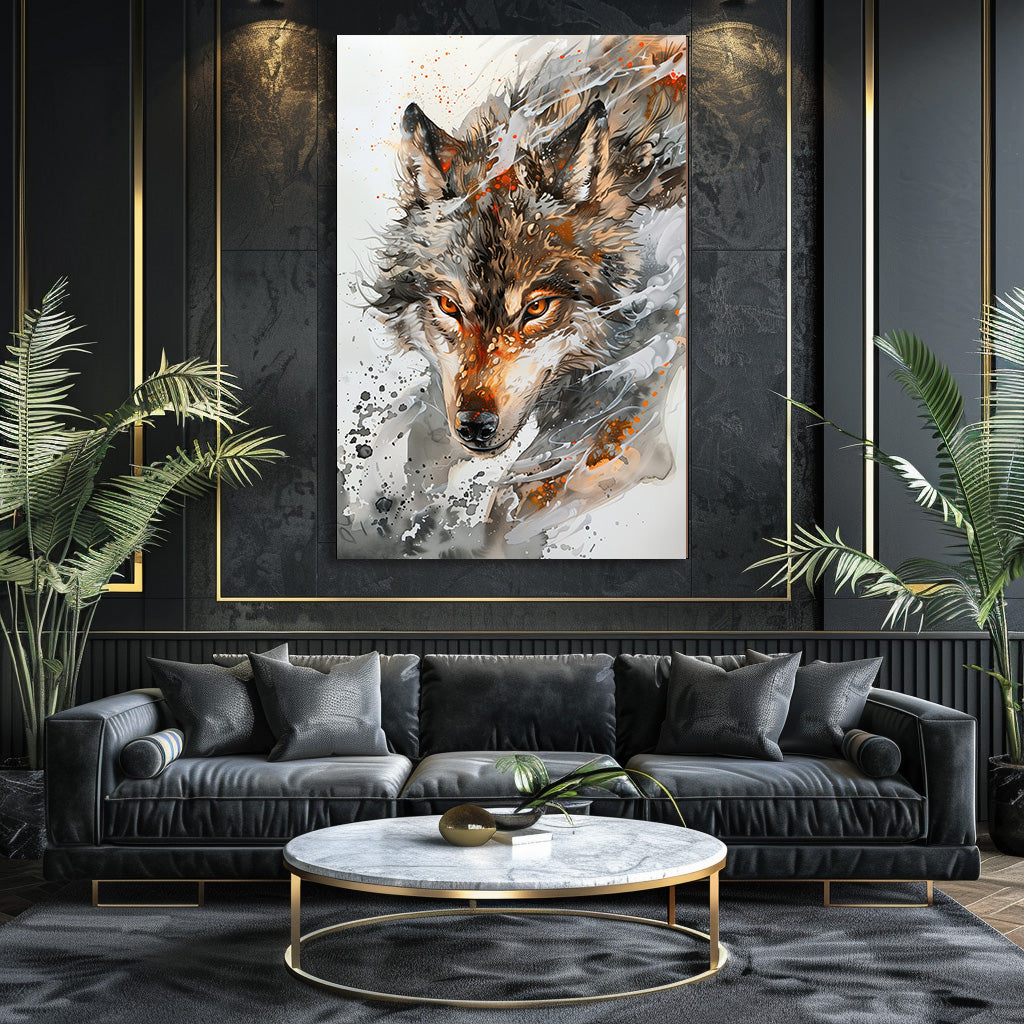 Cette œuvre intense représente un loup surgissant dans un tourbillon de textures et d’éclaboussures. Son regard perçant, les nuances de brun et de gris, et le mouvement créé par les coups de pinceau donnent une impression de force, de liberté et de présence. Un tableau puissant et élégant, idéal pour apporter une touche animale, mystique et contemporaine à votre intérieur.