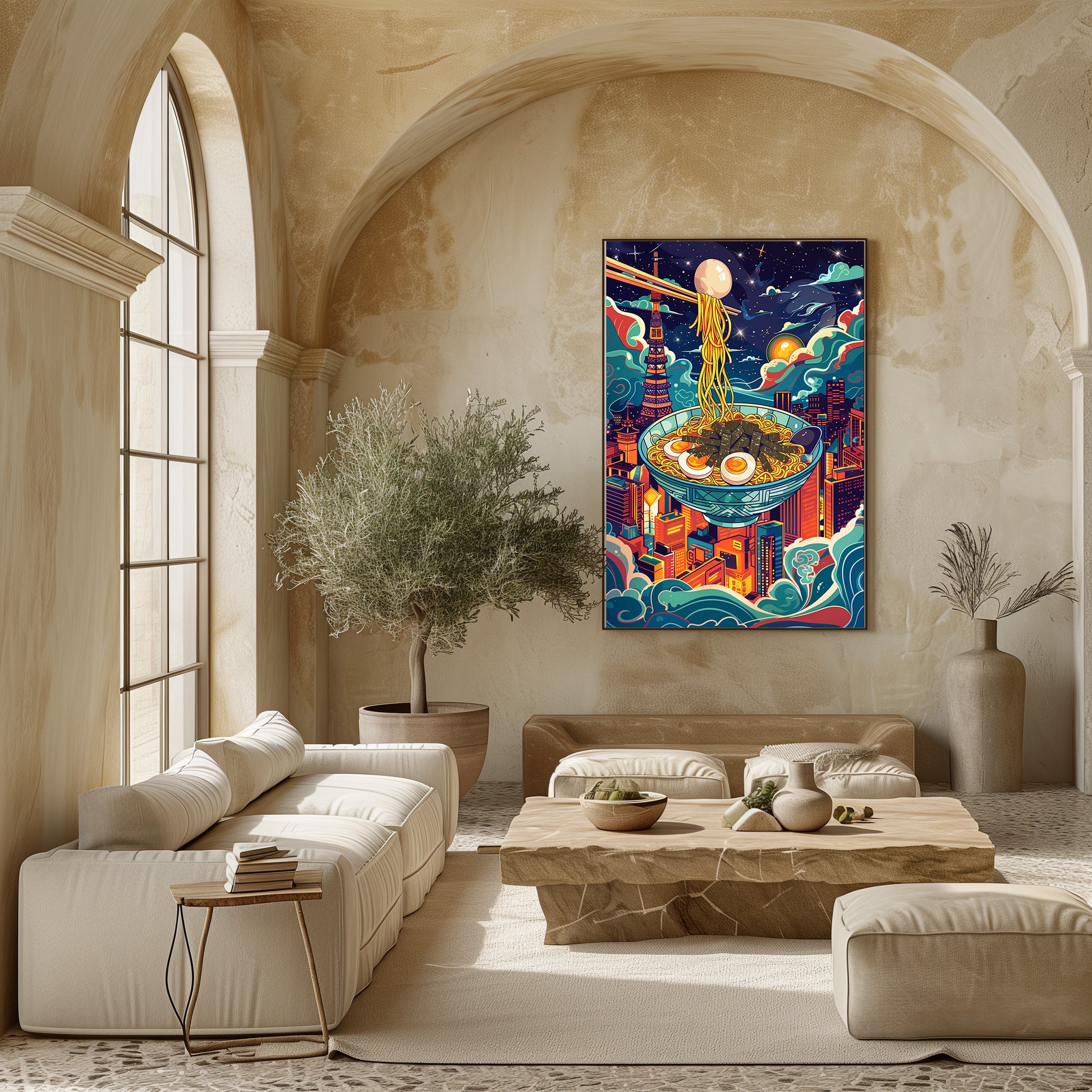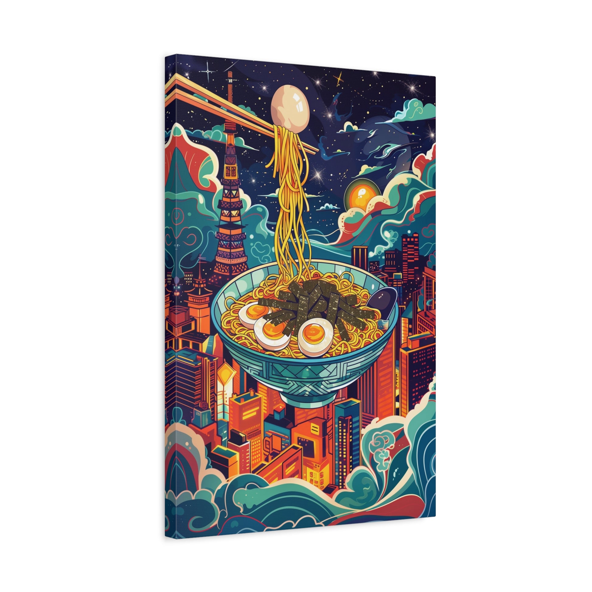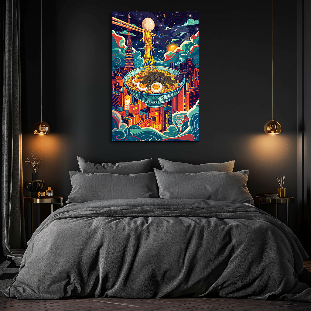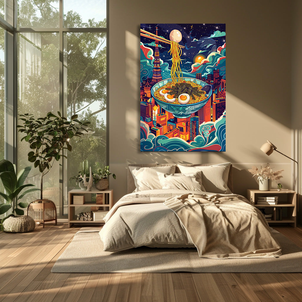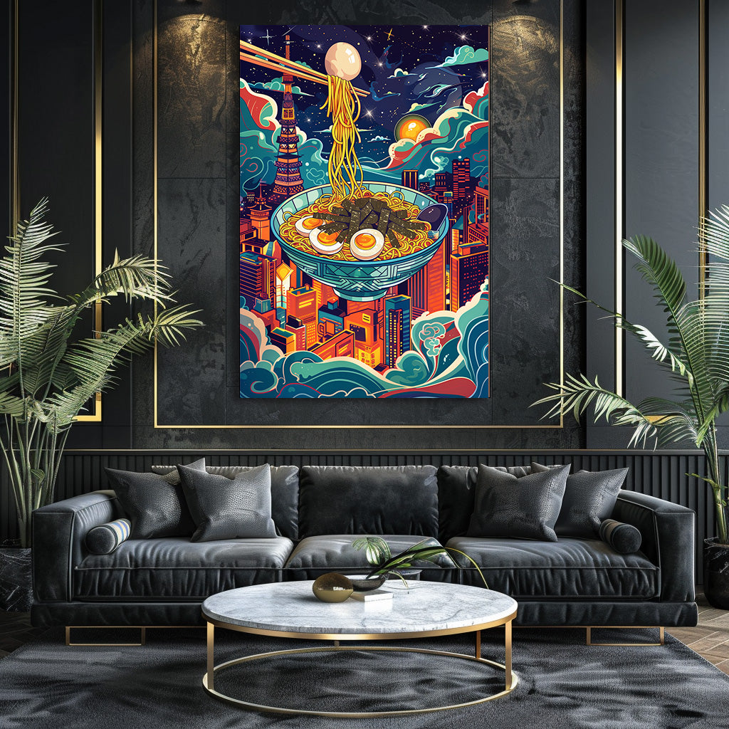 Un bol de ramen flotte au-dessus des gratte-ciel de Tokyo, baigné par la lueur des étoiles et des néons colorés. Cette composition mêle imagination, culture japonaise et ambiance urbaine moderne, créant une scène à la fois gourmande, onirique et vibrante. Un tableau audacieux et plein de vie, parfait pour donner du caractère à une cuisine, un salon ou un espace créatif.