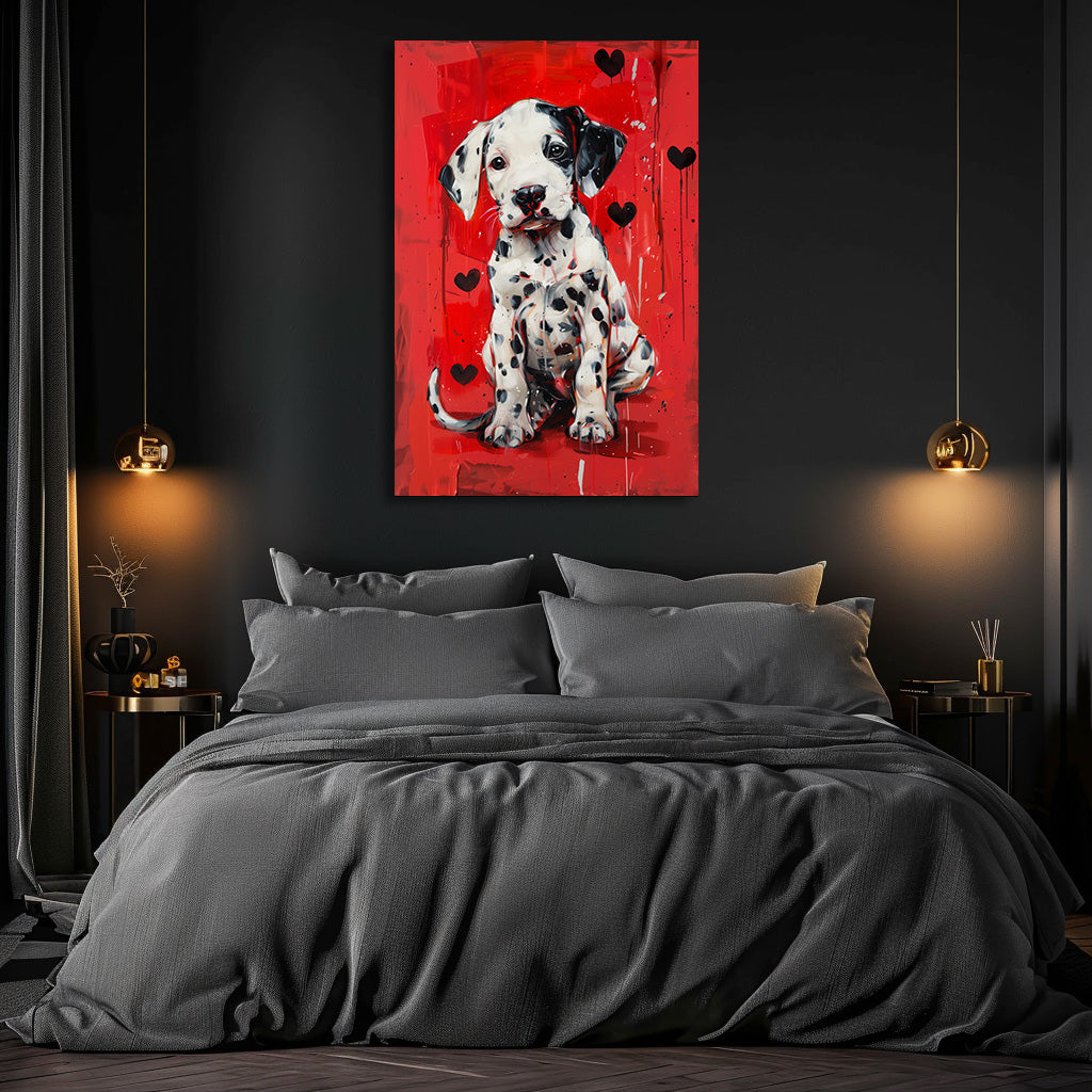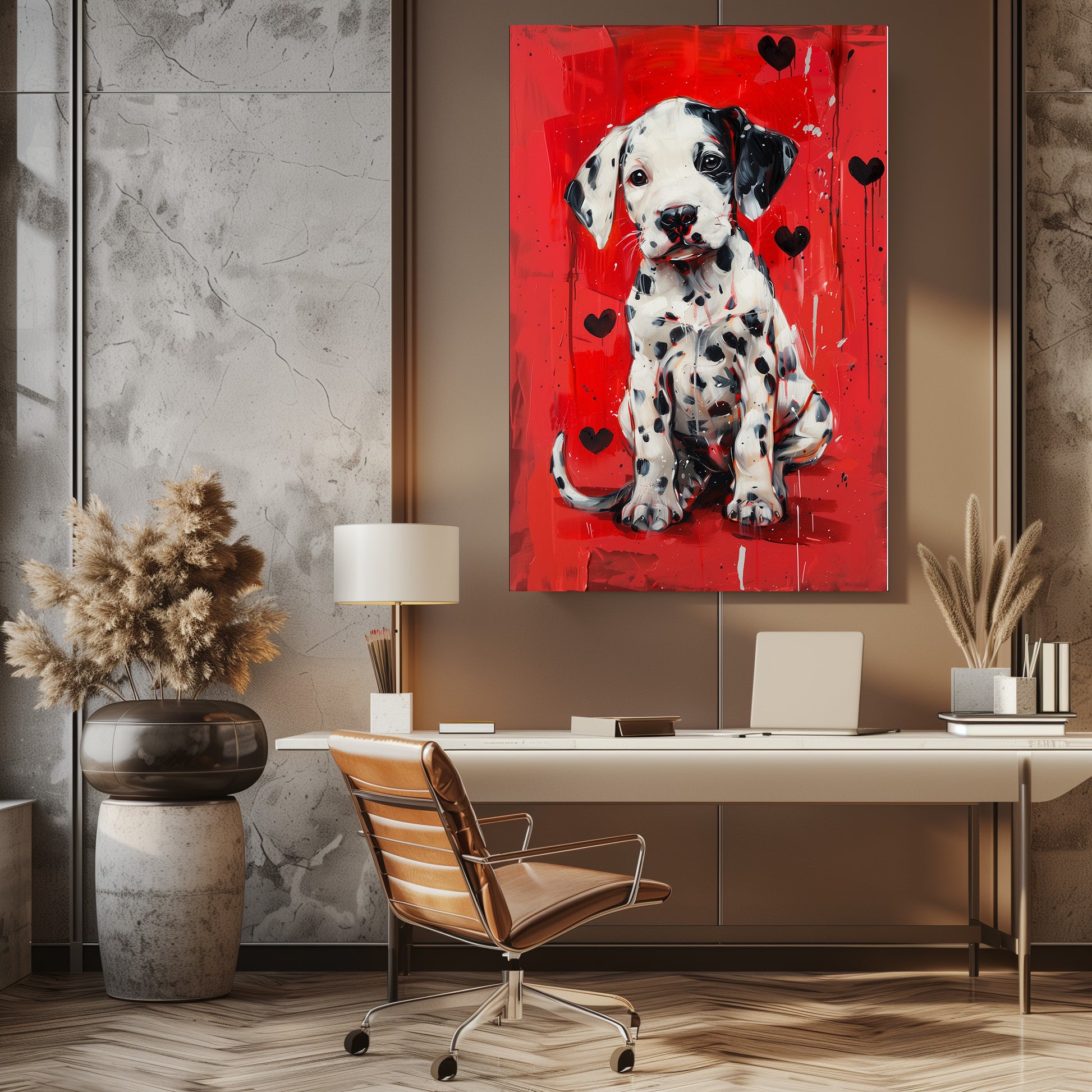 Un chiot dalmatien au regard tendre se détache sur un fond rouge intense, ponctué de cœurs et de touches picturales spontanées. Cette œuvre contemporaine mêle douceur, émotion et modernité dans une composition pleine de caractère. Un tableau expressif, idéal pour apporter une touche chaleureuse et artistique à votre intérieur.