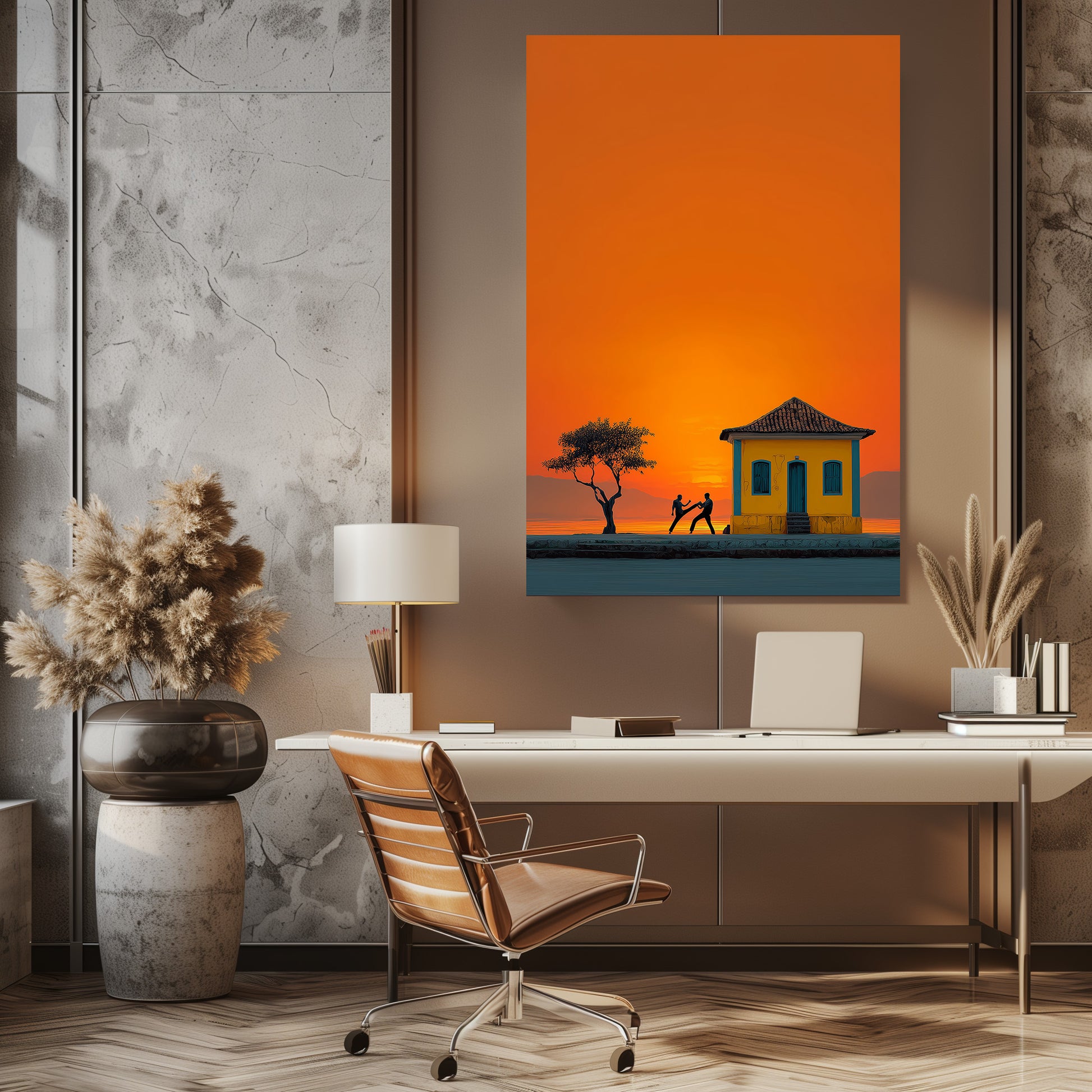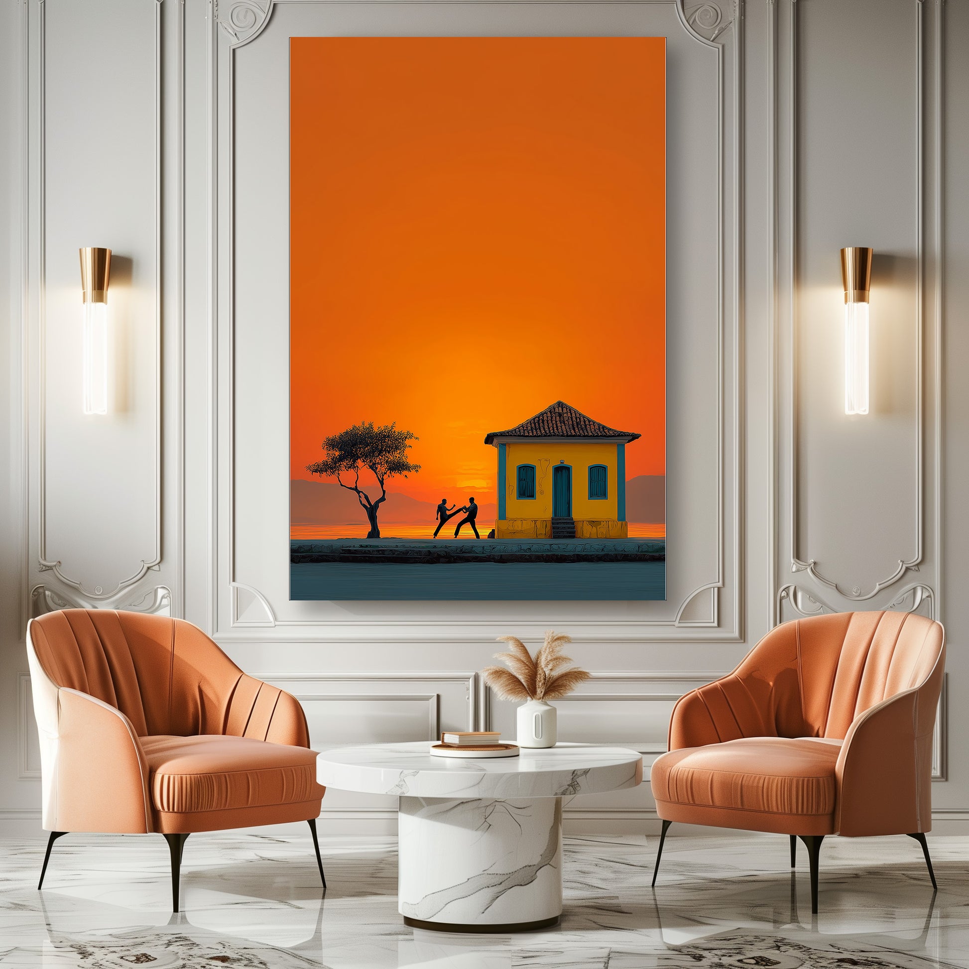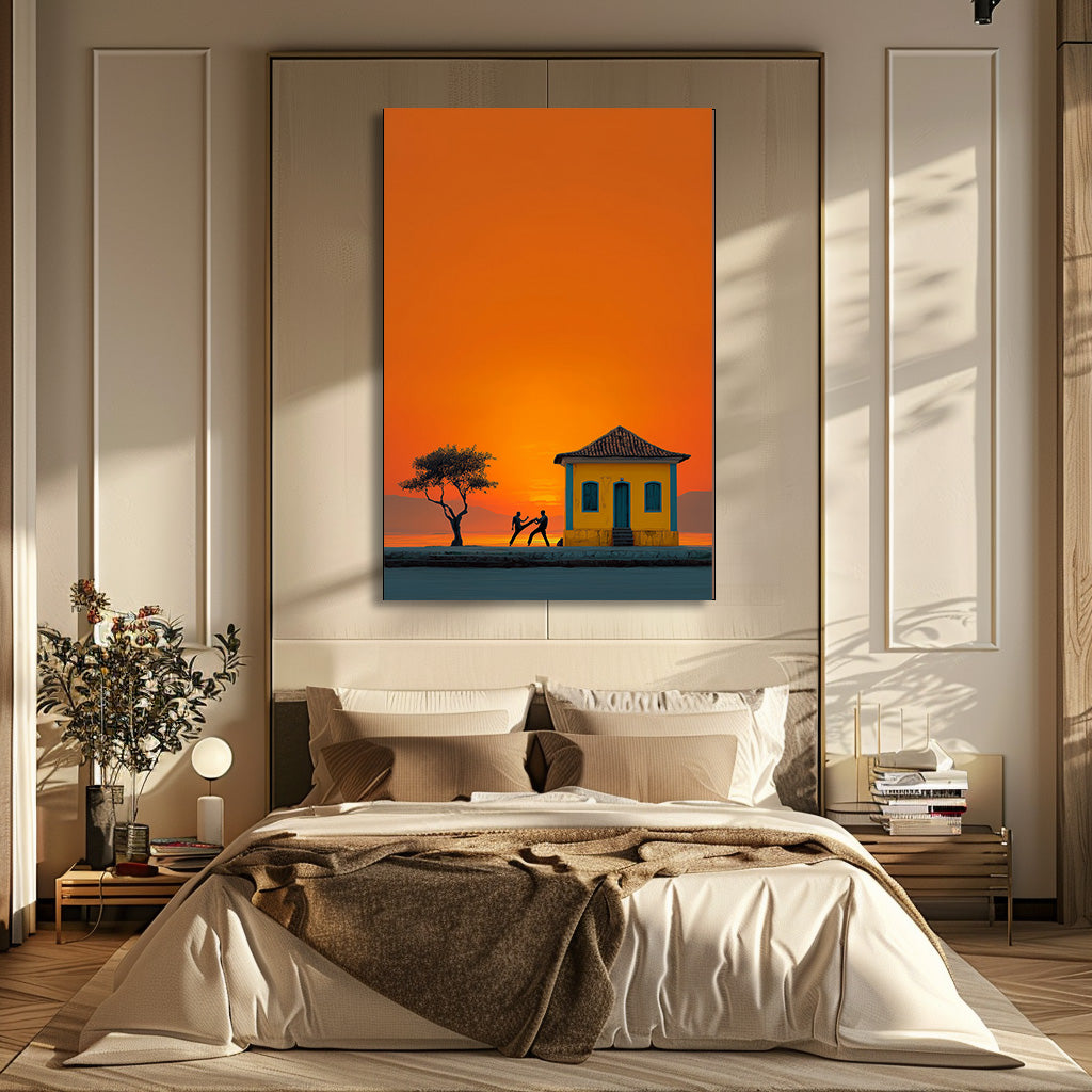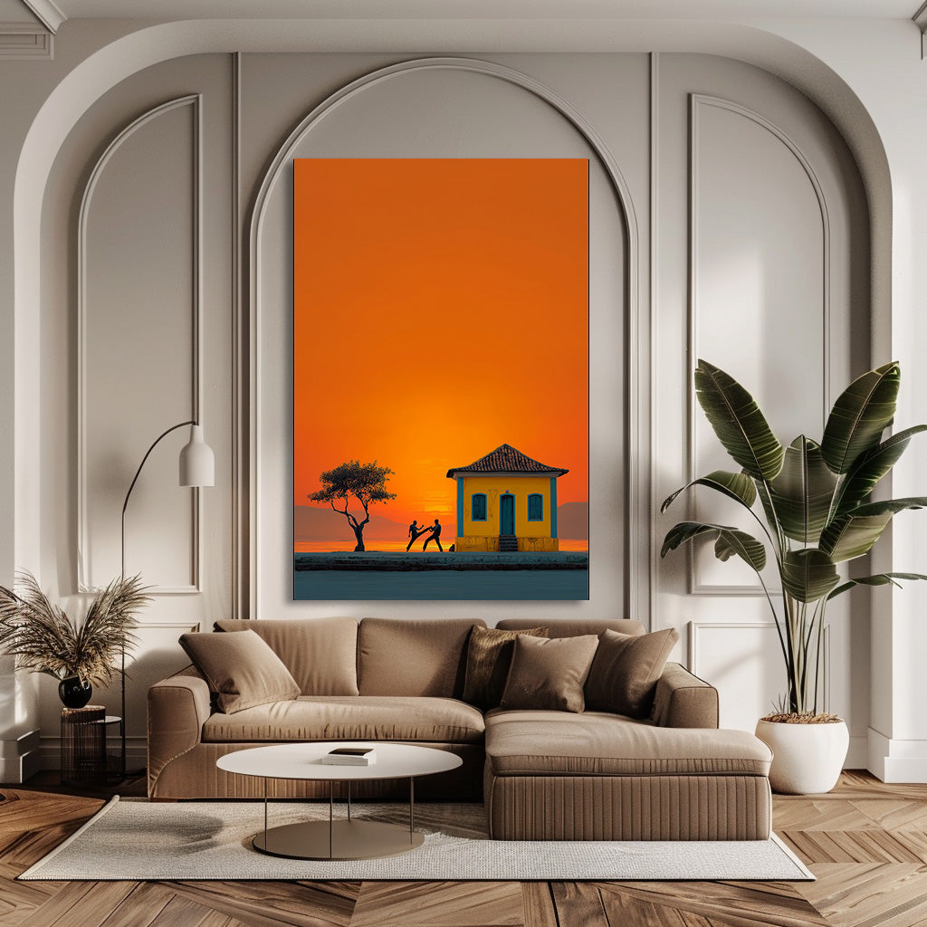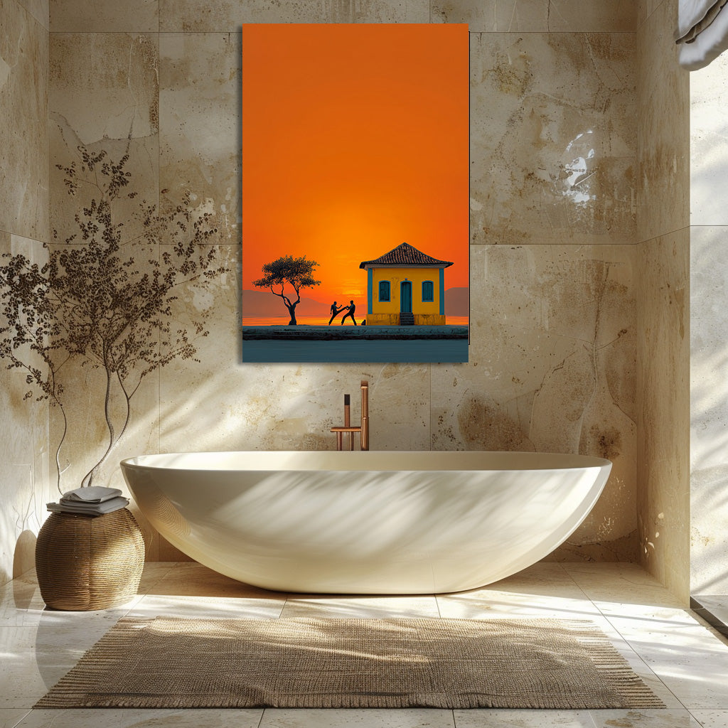 Au coucher du soleil, les silhouettes des danseurs de capoeira se détachent sur un ciel incandescent. Entre mouvement, tradition et lumière dorée, cette œuvre capture la force et la poésie de la culture brésilienne. Un tableau intense et vivant qui apporte rythme et chaleur à votre espace. Une célébration vibrante de l’énergie et de l’âme brésilienne.