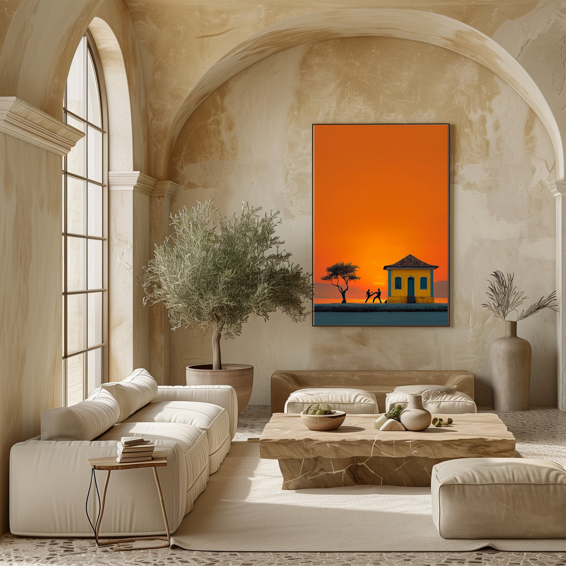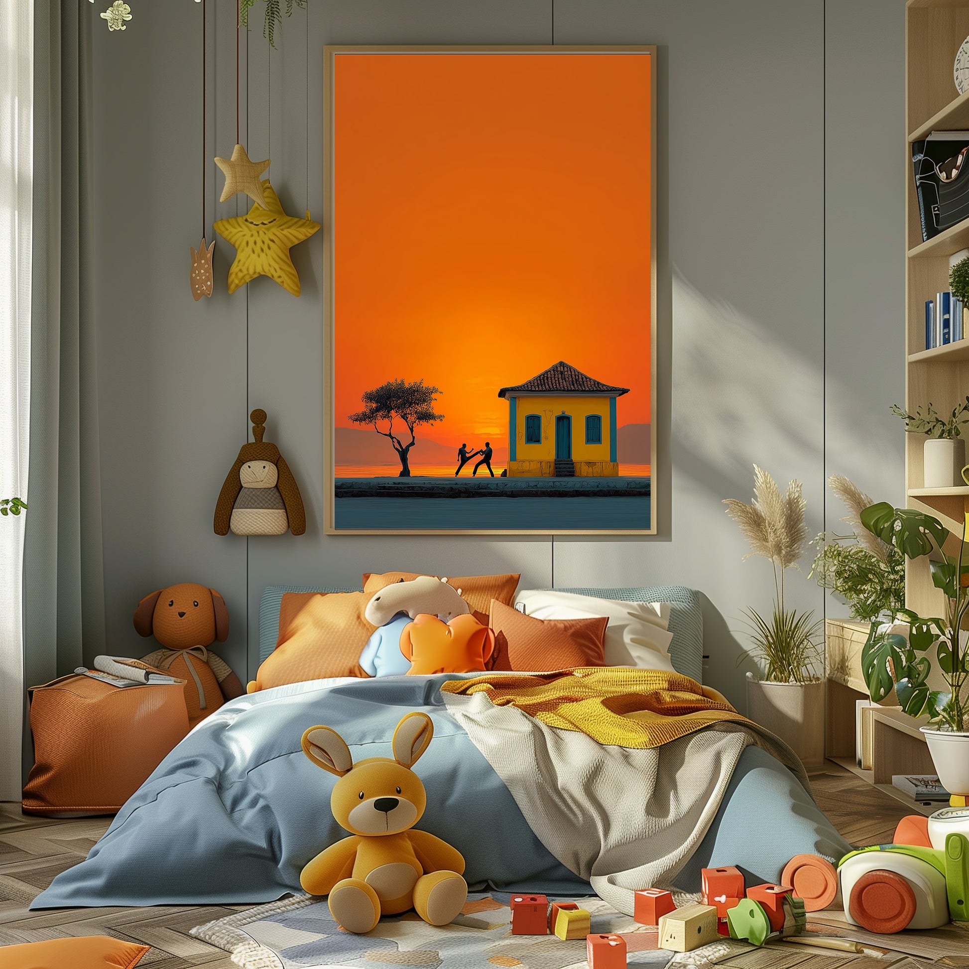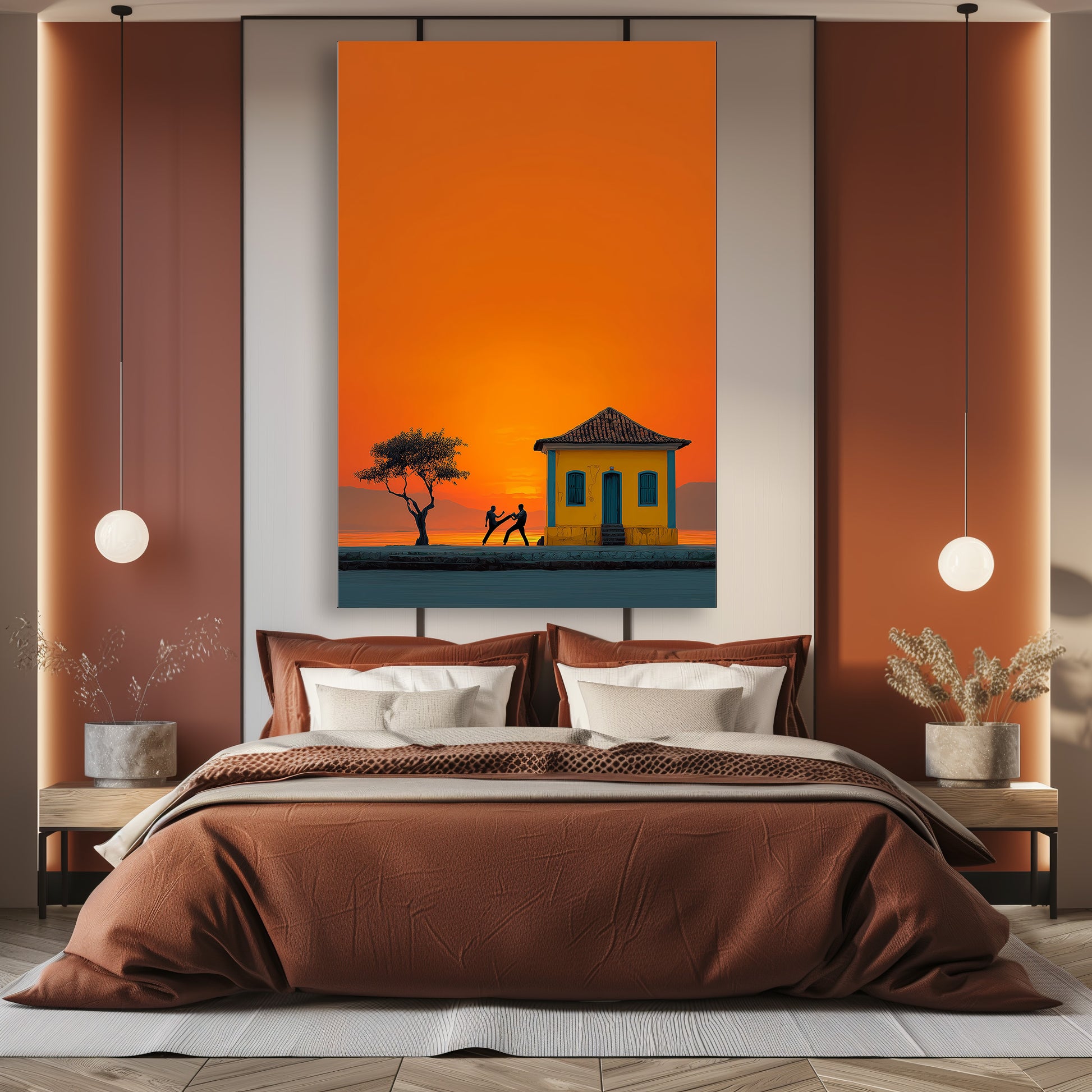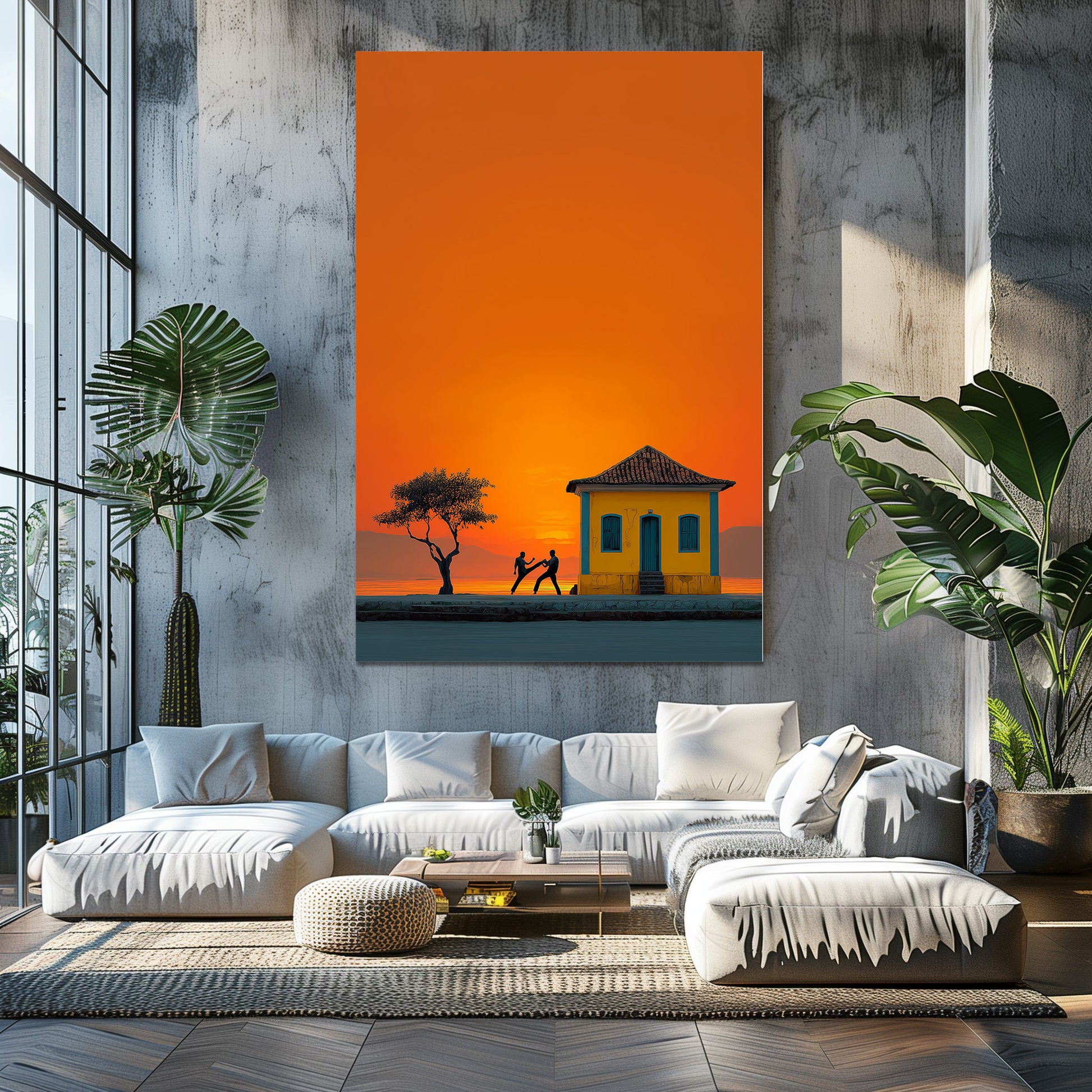Au coucher du soleil, les silhouettes des danseurs de capoeira se détachent sur un ciel incandescent. Entre mouvement, tradition et lumière dorée, cette œuvre capture la force et la poésie de la culture brésilienne. Un tableau intense et vivant qui apporte rythme et chaleur à votre espace. Une célébration vibrante de l’énergie et de l’âme brésilienne.