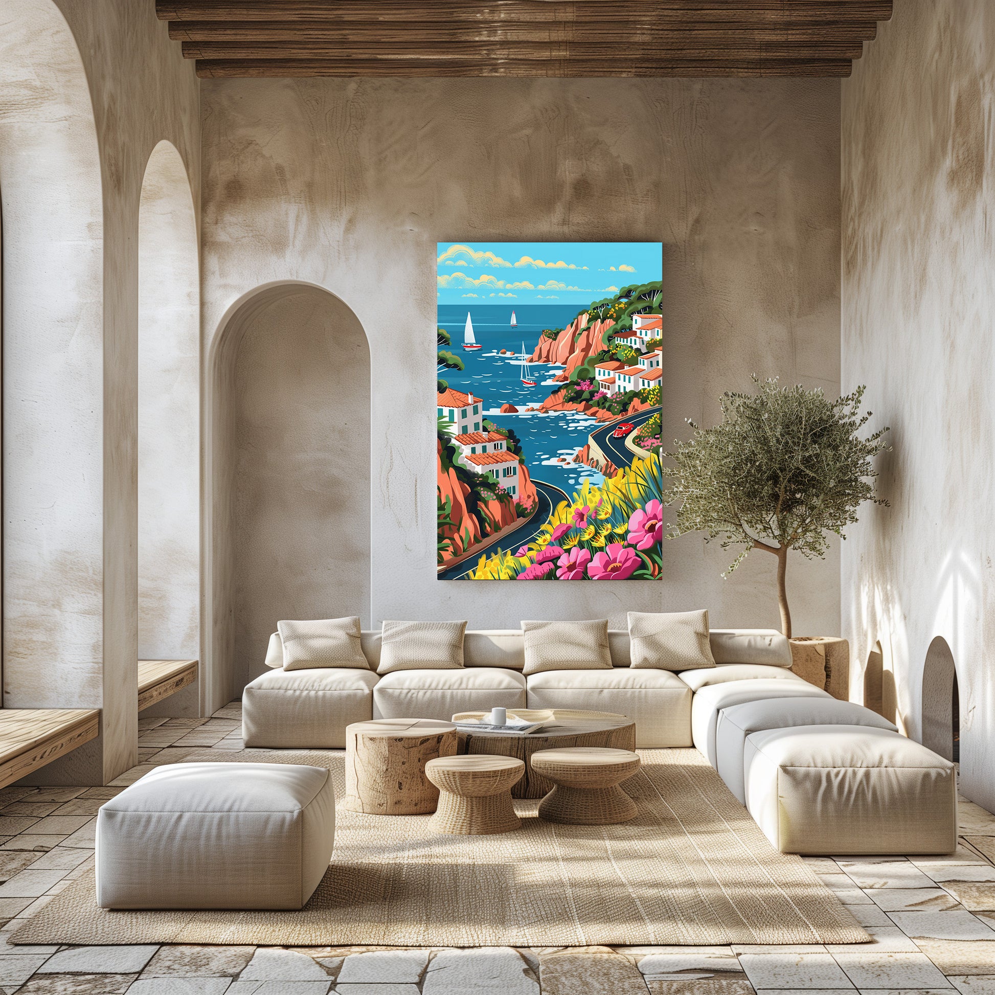 Cette œuvre capture la douceur du sud de la France à travers un paysage méditerranéen lumineux, où les falaises ocre plongent dans une mer azur animée de voiliers. Les maisons blanches aux toits de tuiles rouges épousent la côte, tandis que la route sinueuse invite à l’évasion et au voyage. Un tableau solaire et apaisant, idéal pour apporter une atmosphère chaleureuse et estivale à votre intérieur.