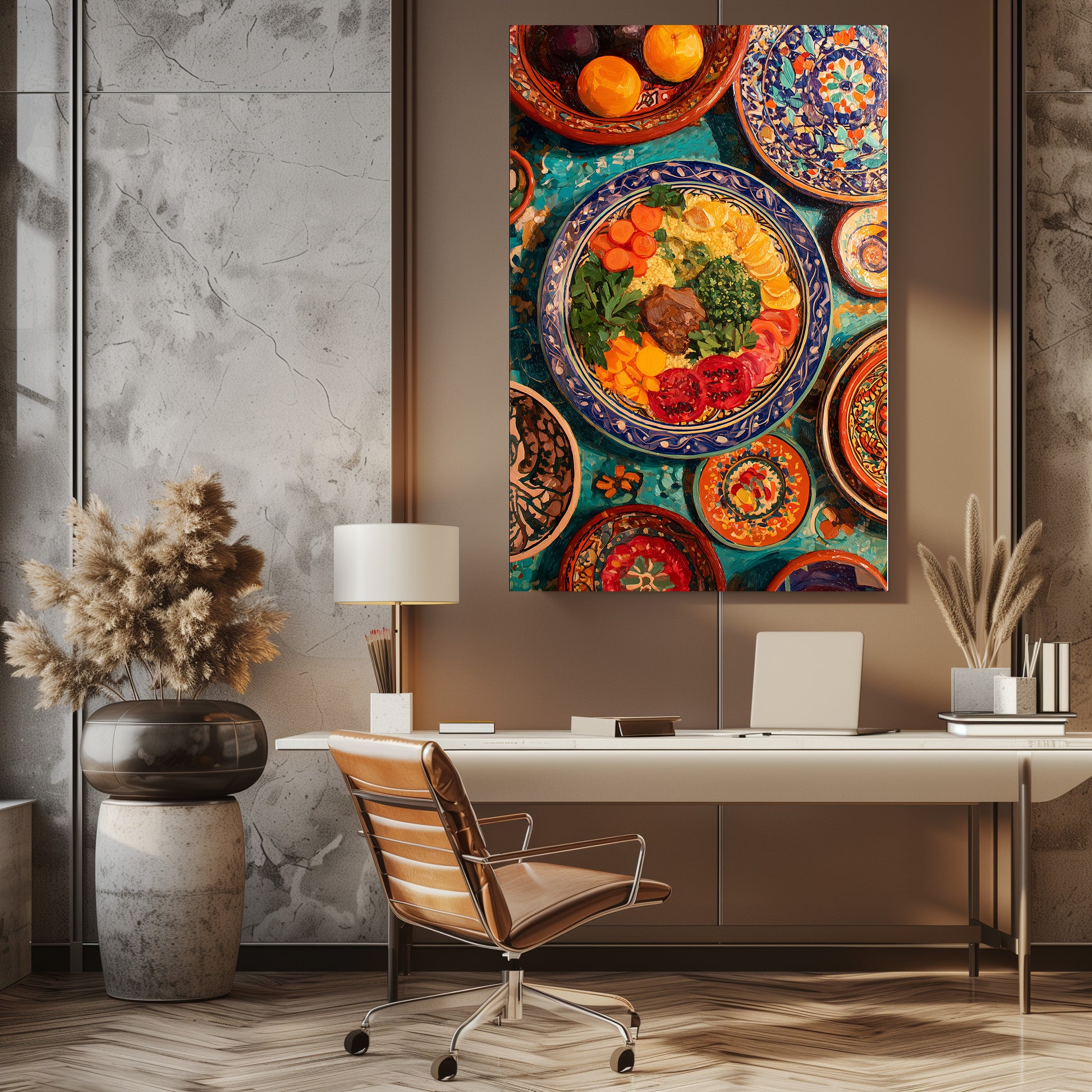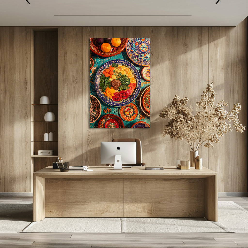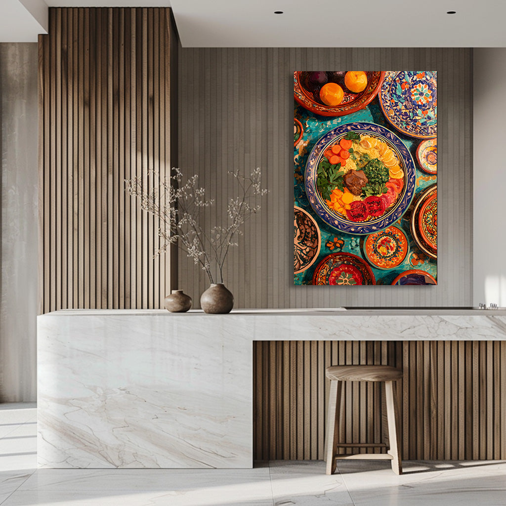 Cette œuvre célèbre la richesse de la cuisine méditerranéenne à travers une composition généreuse aux couleurs vibrantes. Les plats décorés, les textures peintes et les ingrédients disposés avec harmonie évoquent convivialité, tradition et chaleur. Un tableau vivant et gourmand, idéal pour apporter énergie, authenticité et caractère à un intérieur.