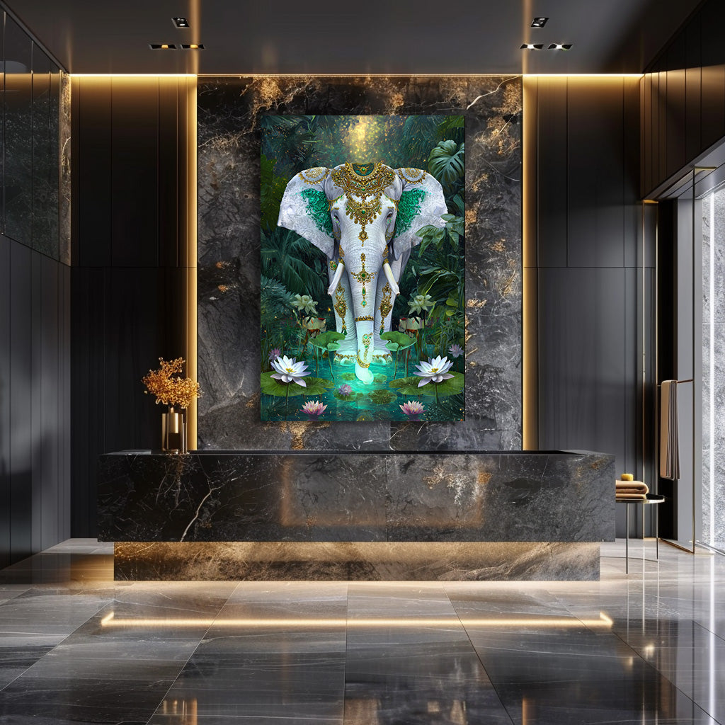 Cette œuvre majestueuse représente un éléphant blanc richement orné de bijoux dorés et d'émeraudes, avançant avec grâce au cœur d’une jungle luxuriante. Autour de lui, un bassin de lotus et une lumière dorée créent une atmosphère mystique et apaisante. Un tableau puissant et raffiné, symbole de sagesse, de pureté et de protection, idéal pour apporter une touche spirituelle et exotique à votre intérieur.