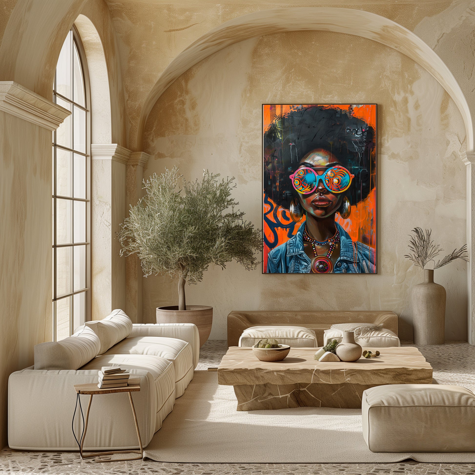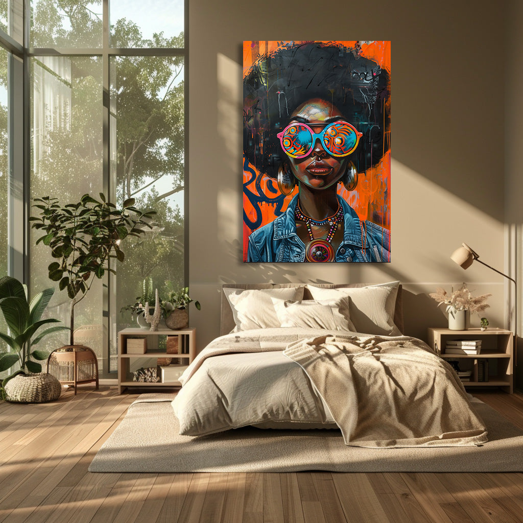 Ce portrait vibrant capture l'essence de la culture urbaine avec audace et caractère. Entre afro iconique, lunettes psychédéliques et fond graffiti flamboyant, cette œuvre mêle street art et art moderne pour créer une pièce pleine d’énergie et d’attitude. Les couleurs éclatantes, les détails minutieux et l'expression puissante du modèle en font un tableau qui transforme instantanément n’importe quel intérieur. Il apporte une touche funky, contemporaine et ultra stylée, parfaite pour un salon, un bureau créatif ou un espace de vie à la personnalité affirmée.