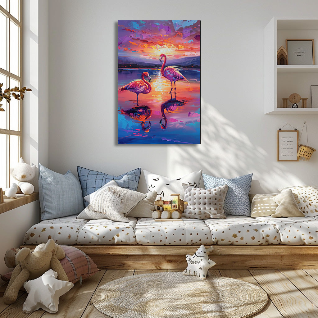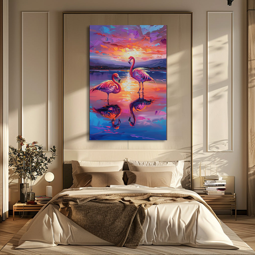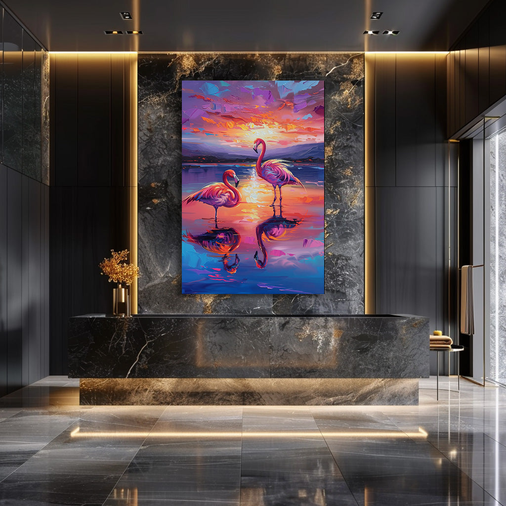 Deux flamants roses se rencontrent au cœur d’un crépuscule flamboyant, où le ciel et l’eau se confondent en un ballet de couleurs chaudes. Les reflets vibrants enveloppent la scène d’une douceur presque magique. Une œuvre qui capture la poésie d’un instant suspendu, entre lumière, sérénité et chaleur tropicale.