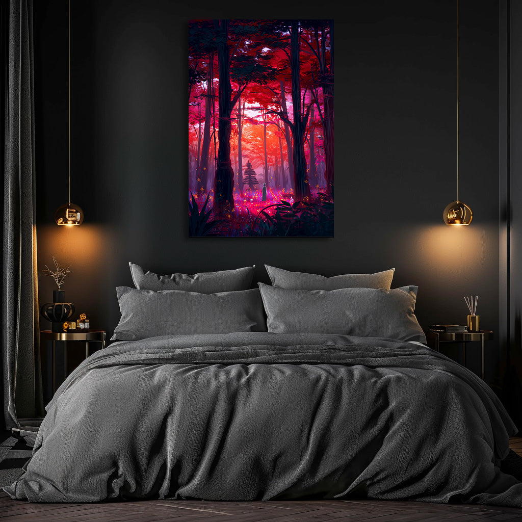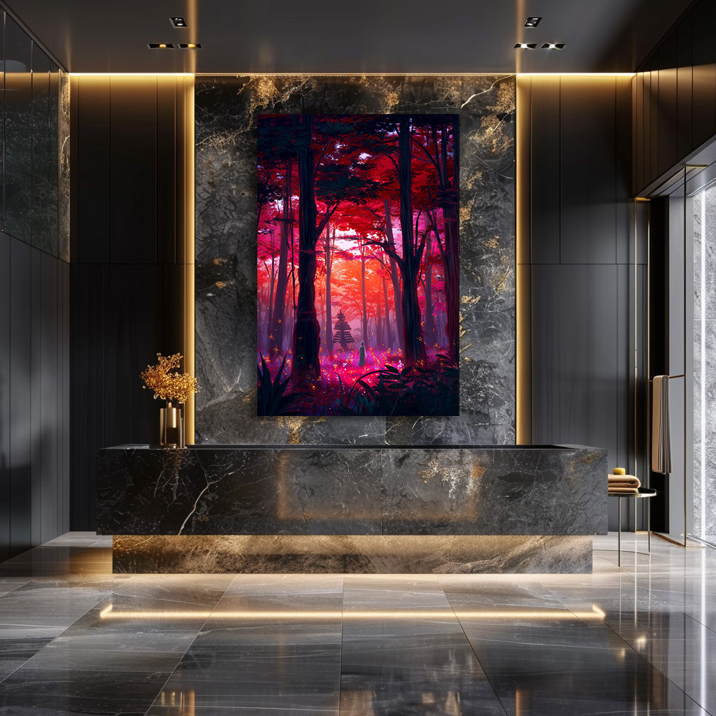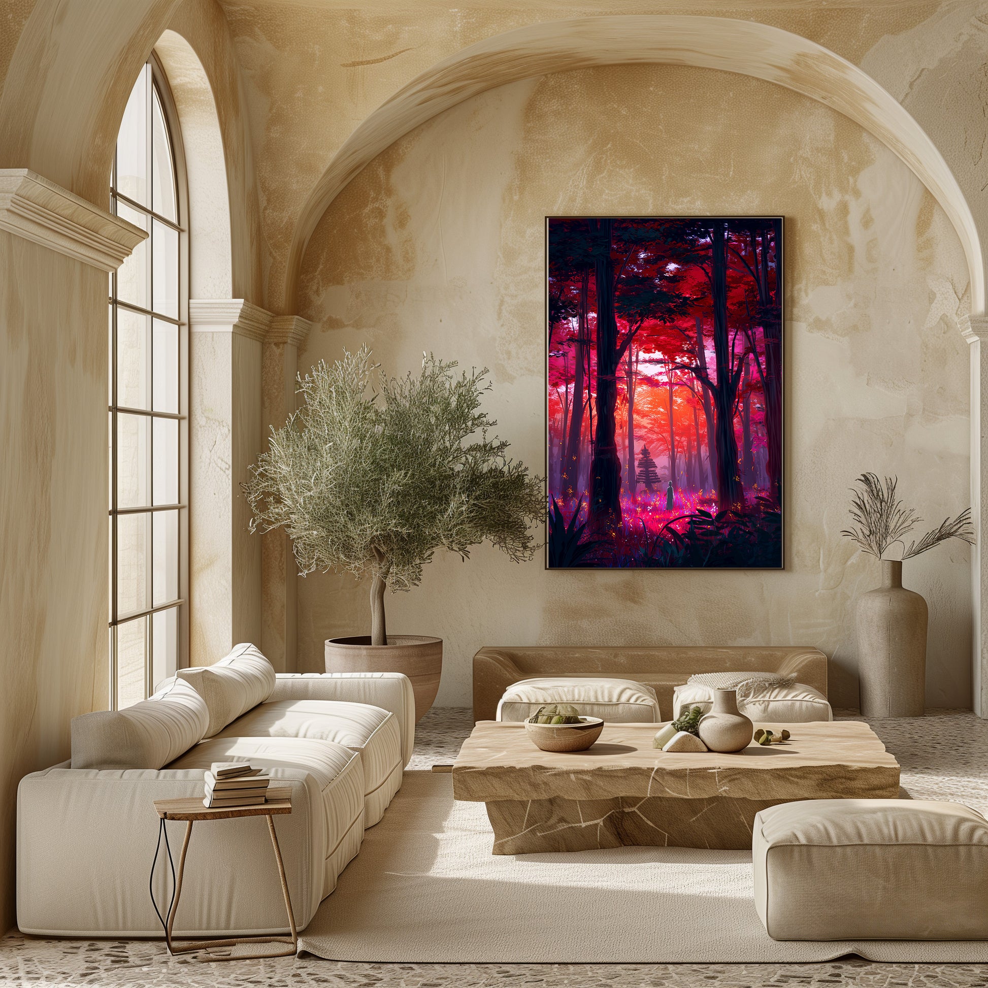 Cette œuvre immersive représente une forêt baignée de teintes rouges et rosées, où une silhouette avance entre les arbres majestueux. De petites lumières scintillantes illuminent le sol et renforcent l’atmosphère magique et mystérieuse du lieu. Un tableau poétique et envoûtant, parfait pour créer une ambiance chaleureuse, féérique et contemplative dans votre intérieur.