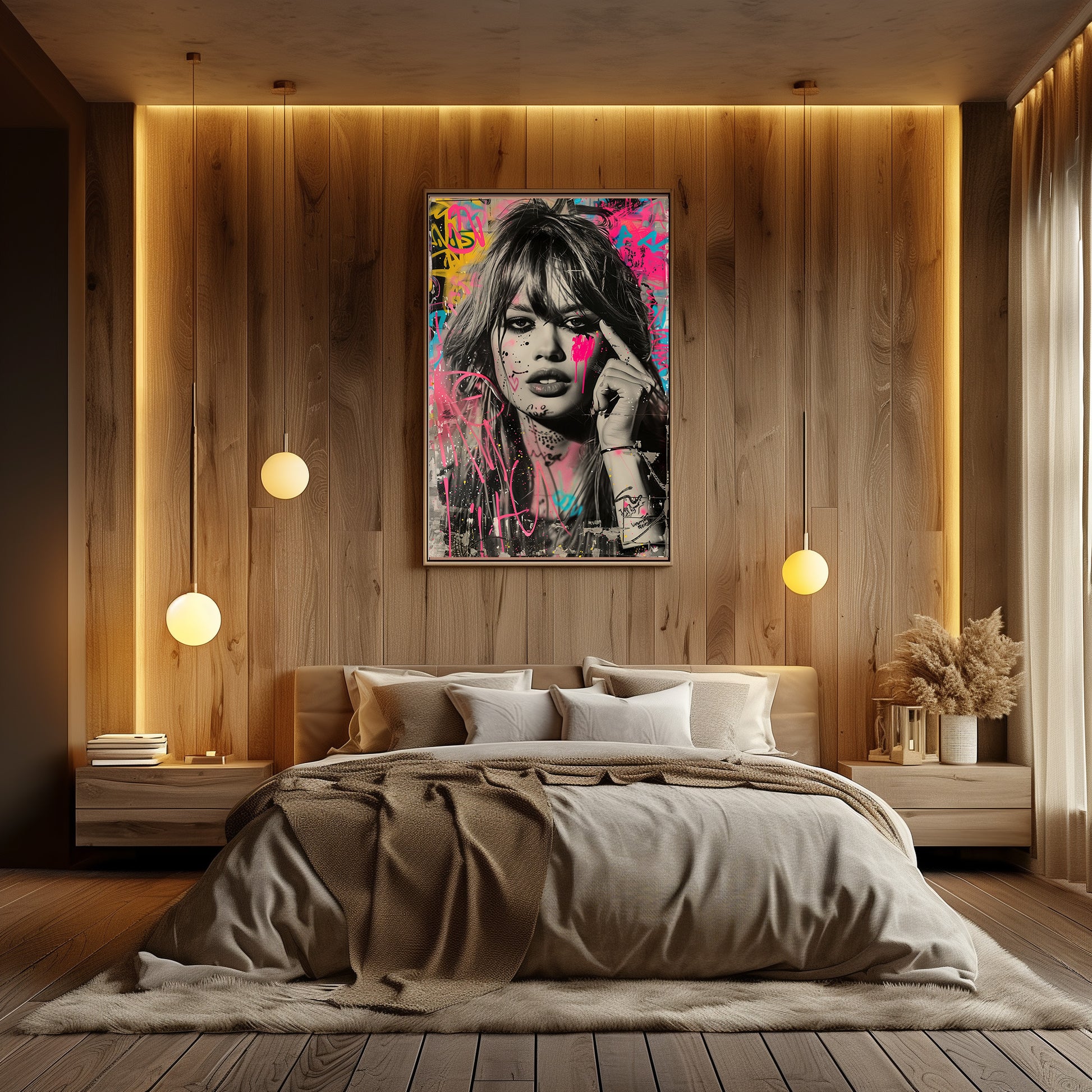 Cette œuvre met en scène un portrait féminin intense, mêlant photographie et interventions graphiques aux accents street art. Les touches de peinture, les symboles et les contrastes de couleurs apportent une dimension brute et contemporaine au regard, à la fois mystérieux et affirmé. Parfait pour apporter une touche urbaine, moderne et expressive à votre intérieur.