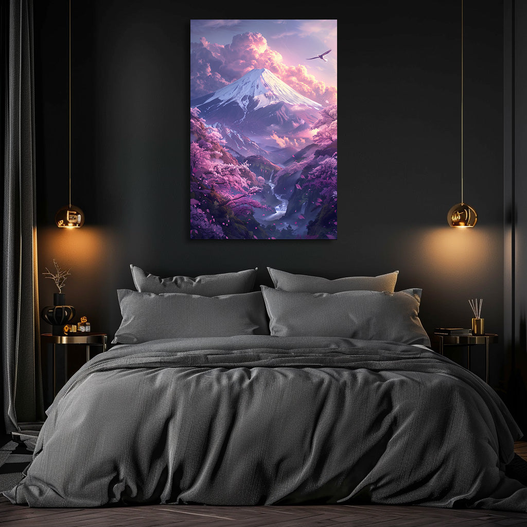 Cette œuvre majestueuse représente une montagne enneigée dominant une vallée de cerisiers en fleurs. Les nuages rosés, la lumière douce et les pétales qui s’envolent créent une atmosphère onirique et paisible. Un oiseau planant dans le ciel ajoute une touche de liberté et d’harmonie. Un tableau poétique et lumineux, idéal pour apporter une ambiance zen, romantique et dépaysante à votre intérieur.