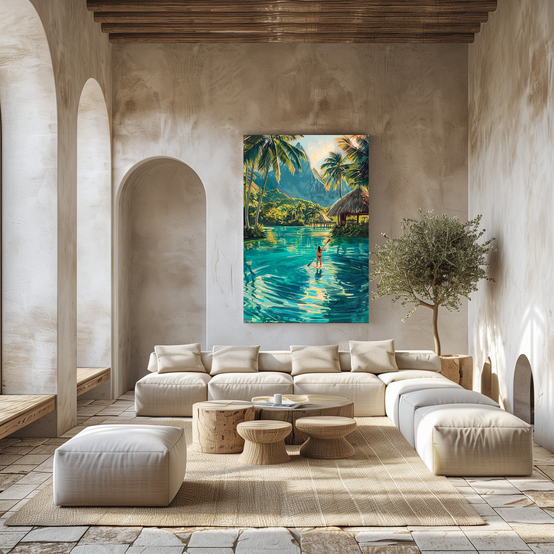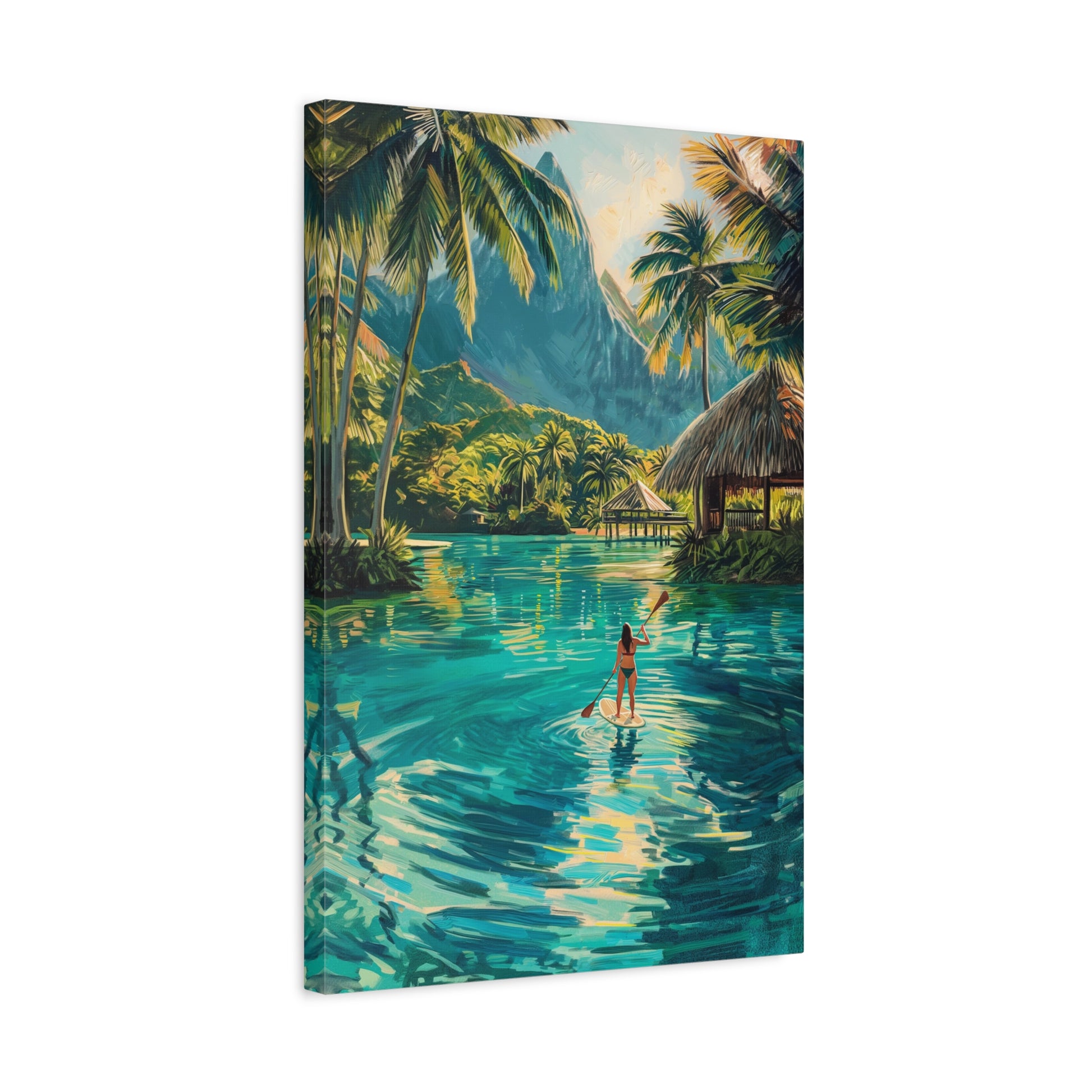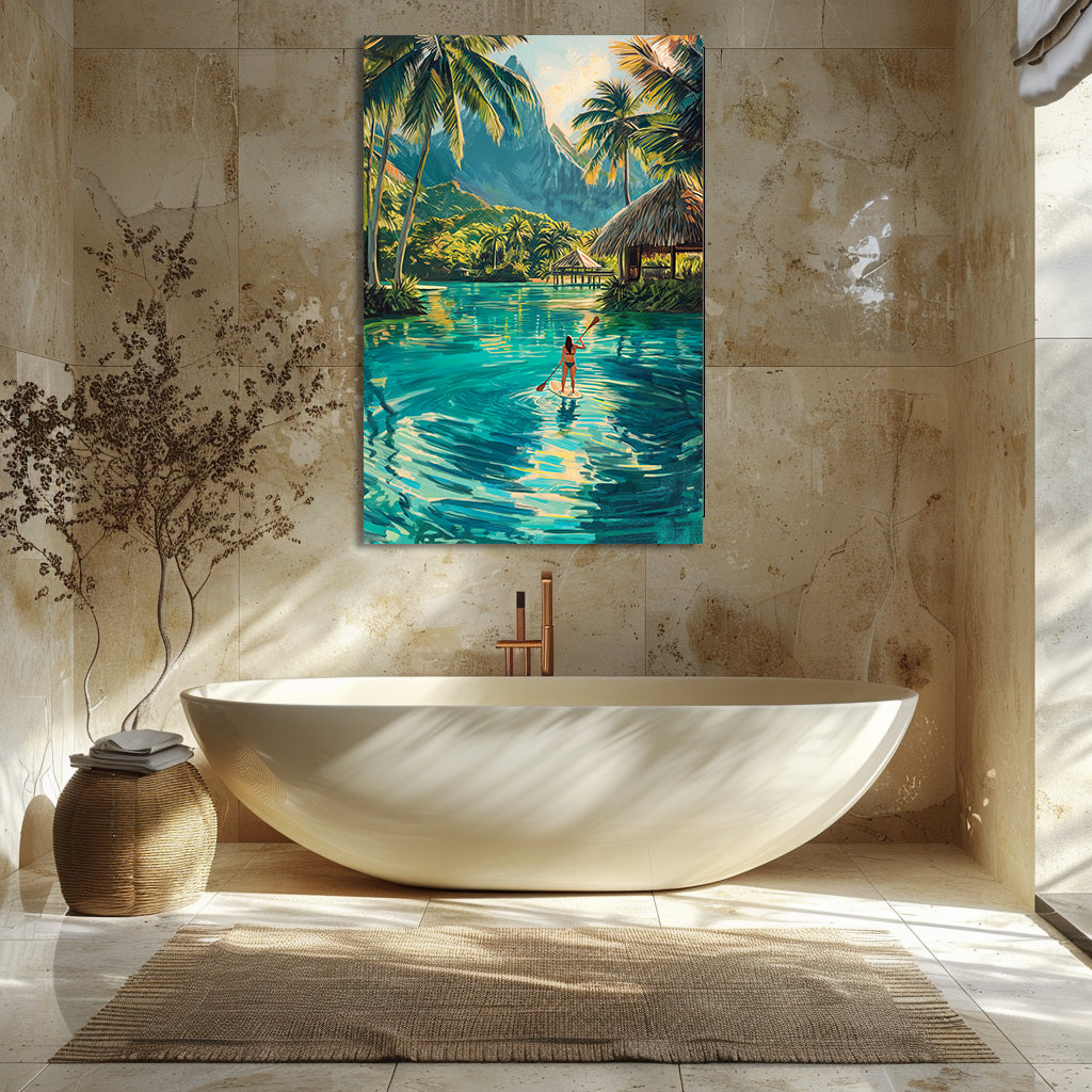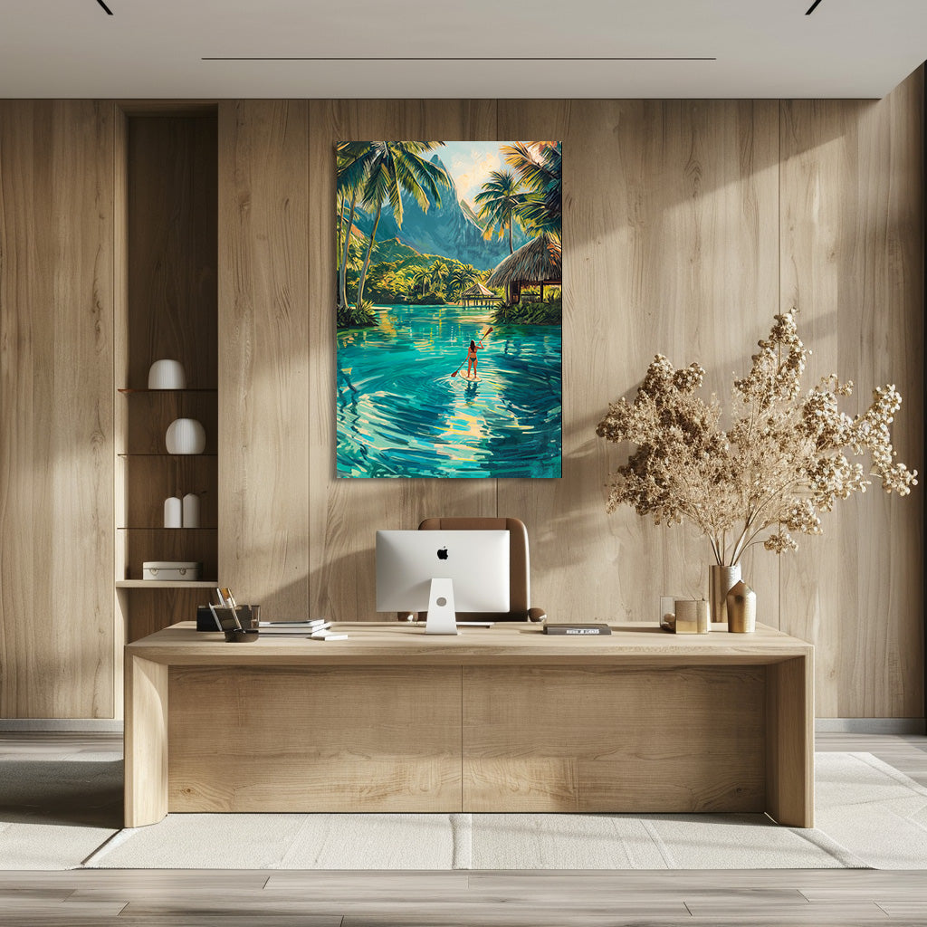 Cette œuvre représente une scène tropicale paisible en Polynésie, où une femme glisse en paddle sur une eau turquoise entourée de palmiers et de montagnes luxuriantes. Les reflets lumineux et les couleurs vibrantes évoquent la liberté, la douceur de vivre et l’évasion. Un tableau apaisant et solaire, idéal pour instaurer une ambiance de vacances et de sérénité.