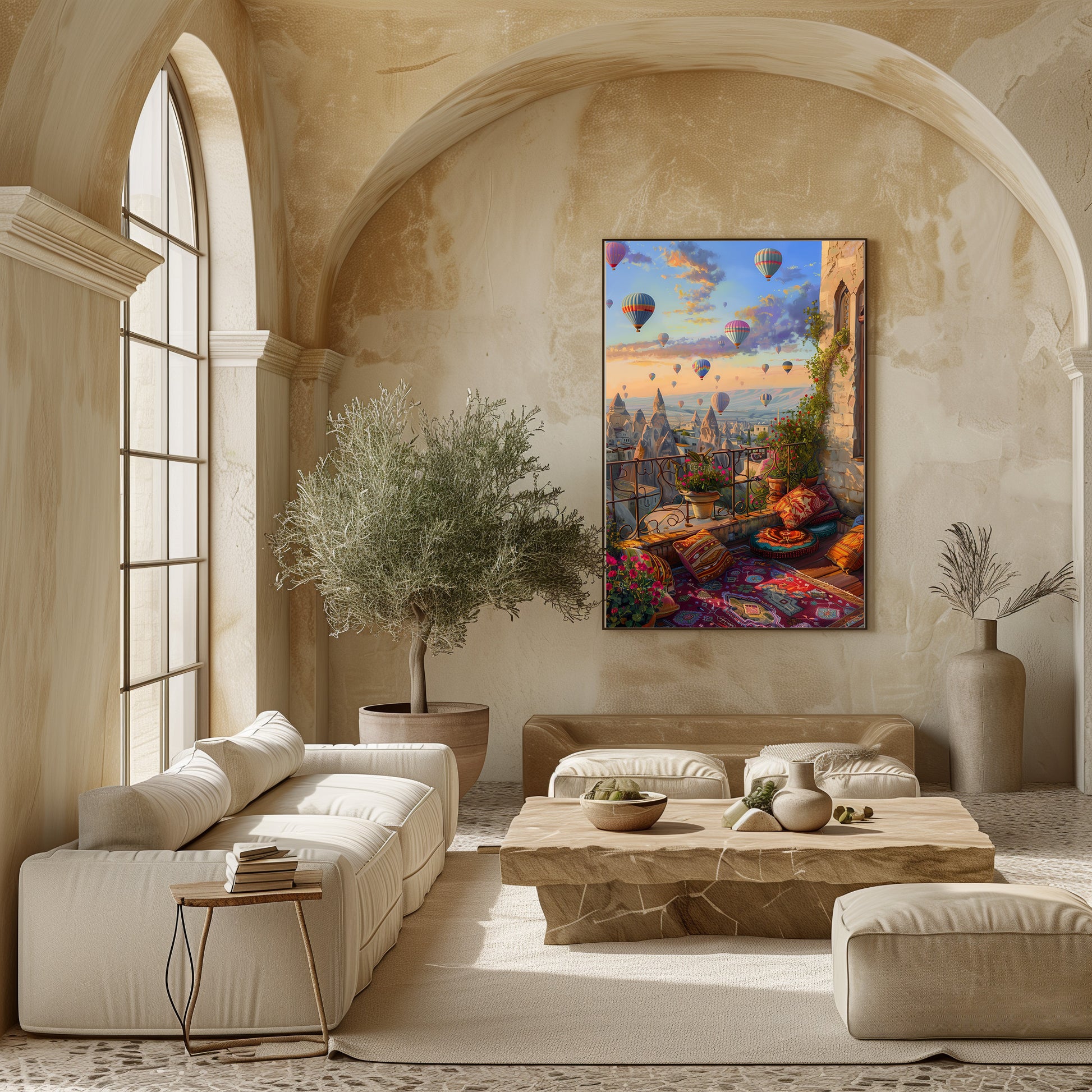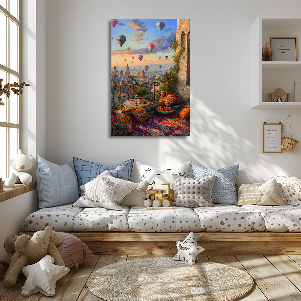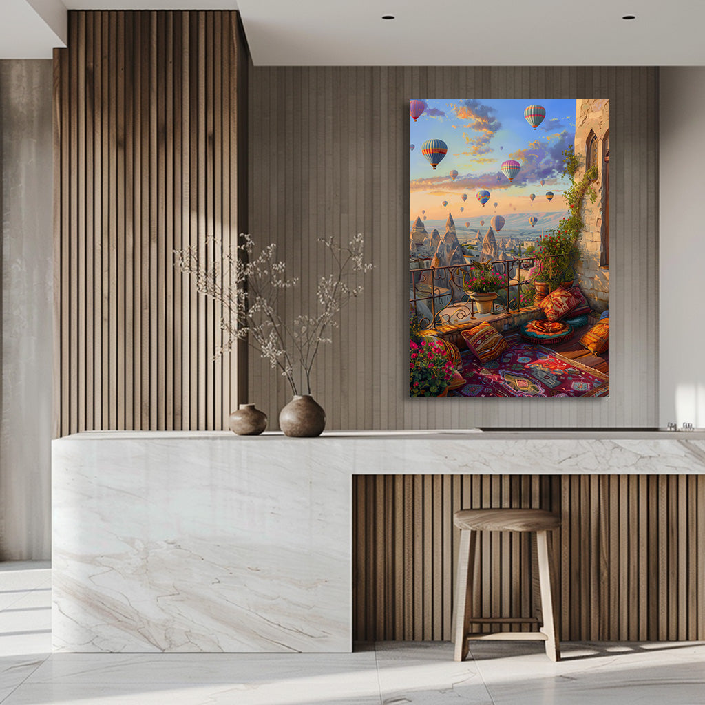 Ce tableau offre une vue chaleureuse depuis une terrasse décorée de tapis et de coussins colorés, donnant sur un paysage rempli de montgolfières au lever du soleil. Les tons dorés et les détails du décor créent une ambiance apaisante et dépaysante. Une pièce qui invite au voyage et transforme votre intérieur en un espace lumineux, doux et inspirant.