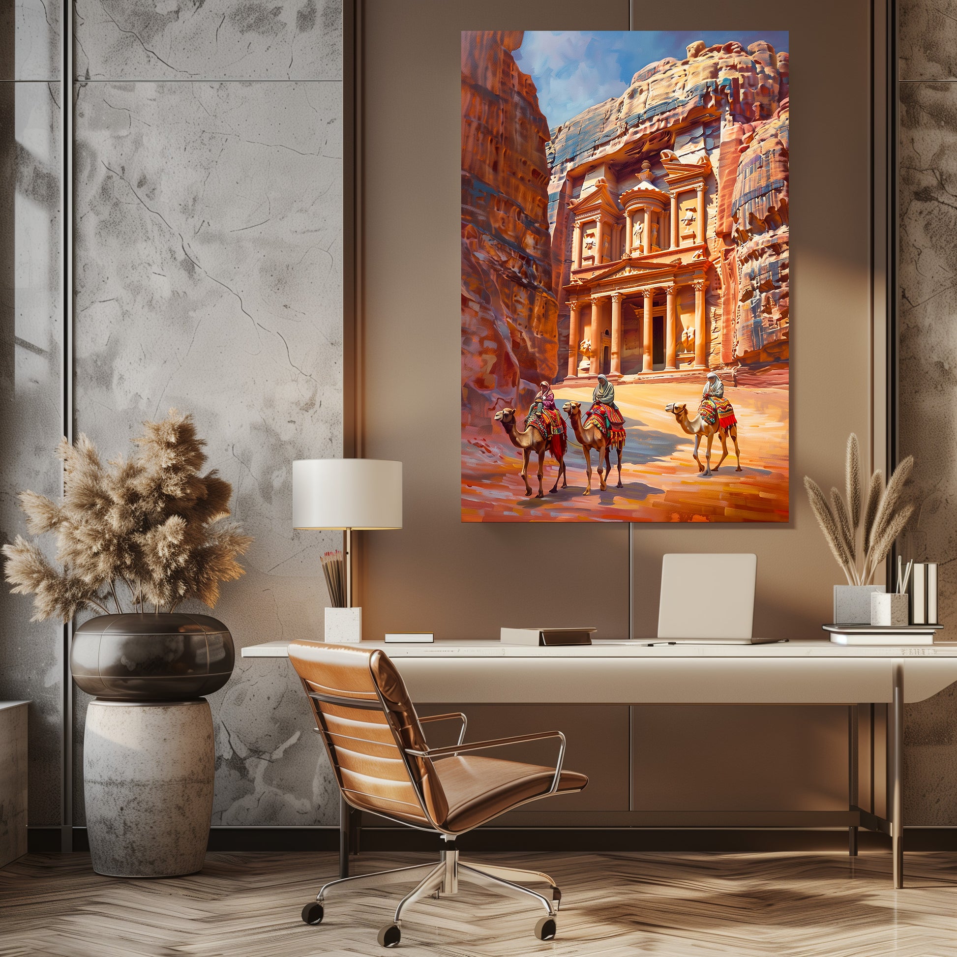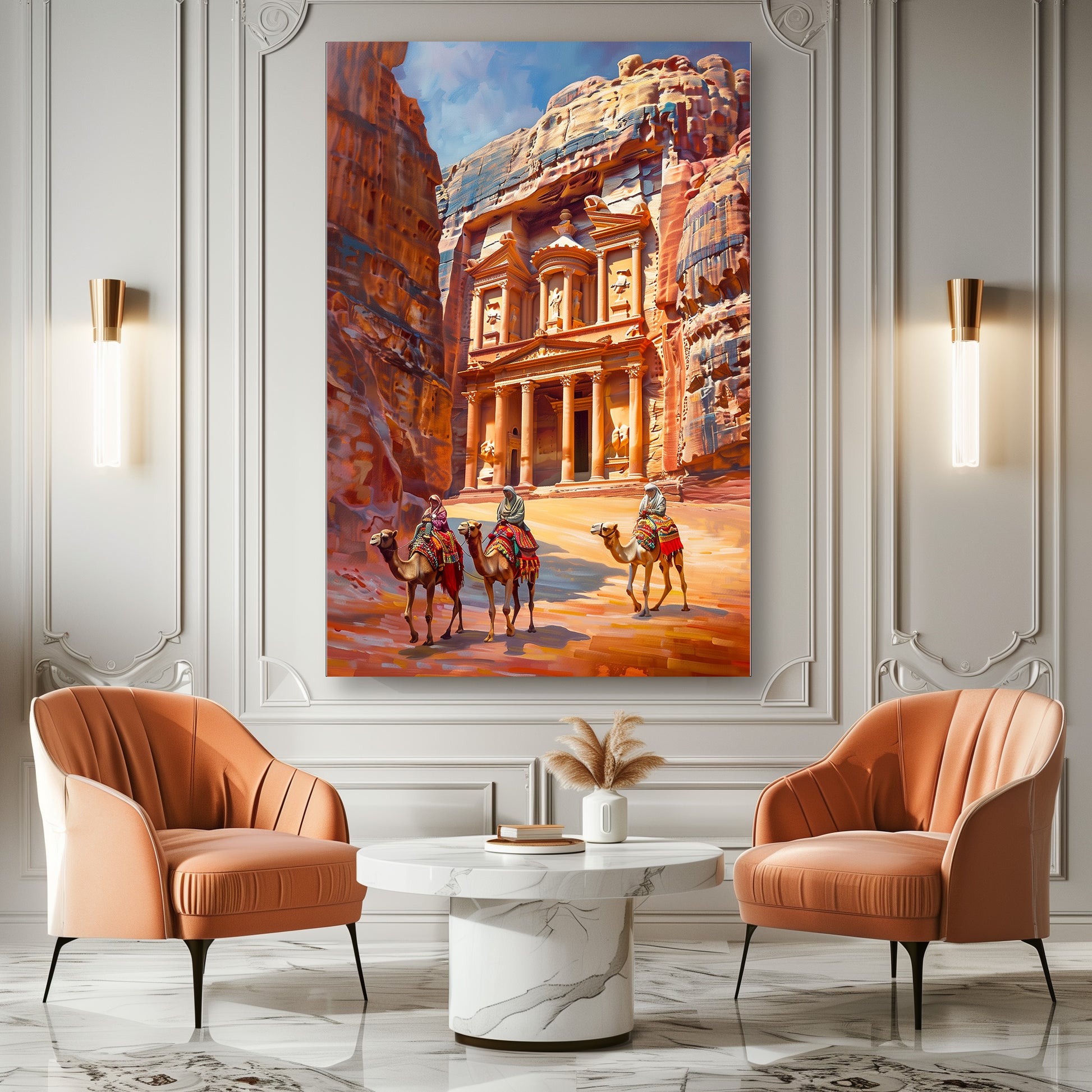 Une scène majestueuse inspirée de Pétra, où la lumière chaude sublime les façades sculptées dans la roche. Les silhouettes et l’architecture millénaire créent une atmosphère à la fois mystique et intemporelle. Une œuvre puissante, idéale pour apporter profondeur et caractère à un intérieur élégant. Un hommage visuel à l’histoire et à la grandeur des civilisations anciennes.