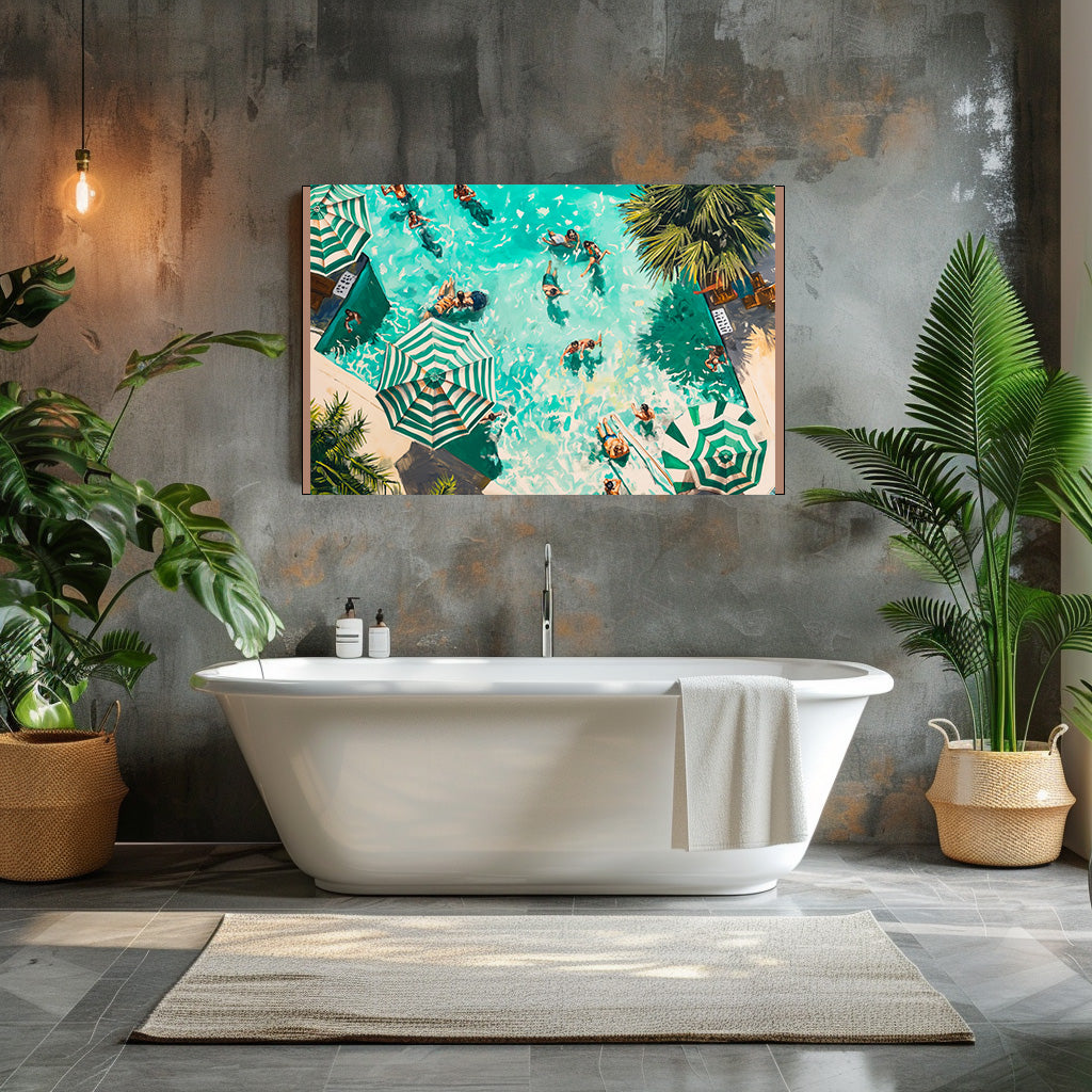 Plongée estivale vue du ciel, cette œuvre capture l’énergie vibrante d’une piscine baignée de soleil. Les parasols graphiques, l’eau turquoise en mouvement et les silhouettes en pleine détente composent une scène vivante et lumineuse. Une création qui évoque les vacances, la chaleur et l’insouciance, idéale pour apporter une touche fraîche, joyeuse et contemporaine à un intérieur.