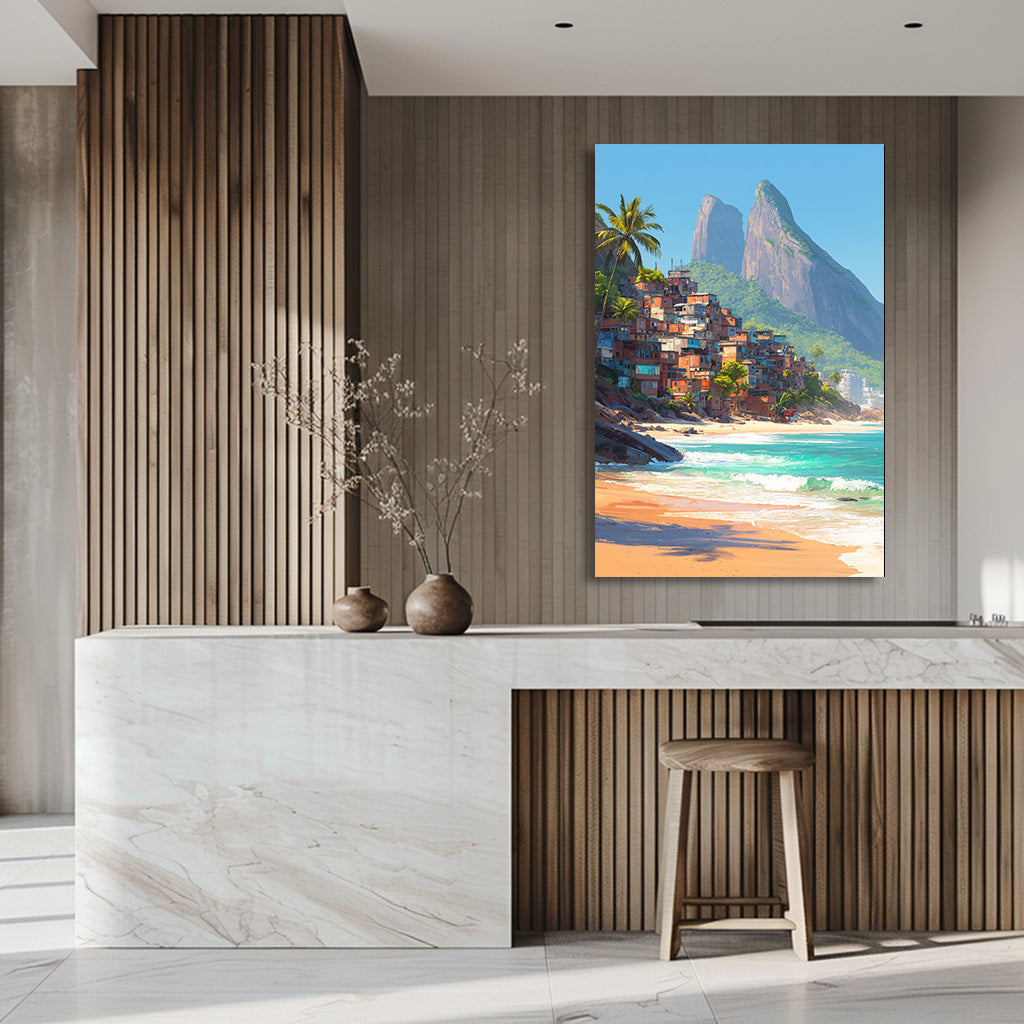Cette œuvre capture l’énergie vibrante de Rio de Janeiro, où une favela colorée s’élève au bord de l’océan sous le regard majestueux des montagnes emblématiques de la ville. La lumière tropicale, la plage dorée et les eaux turquoise créent une atmosphère chaude et vivante, symbole du rythme et de la culture brésilienne. Entre nature spectaculaire et vie urbaine intense, la scène évoque l’âme unique de Rio. Un tableau lumineux et dépaysant, idéal pour apporter caractère, voyage et énergie à un intérieur.