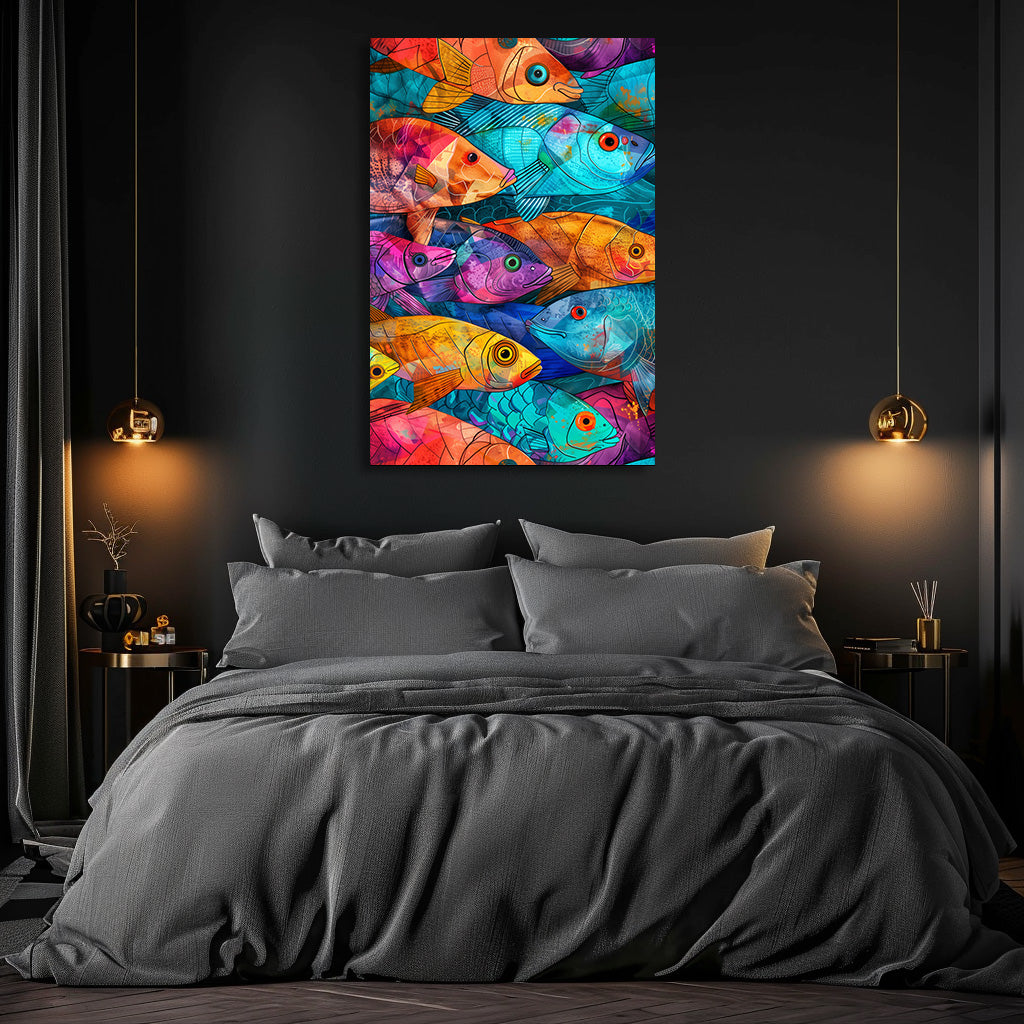 Ce tableau célèbre la richesse et la diversité du monde marin à travers une composition foisonnante de poissons aux couleurs éclatantes. Les superpositions de teintes et de formes créent un rythme visuel captivant, entre mouvement et harmonie. Une œuvre joyeuse et contemporaine qui insuffle énergie et vitalité à l’espace.