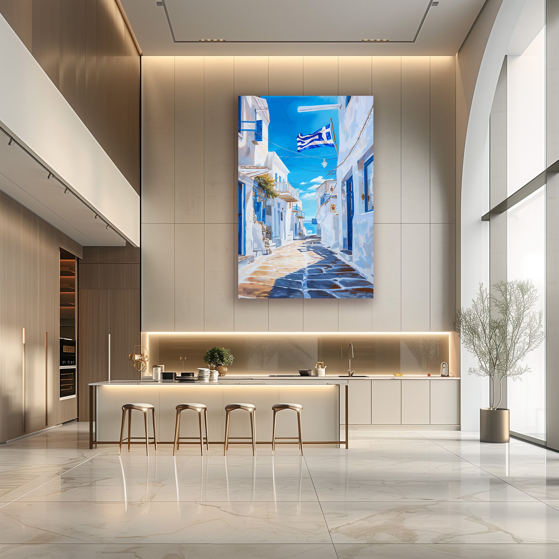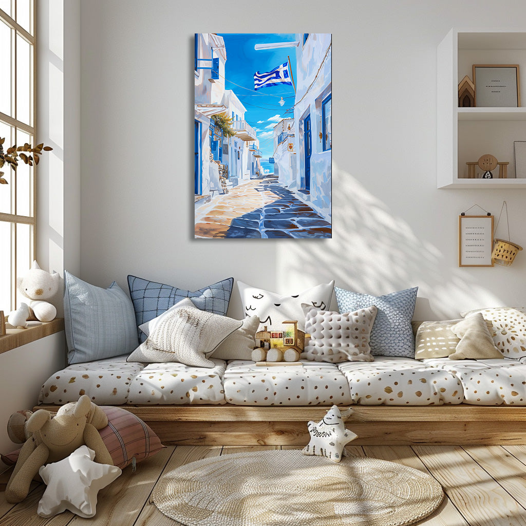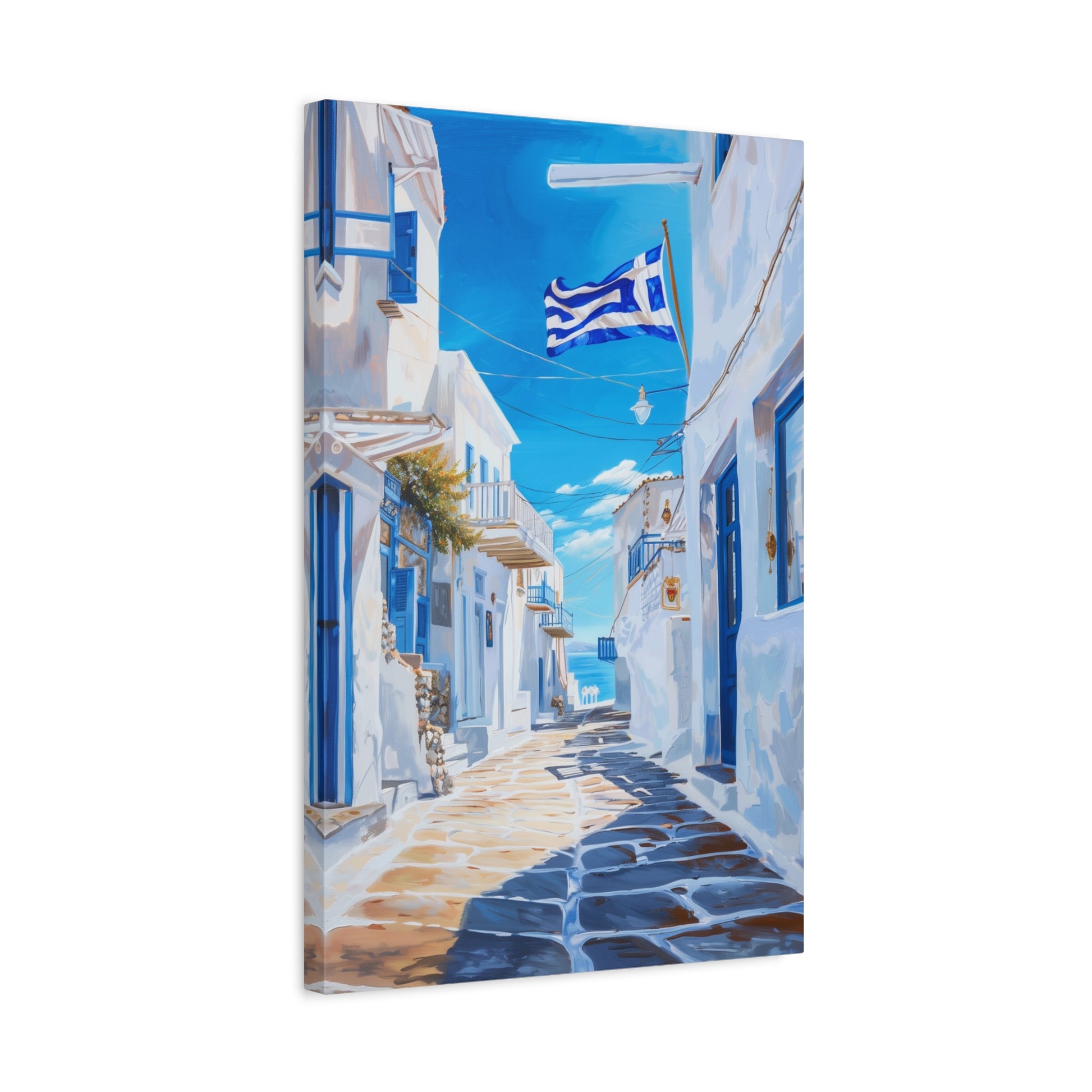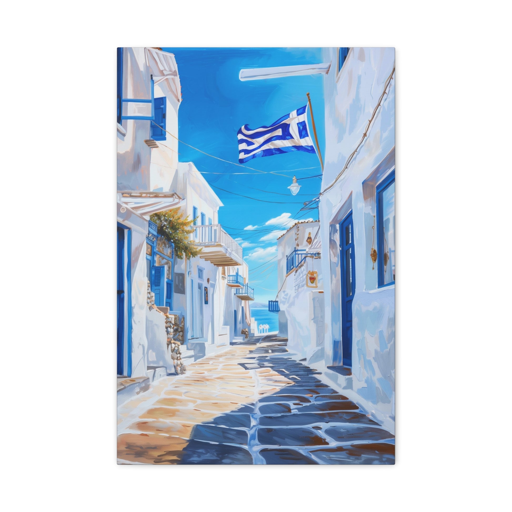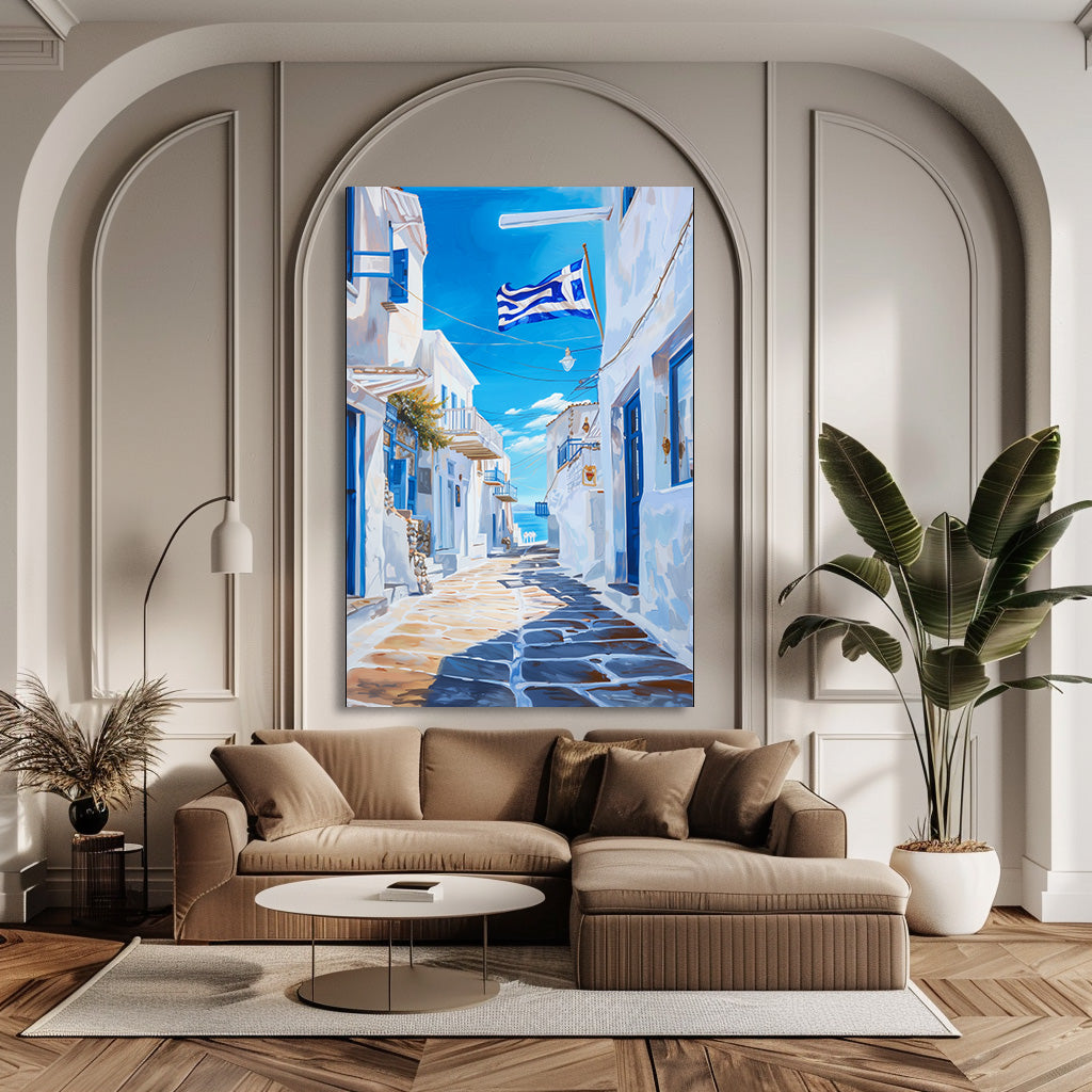 Cette œuvre capture une ruelle typique des Cyclades en Grèce, baignée de lumière et dominée par les maisons blanches aux volets bleus. Le drapeau grec flottant au-dessus des pavés renforce l’atmosphère méditerranéenne et l’évasion en bord de mer. Un tableau lumineux et intemporel, parfait pour apporter fraîcheur et charme solaire à un intérieur.