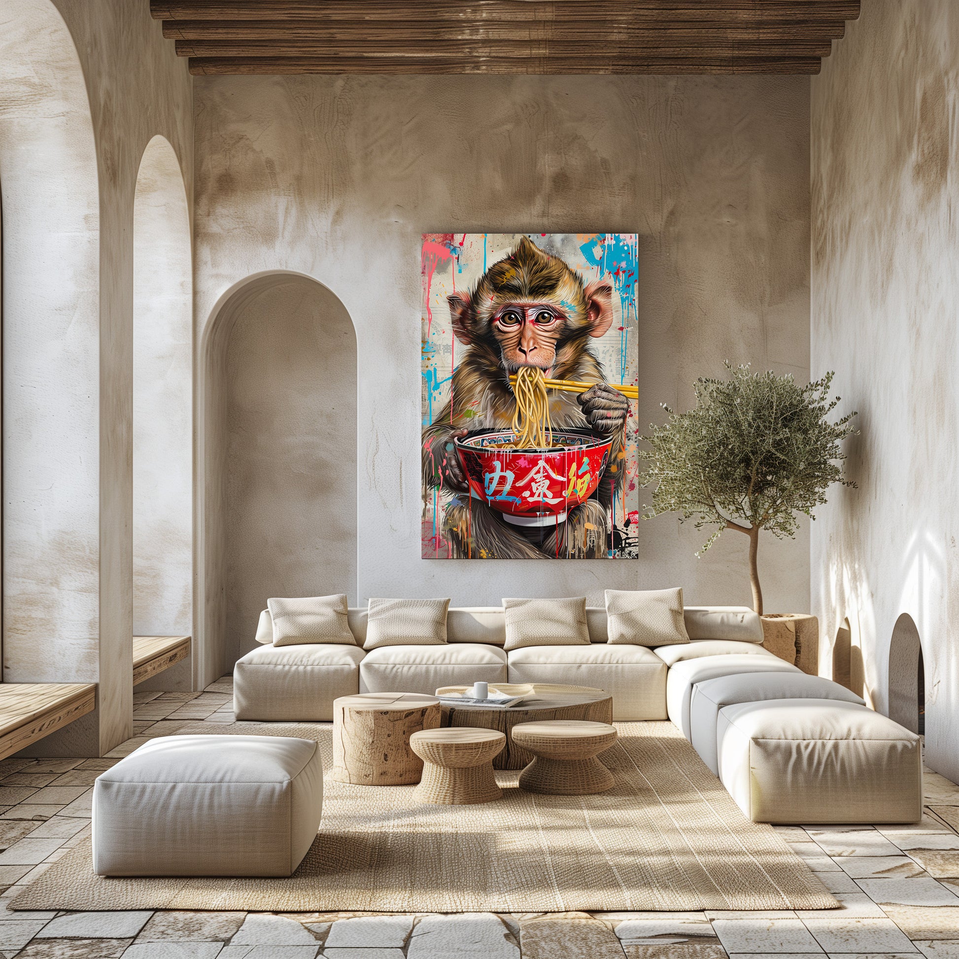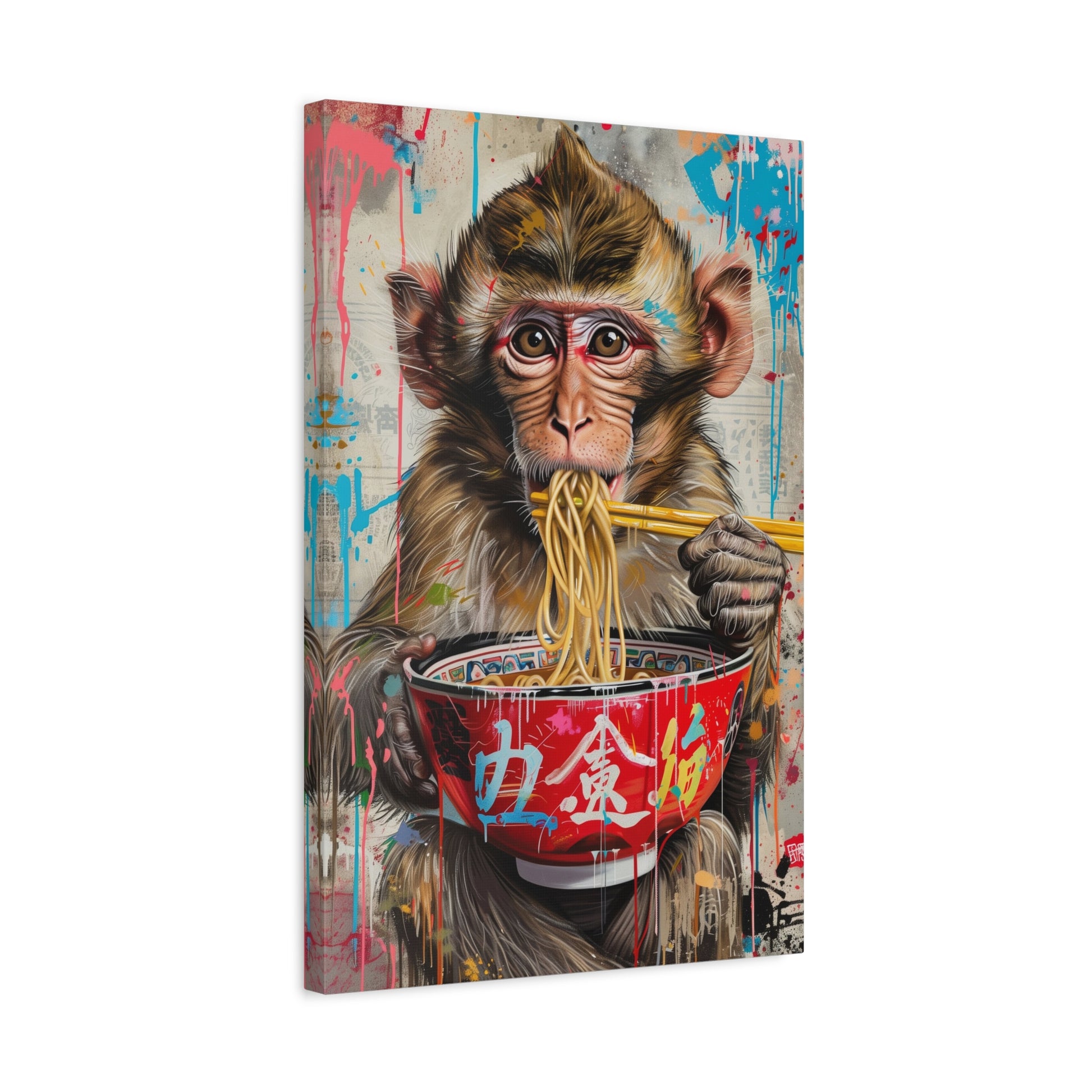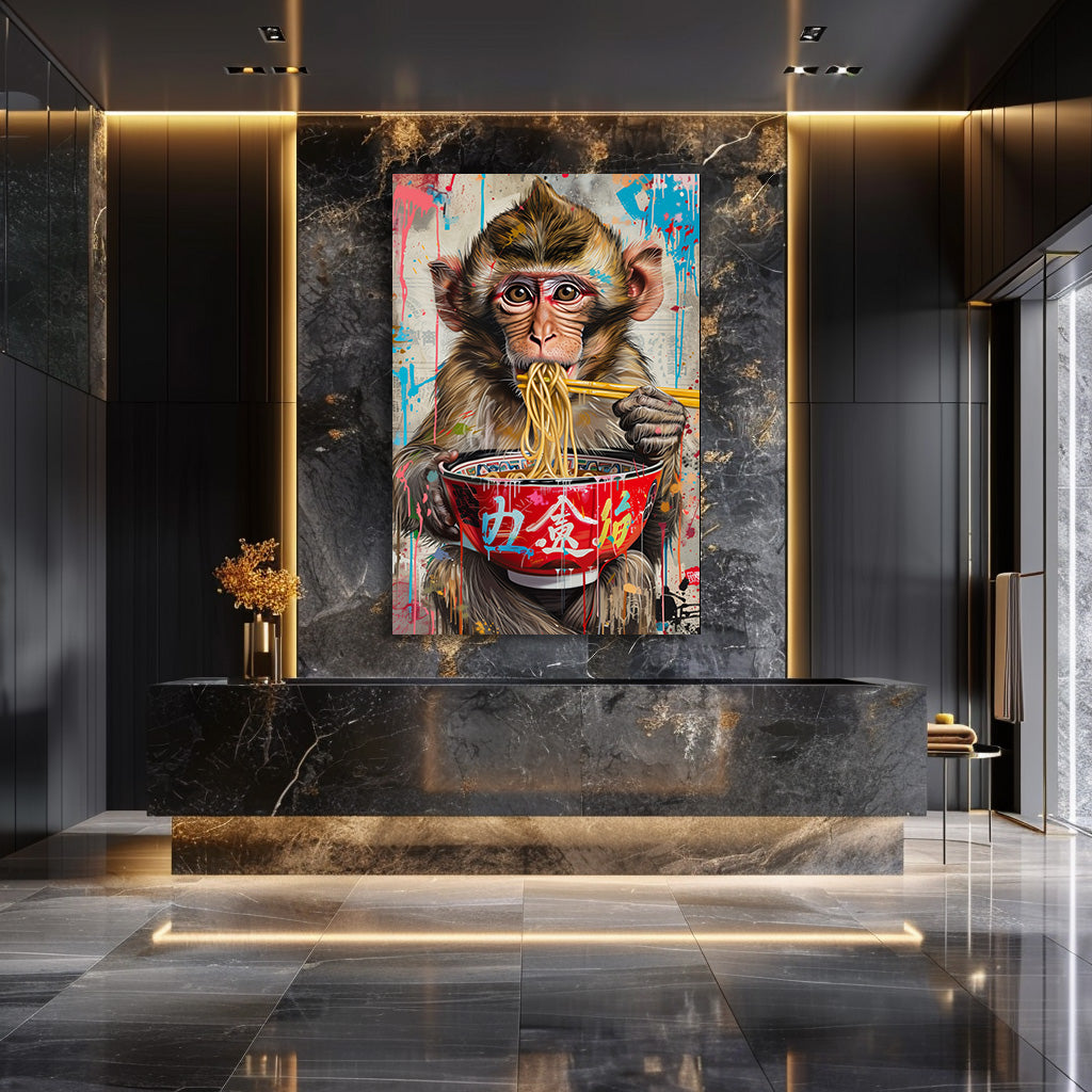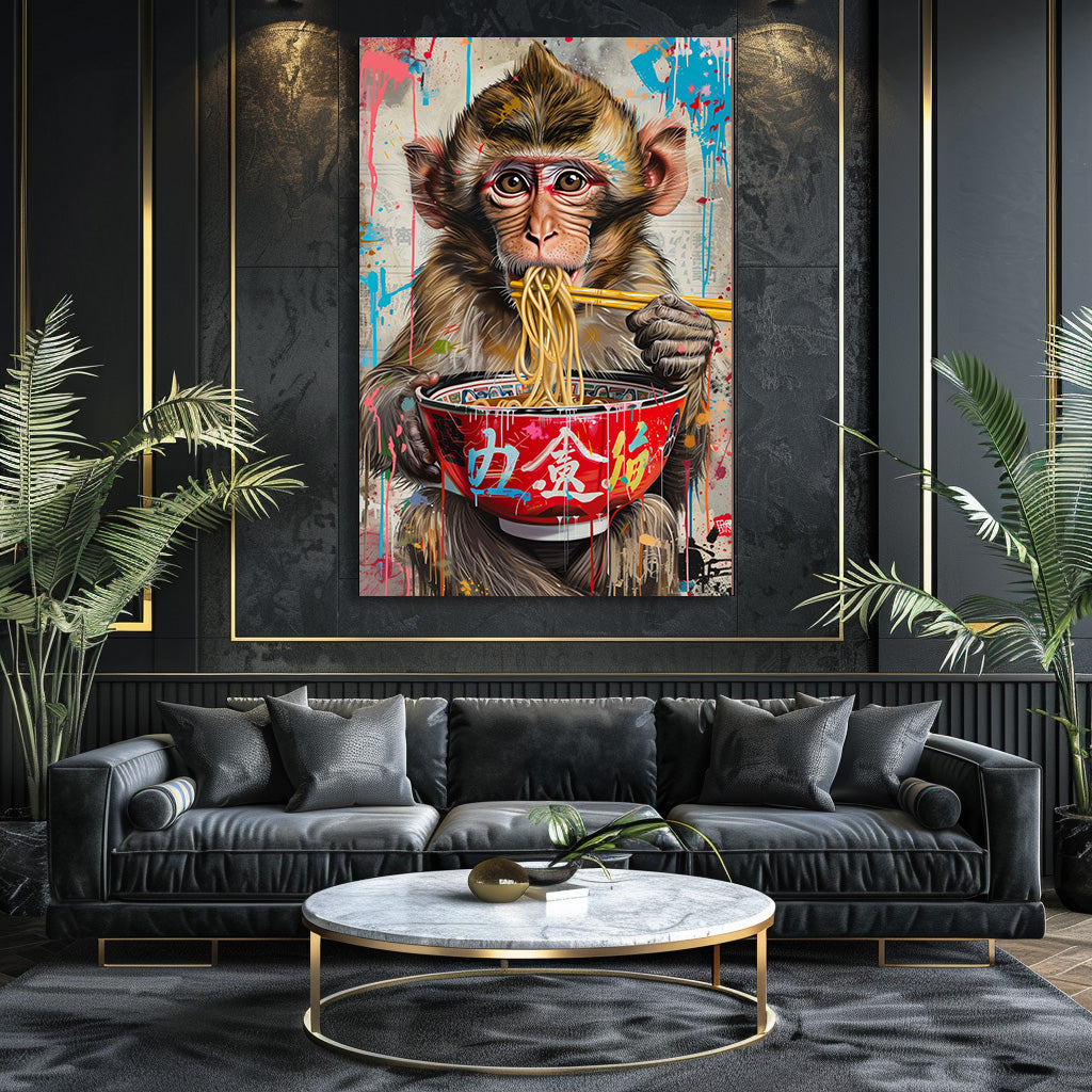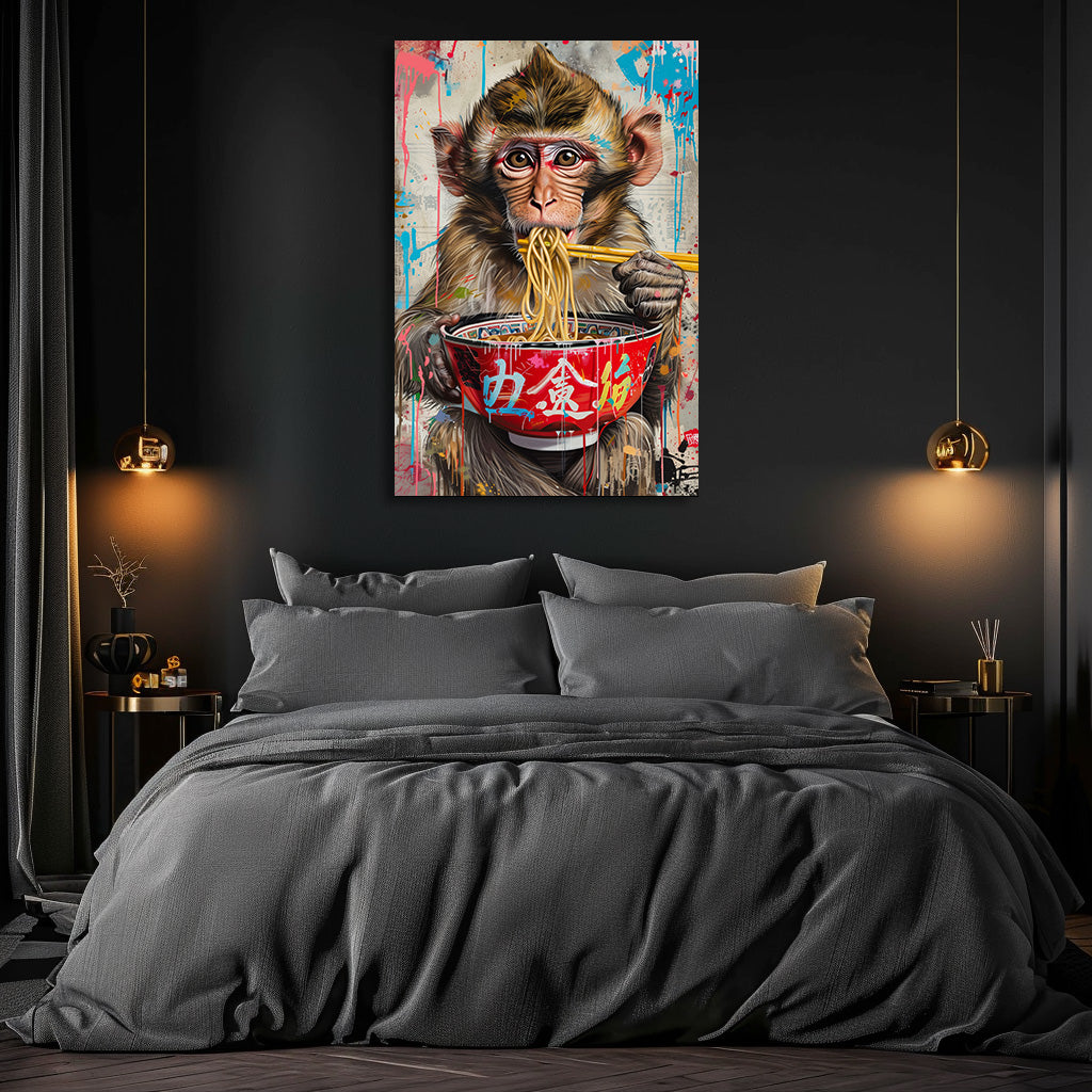 Un jeune singe savoure un bol de nouilles fumantes, entouré d’éclaboussures de peinture et de graffitis colorés. Le contraste entre l’expression adorable de l’animal et l’énergie brute du street art crée une scène amusante, moderne et ultra décorative. Un tableau vibrant, original et plein de vie, parfait pour donner du caractère à une cuisine, un salon ou un espace créatif.