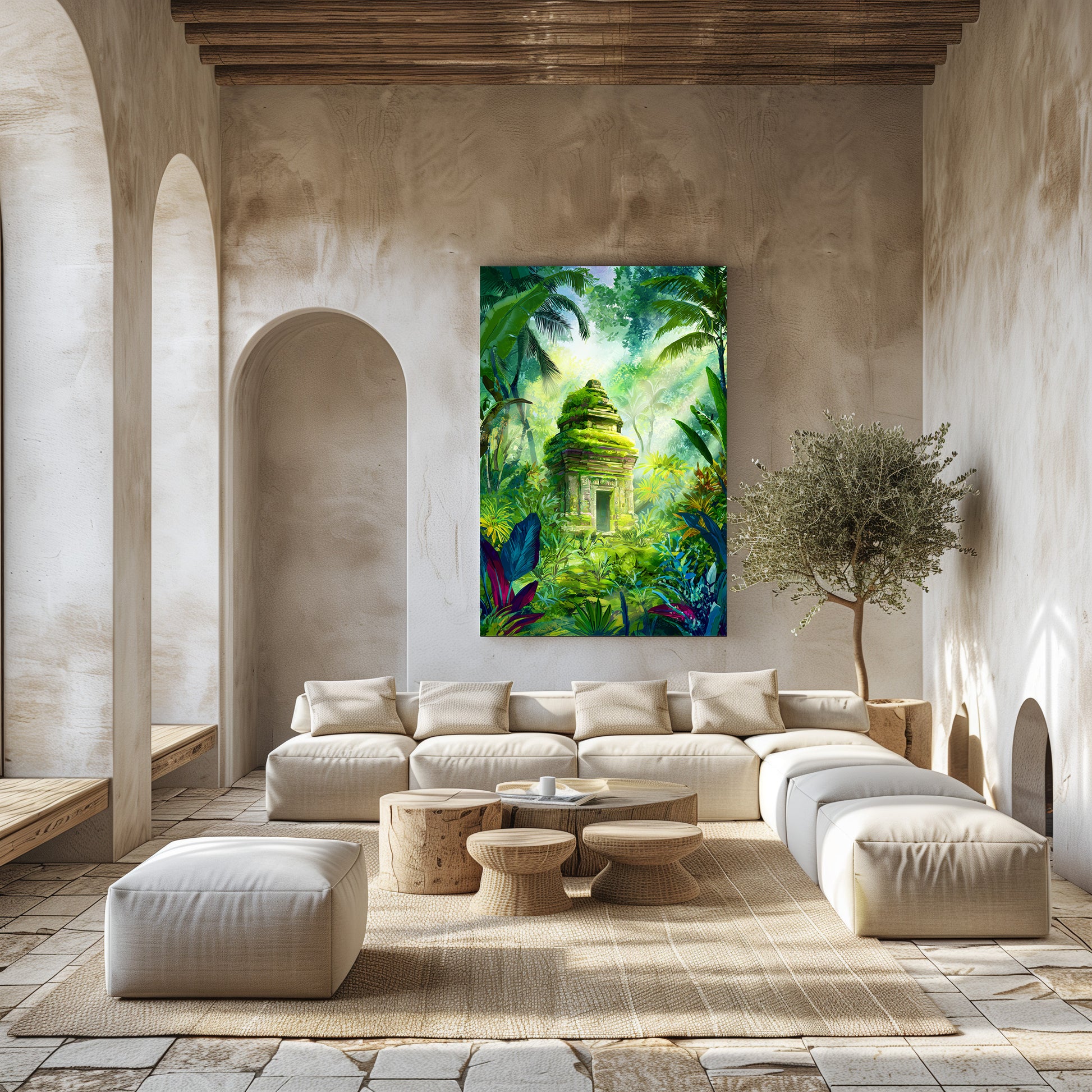 Cette œuvre envoûtante représente un ancien temple enfoui au cœur d’une jungle luxuriante. Recouvert de mousse et baigné d’une lumière douce, il semble émerger d’un autre temps. Les feuillages tropicaux, les lianes et les éclats de vert créent une atmosphère mystique, dépaysante et pleine de sérénité. Un tableau qui invite au voyage et à l’imaginaire, idéal pour apporter une touche exotique, spirituelle et immersive à votre intérieur.