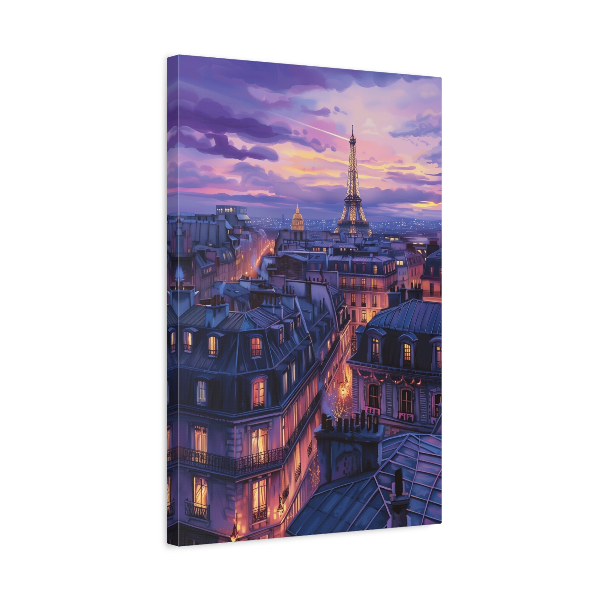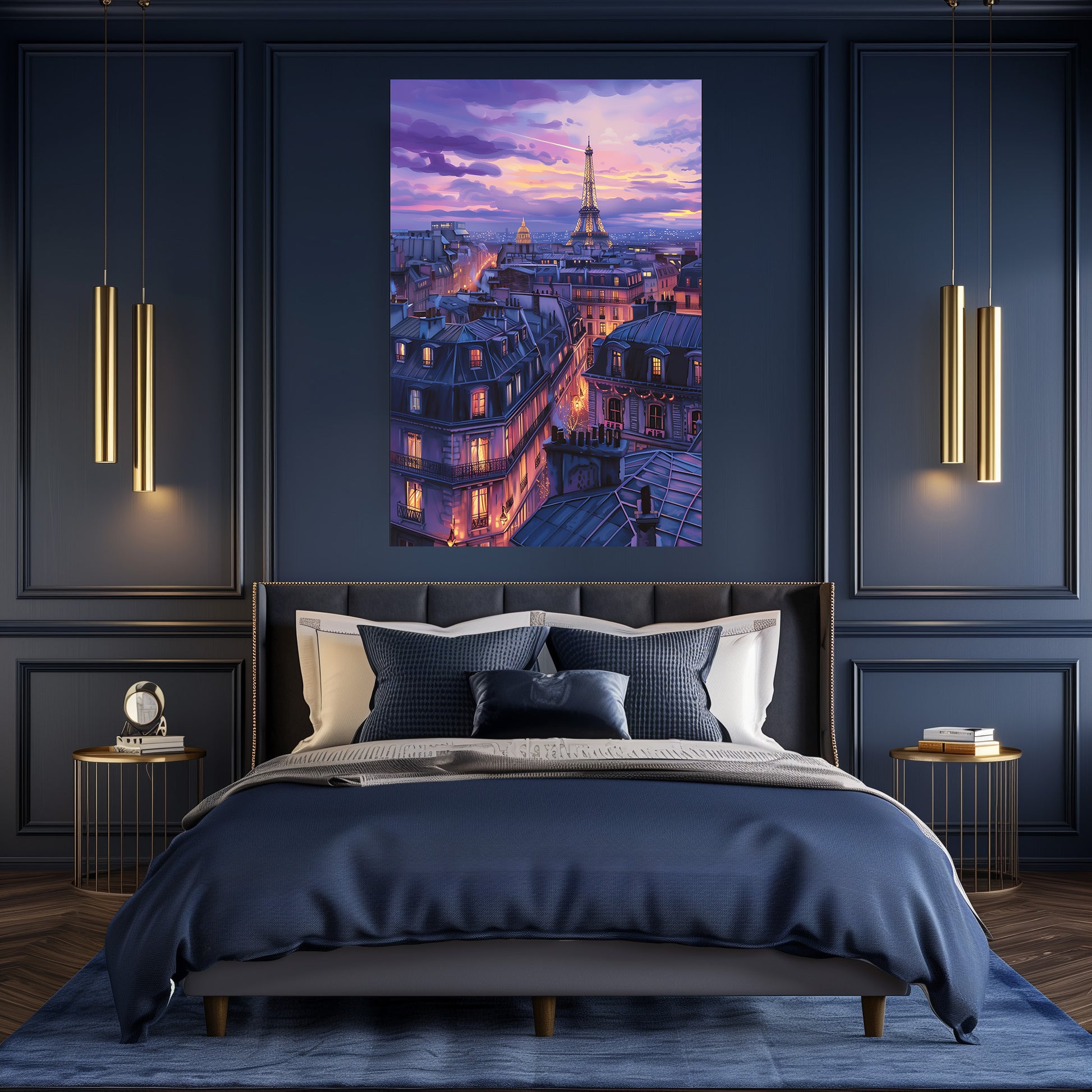 Cette œuvre capture la magie de Paris au crépuscule, avec la tour Eiffel illuminée dominant les toits haussmanniens. Les lumières chaudes et le ciel pastel créent une atmosphère romantique et élégante, invitant à la rêverie et à l’évasion.