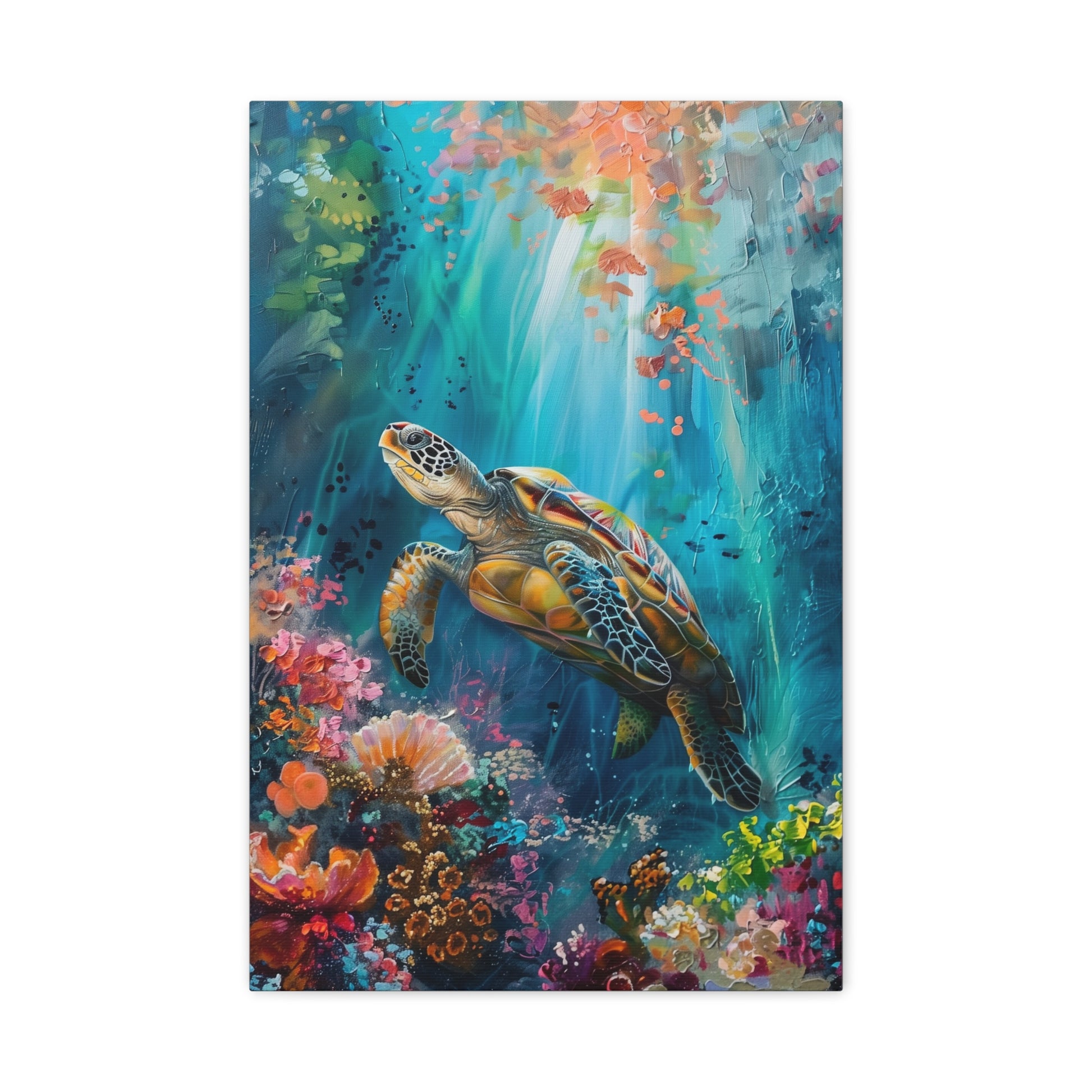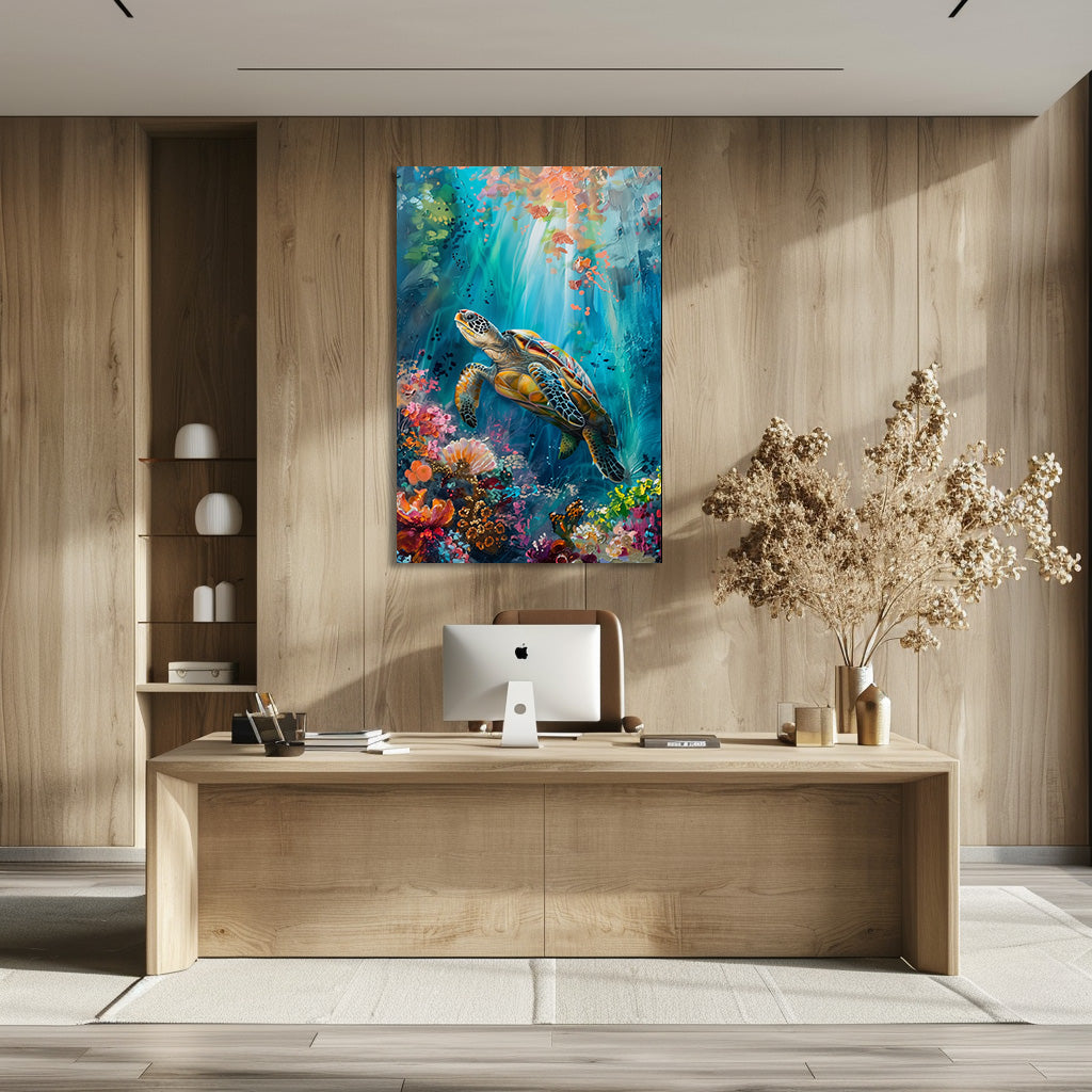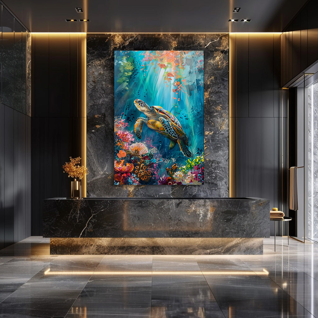 Plongée dans un décor marin riche et coloré, cette tortue semble évoluer en parfaite harmonie avec son environnement. Les détails du récif et les teintes naturelles apportent une grande douceur visuelle. L’œuvre capture un instant paisible, propice à la contemplation. Parfait pour créer une atmosphère apaisante et inspirante dans votre intérieur.